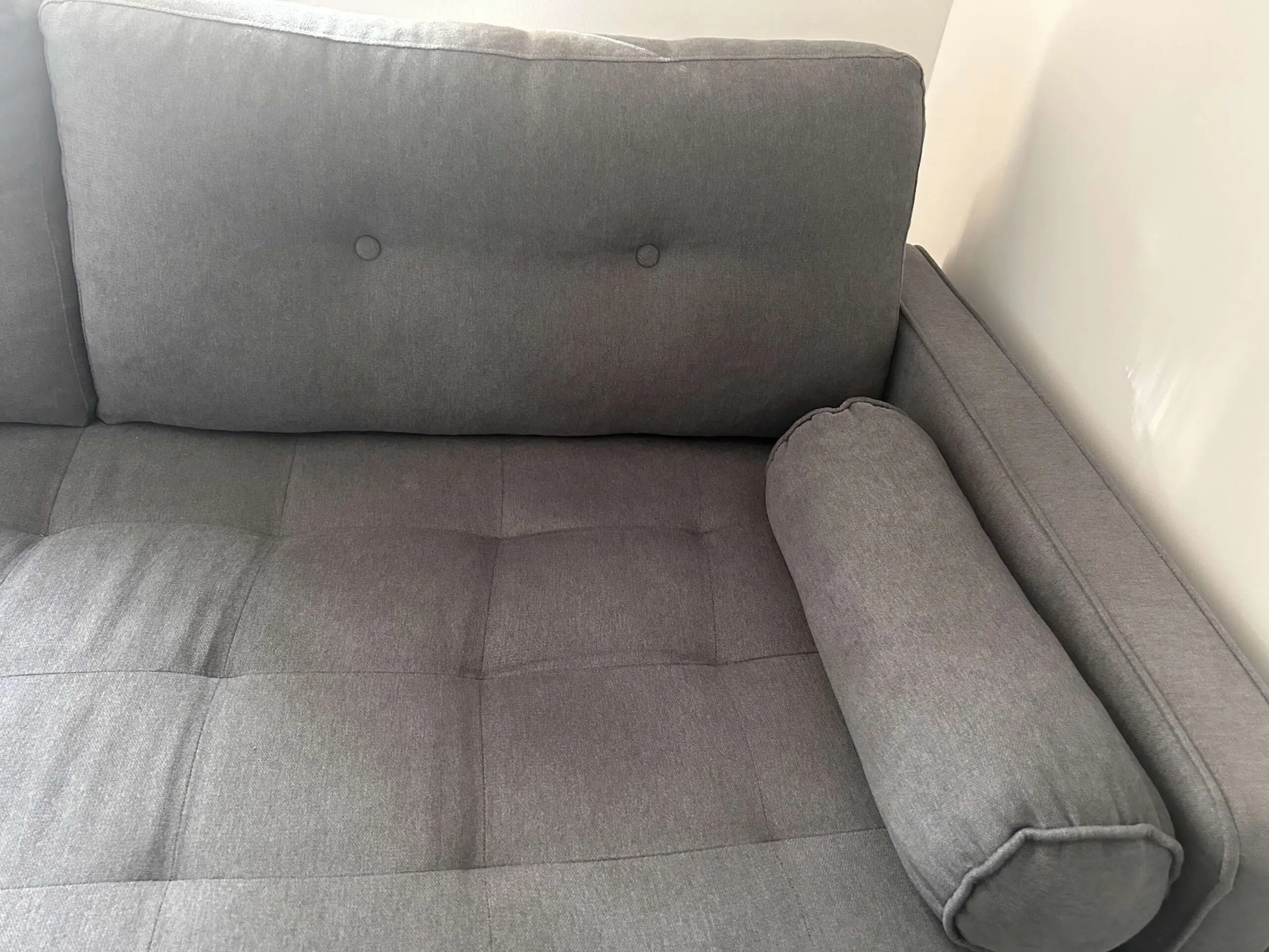 Minimally used, single owner, with 2 working adults only, available for sale right away. High button back, wooden feet and included cylindrical toss pillows. Comfortable, placed, in any room.