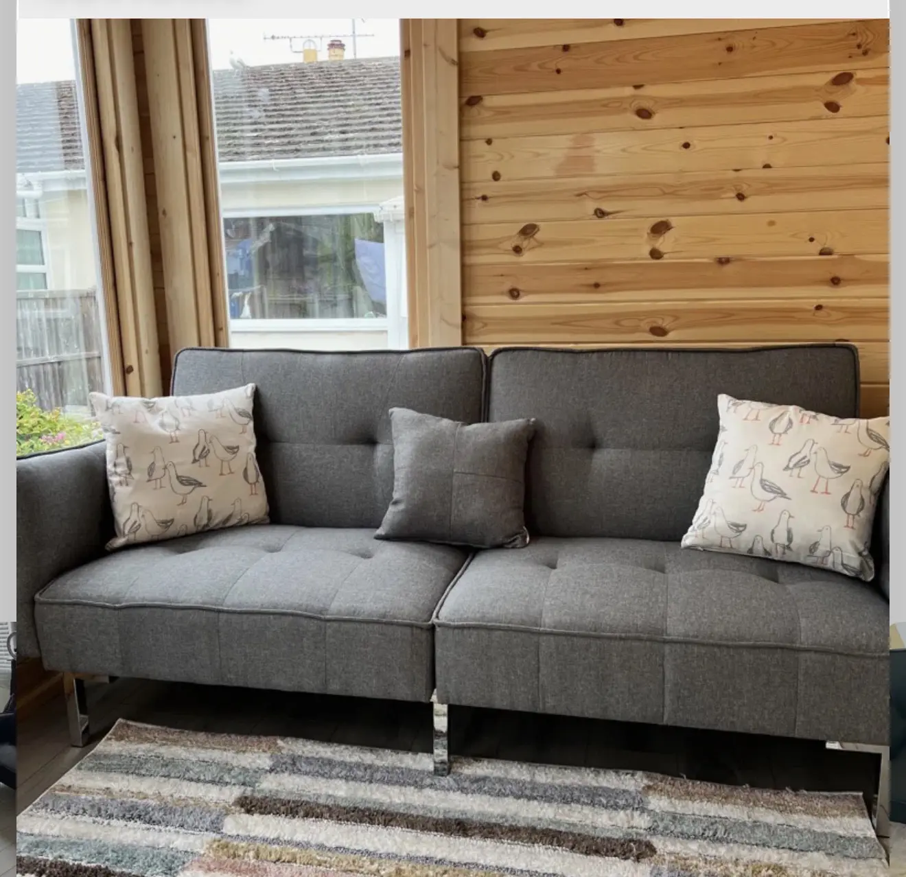 This stylish 2-seater sofa features a contemporary design with sleek chrome legs and attractive button detailing on the seat cushions. The clean lines and modern aesthetic make it perfect for smaller living spaces or as additional seating in larger rooms. The sofa comes with coordinating cushions and sits on sturdy metal legs that give it a light, airy appearance. Its compact size and neutral tone make it versatile enough to complement various interior styles from Scandinavian to contemporary.