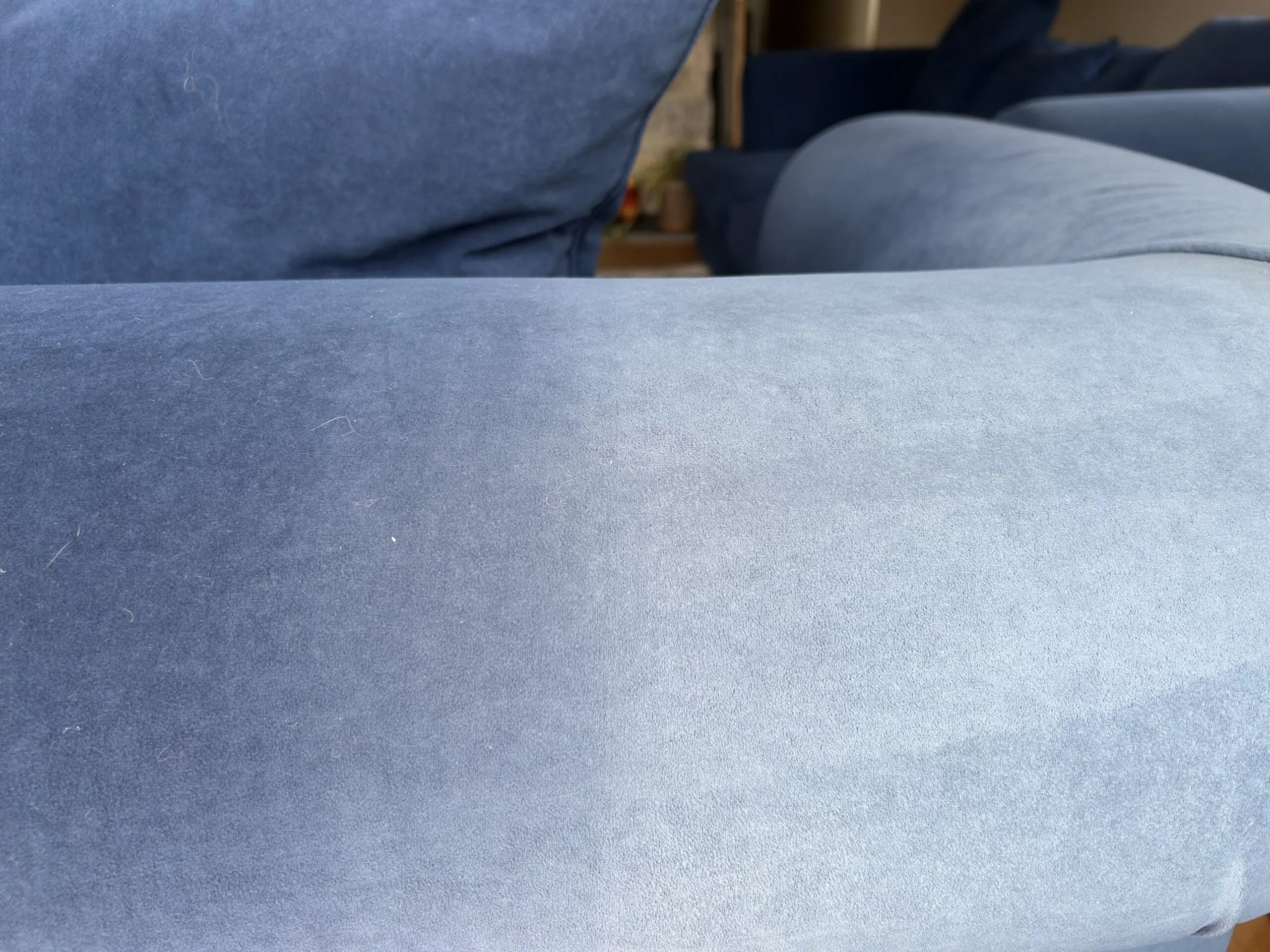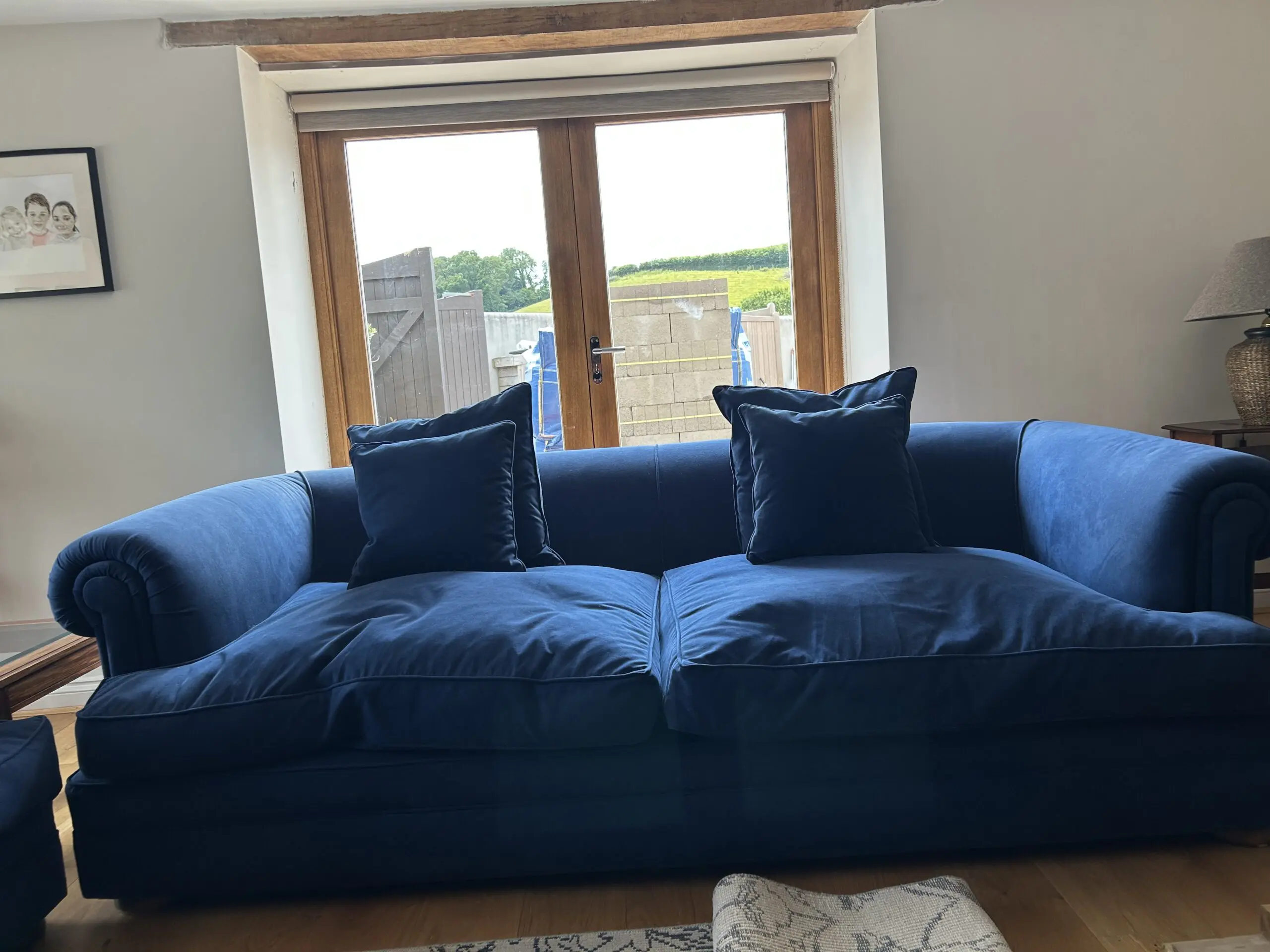 Will sell separately at £750 each Short hair velvet sofas. Professionally recovered 3years ago. Hardly used since as in 2nd sitting room. Feather seating cushions. Rounded arms and back. Some fading on back from sunshine but not really noticeable. ( see photo- from a throw positioned on them so easily coverable with throw. Very Slight fade on arms but not noticeable to rest of settee. Otherwise in virtually new condition as recovered. Frames in perfect condition. Matching cushion covers for each settee included.