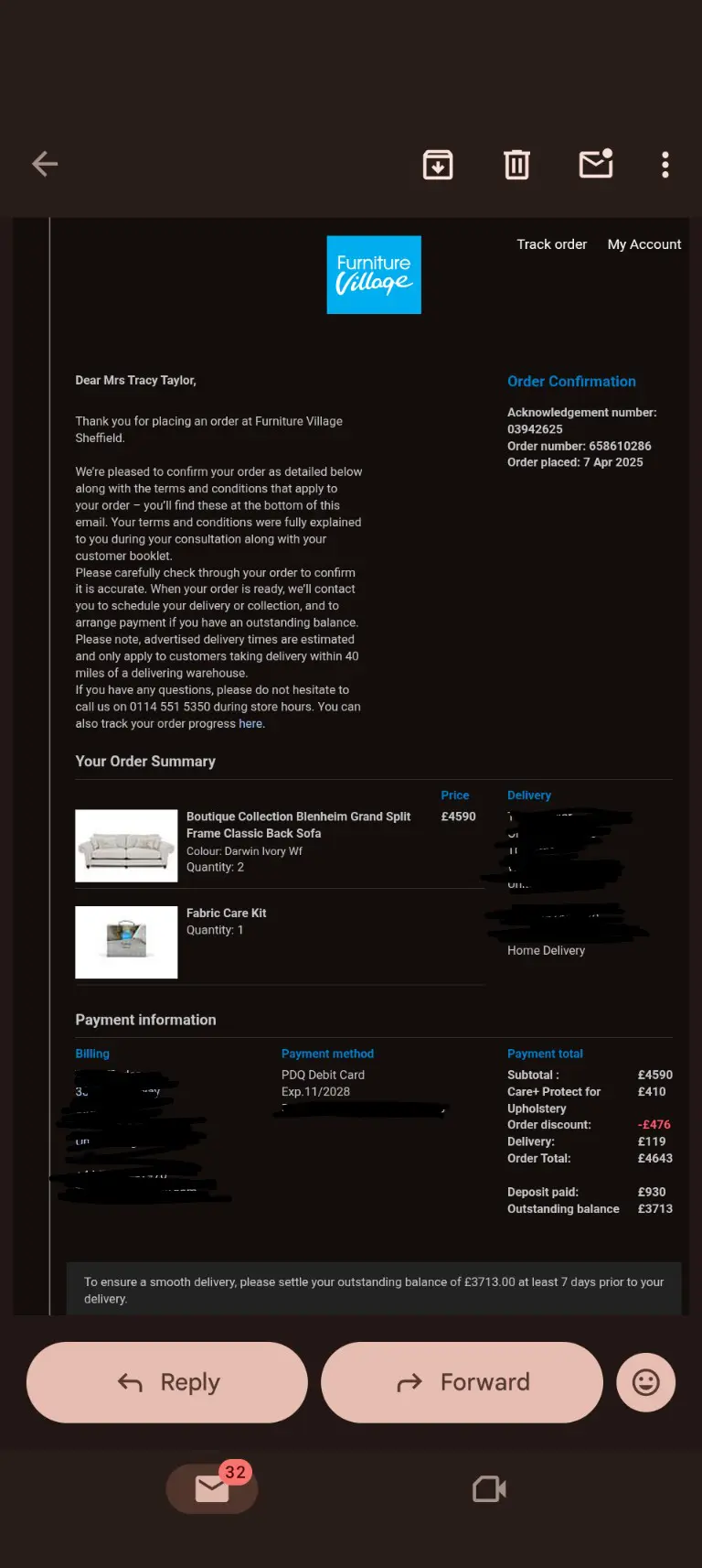 From start to finish this company was amazing. We were unsure about choosing online without trying first so took a chance. We are thrilled with our choice . Delivery was great was in touch with sofalistic all the way. They were fabulous thank you