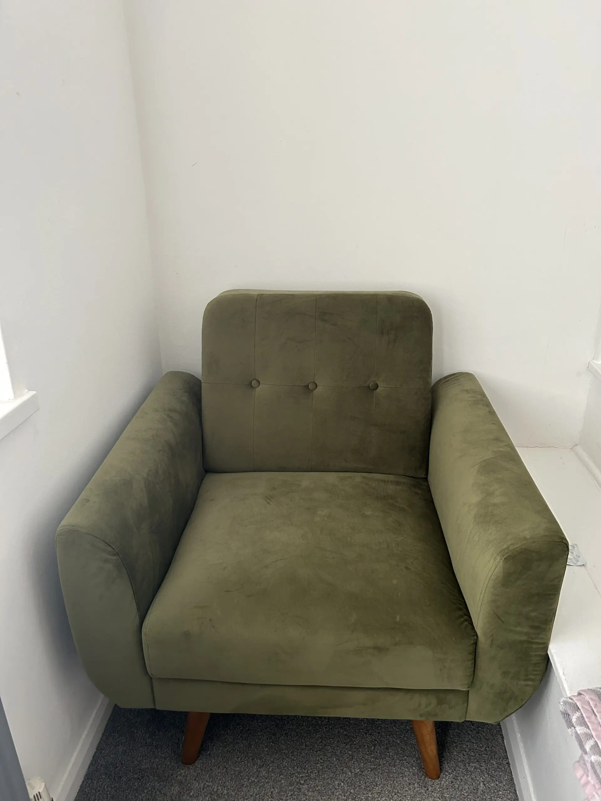 4 seater click clack sofa bed and arm chair in olive green velvet colour. Like new rarely used.