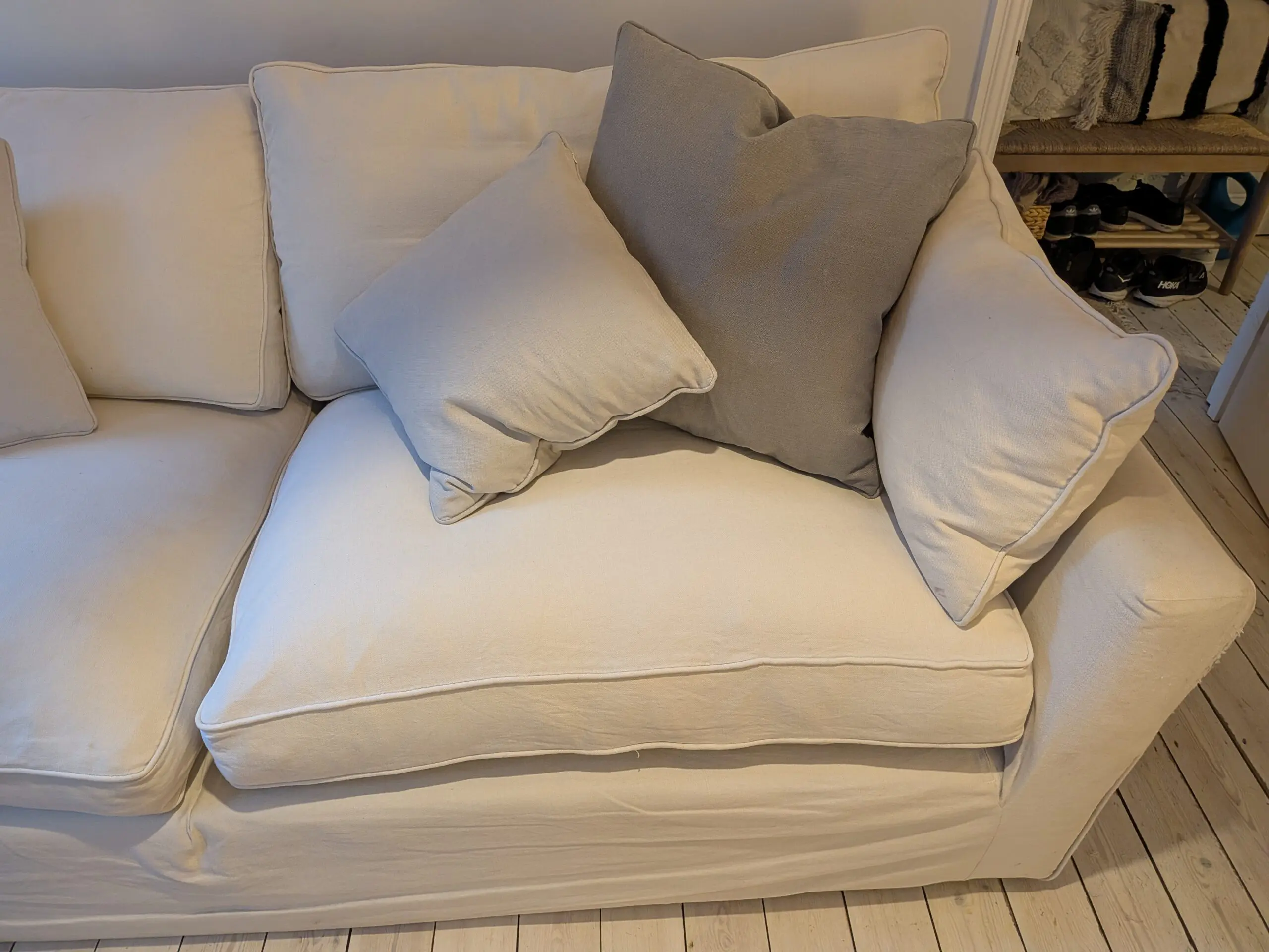 4 seater sofa, with a pull out double bed, removable cover and can be separated in two for easy transport. Feather filled cushions. Good condition overall, but one arm has been effected by some clawing from a cat. Additional cushions with it x 6 (shades of grey)