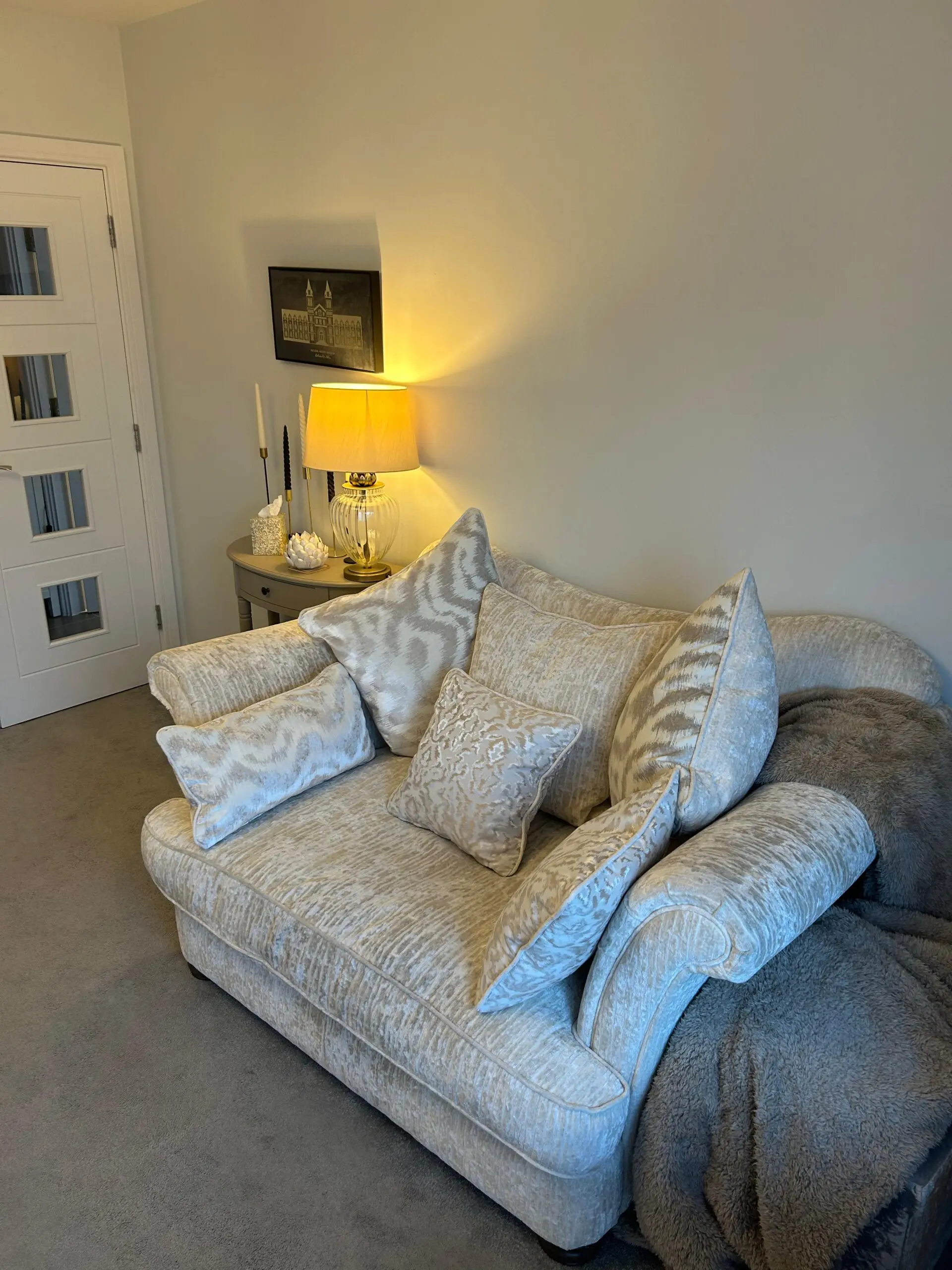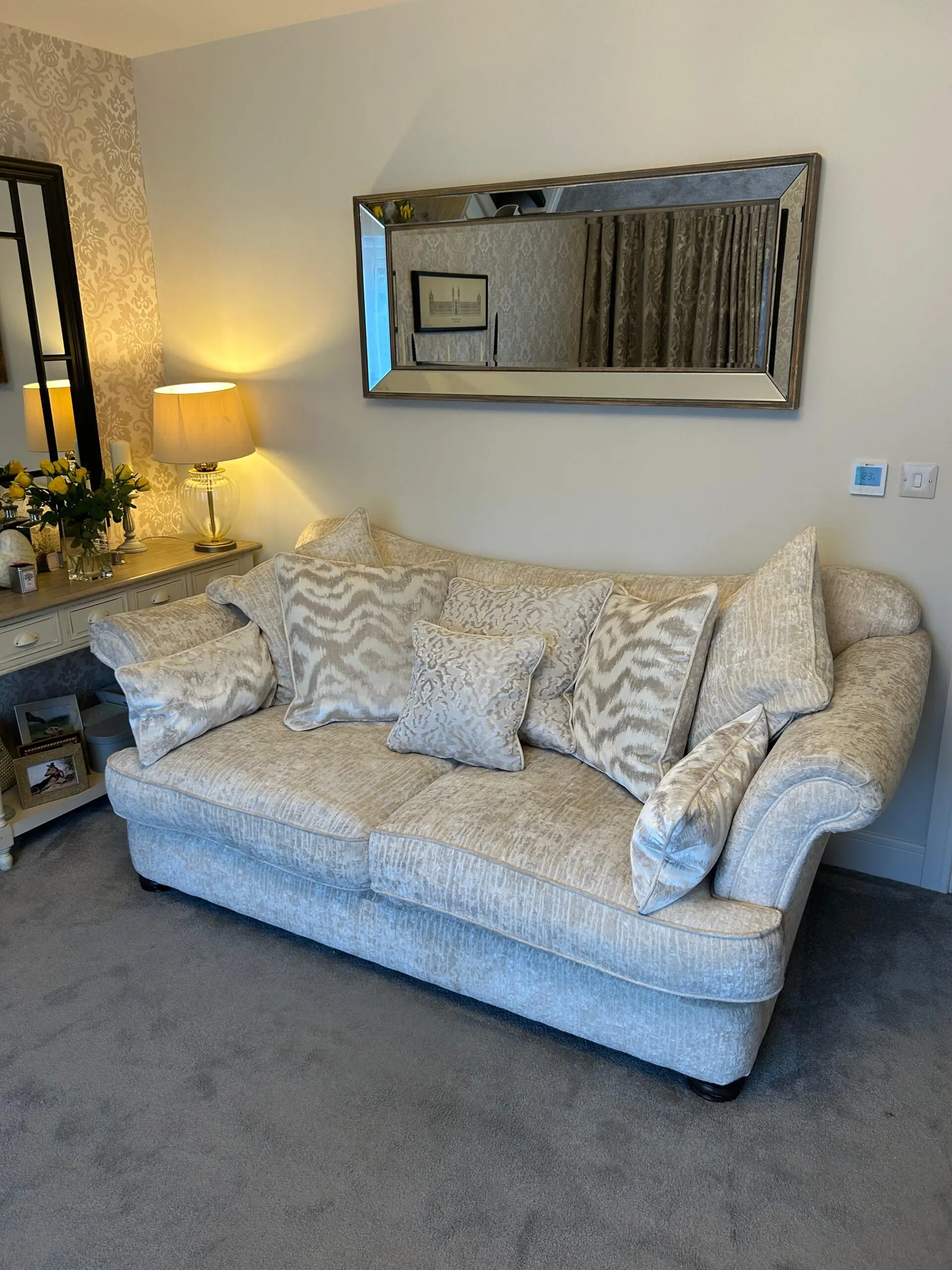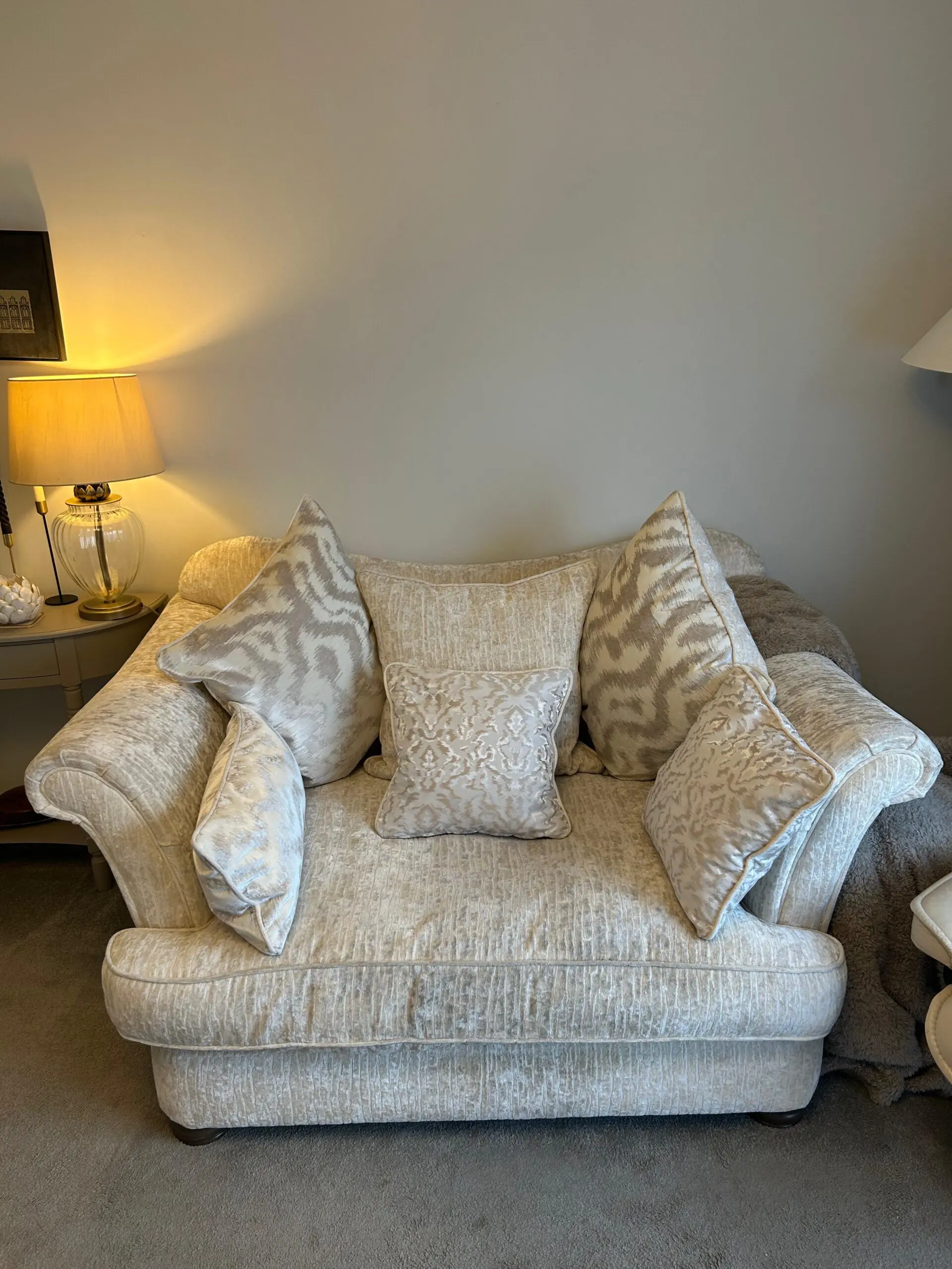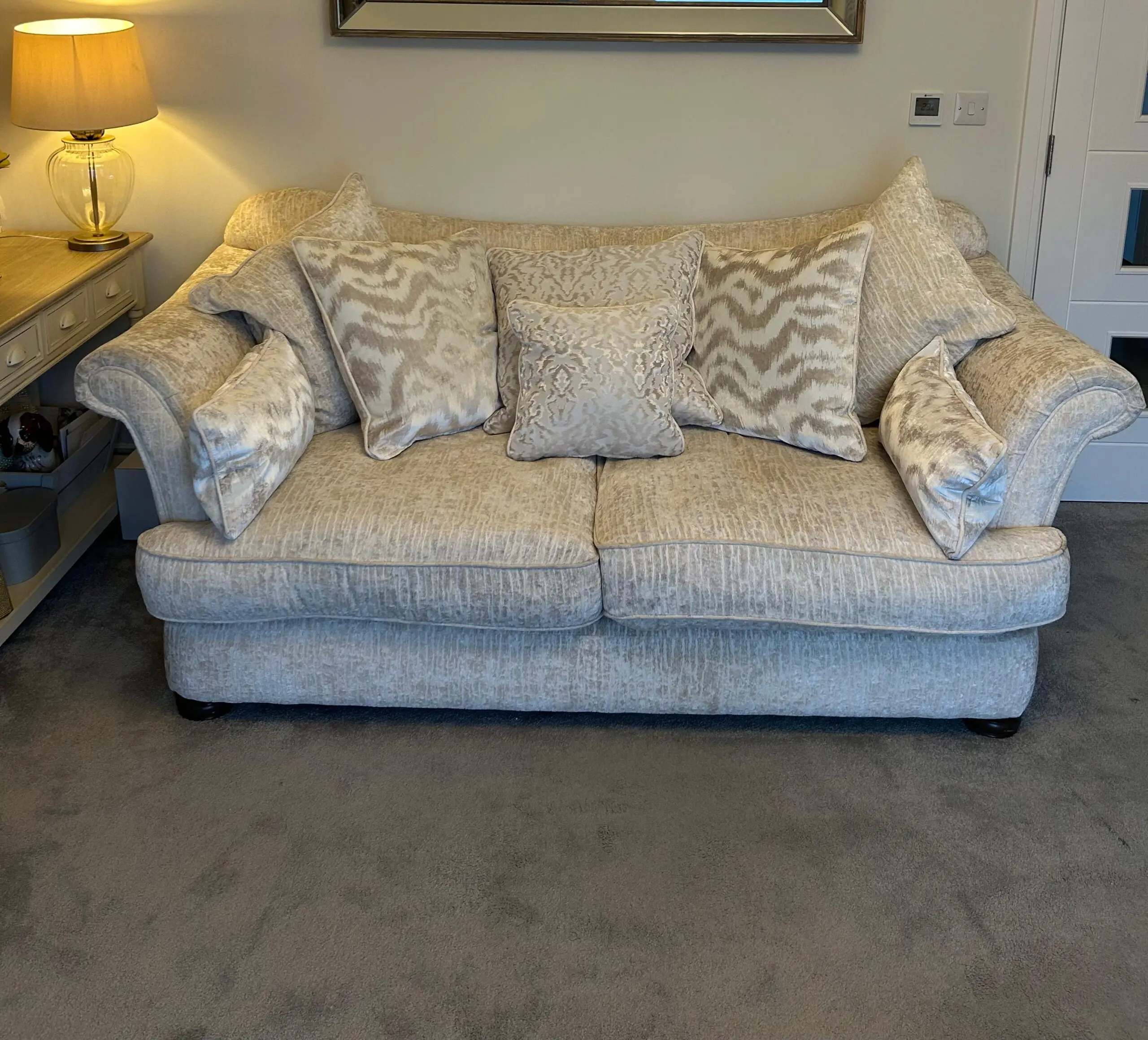 This lovely matching set was bought originally from Sofology so very sturdy. It is 6 years old & from a clean new home with one resident cat. but both sofas have been covered by throws. It is a great neutral colour scheme, cream & linen which goes well with my pale grey carpet & walls.