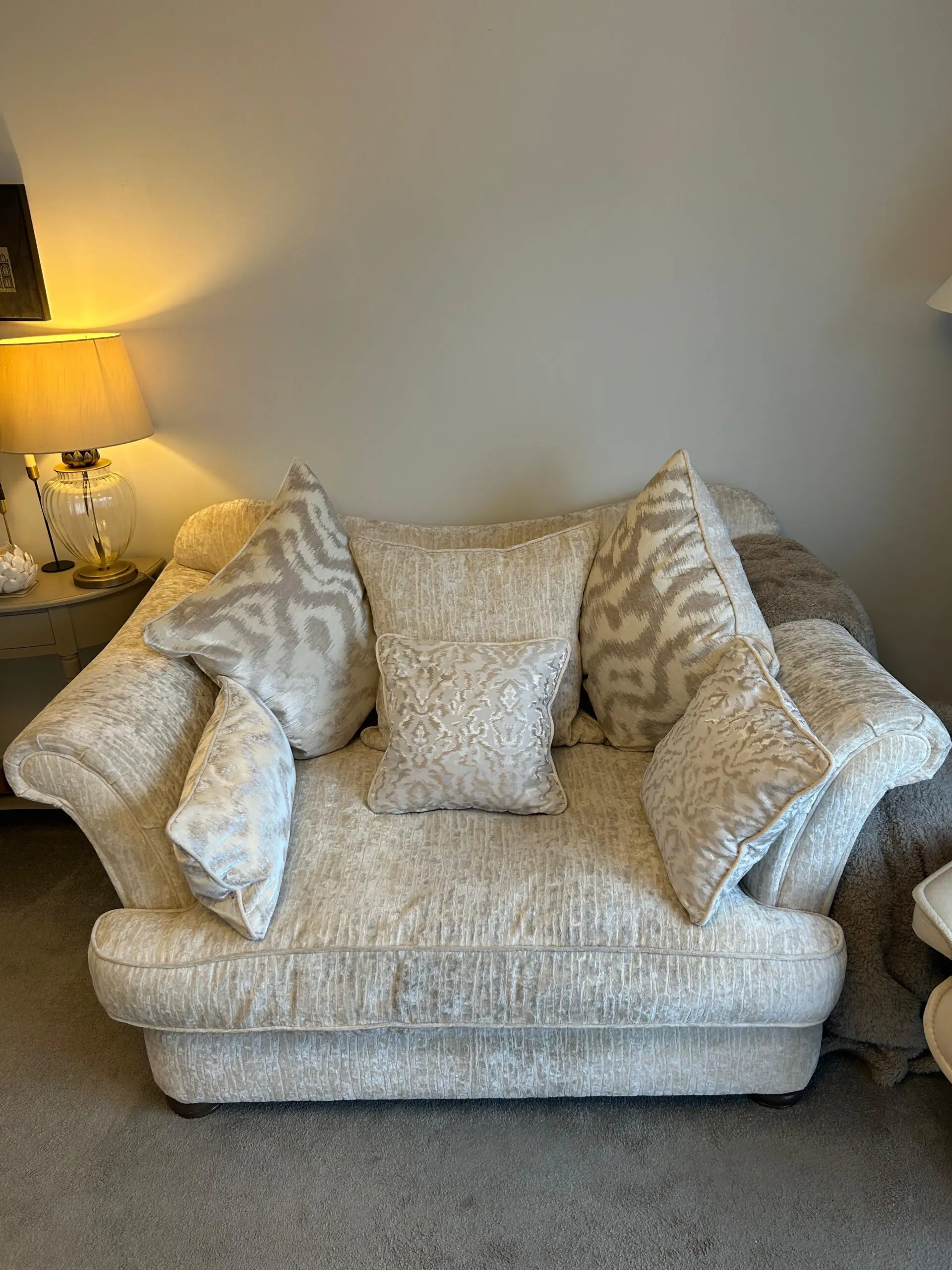 The Love Seat can easily seat 2 people. All the scatterback cushions are included. It has been professionally steam cleaned in recent years & I since found that all the cushion covers are washable at low temperature or hand wash. It has no stains or marks just a little wear on the seat cushions. I am willing to sell either one separately. £400 for the 4 seater & £200 for the 2 seater.