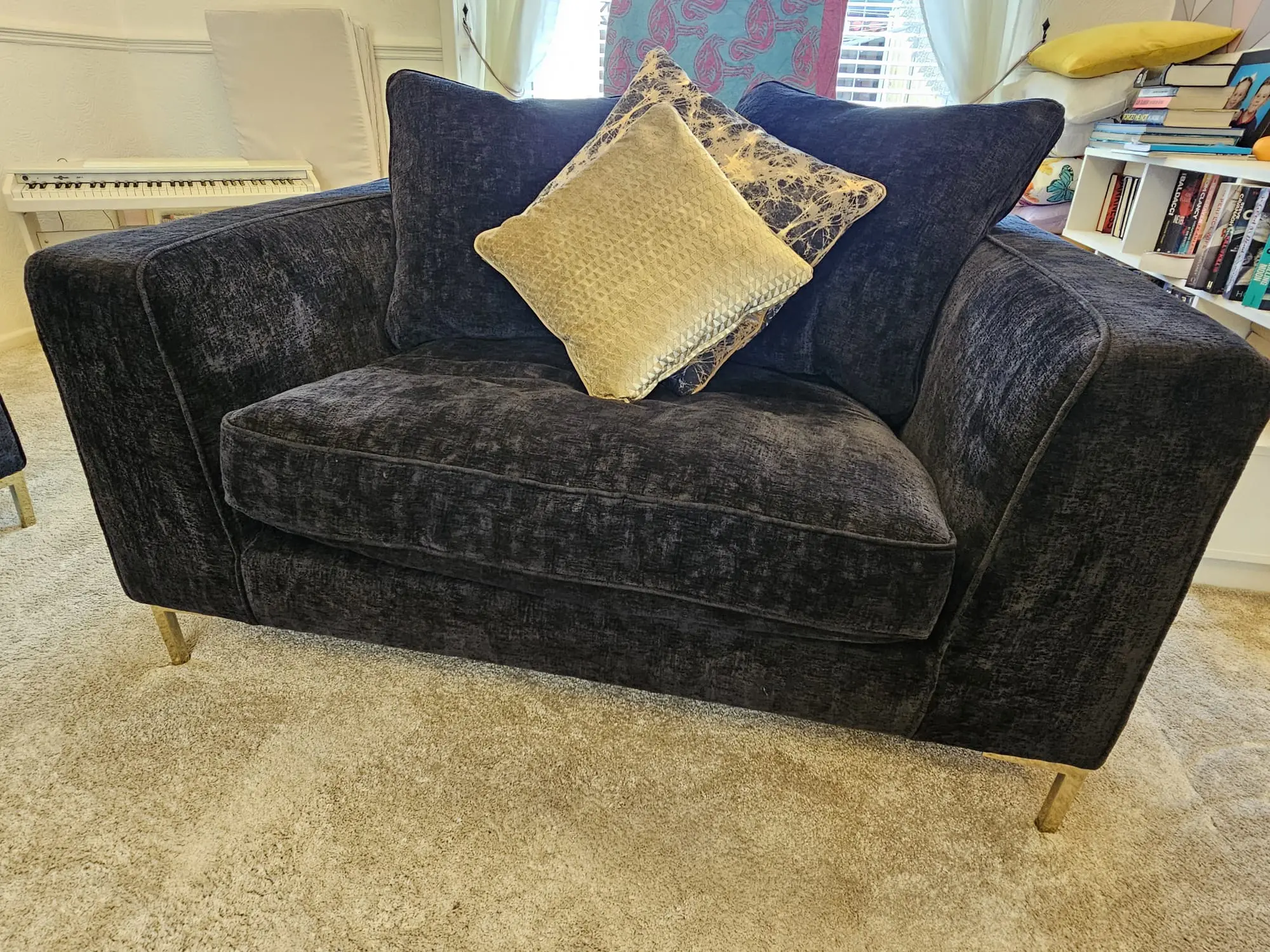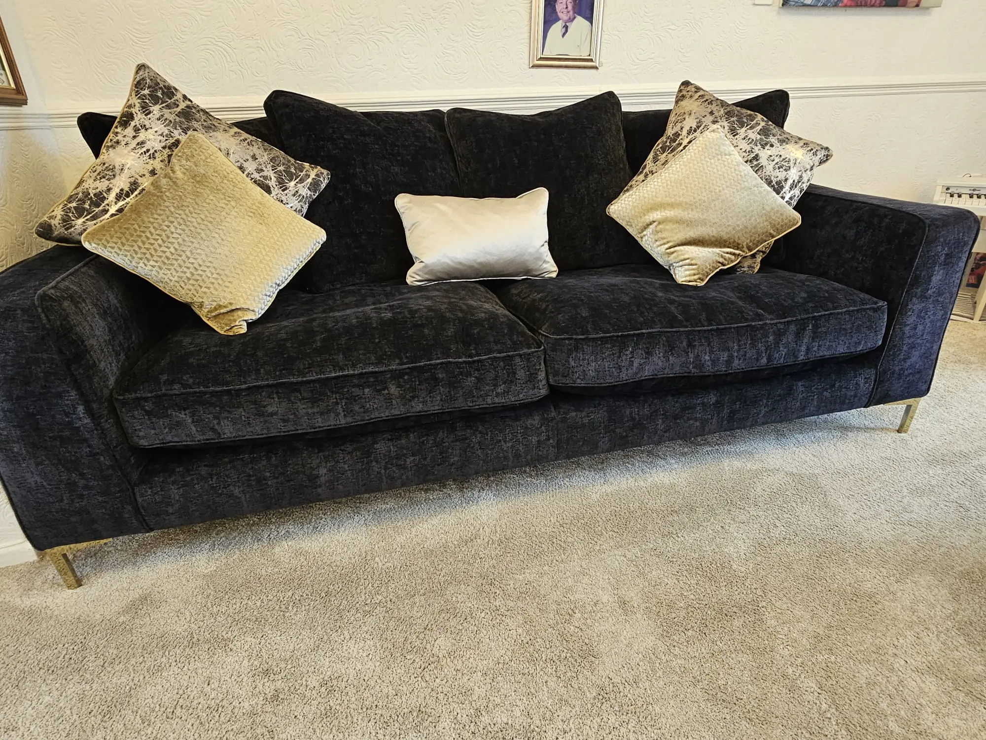Black 4 seater settee and large Cuddle chair looks like a 2 seater settee with gold legs comes with gold cushions and cleaning kit