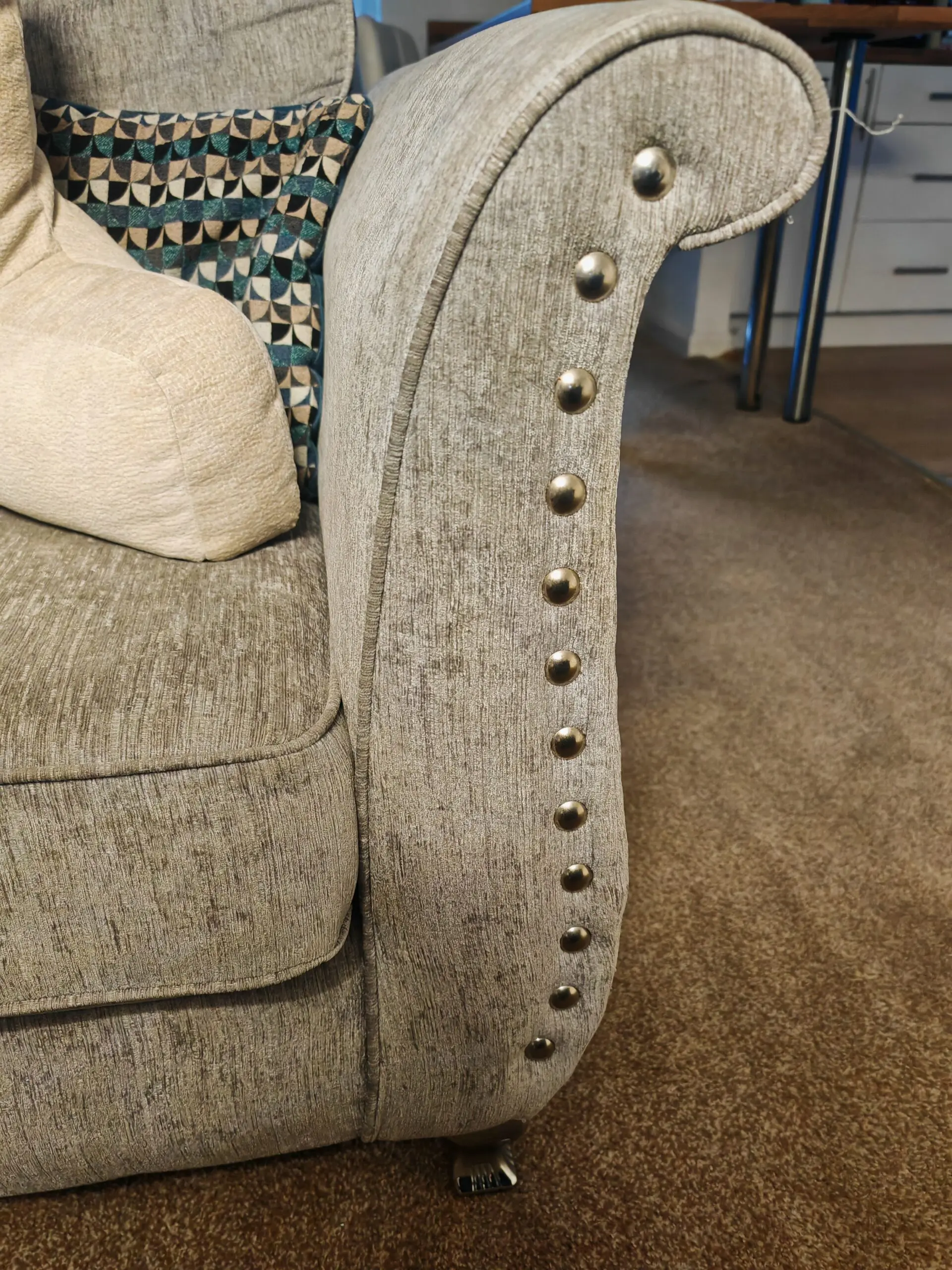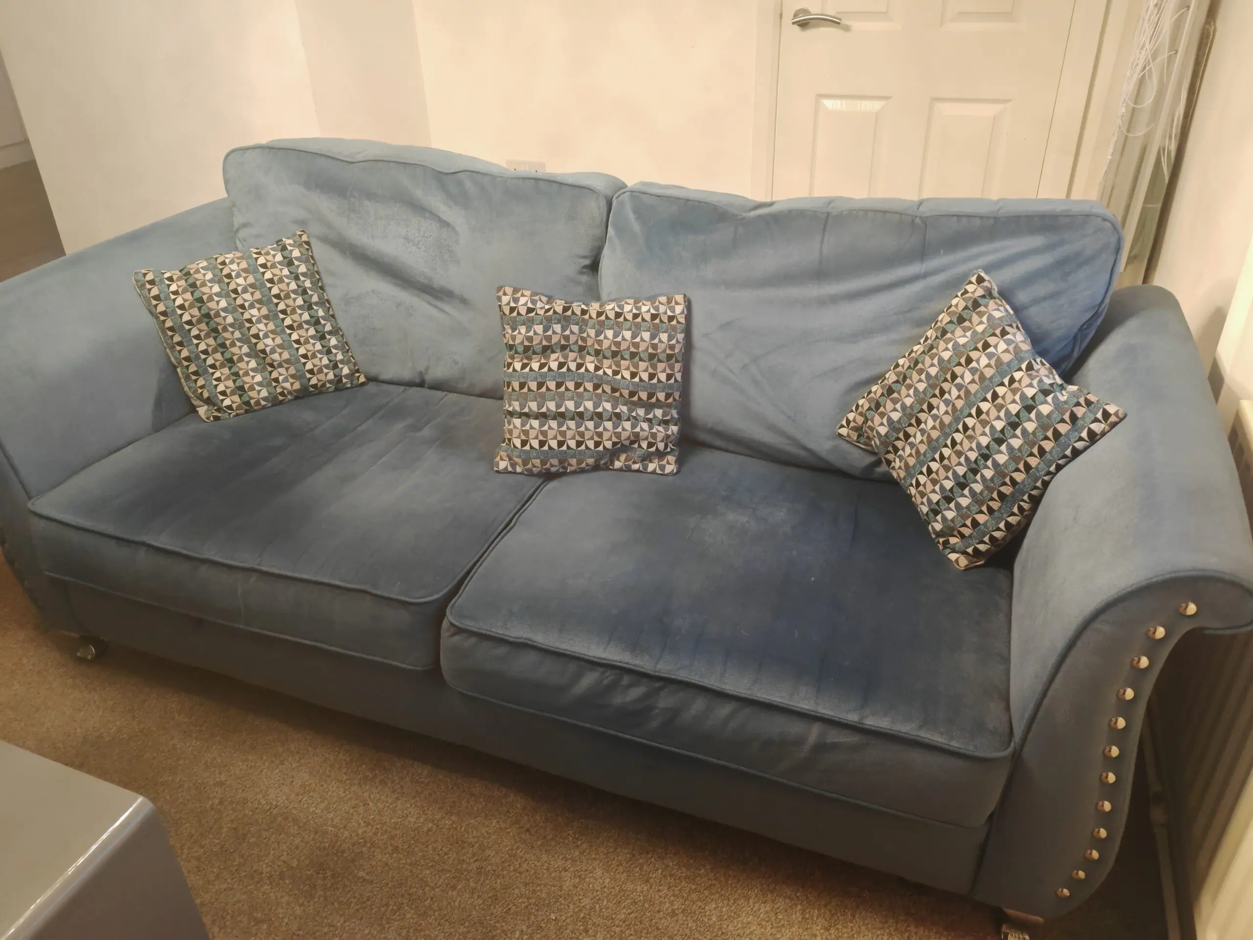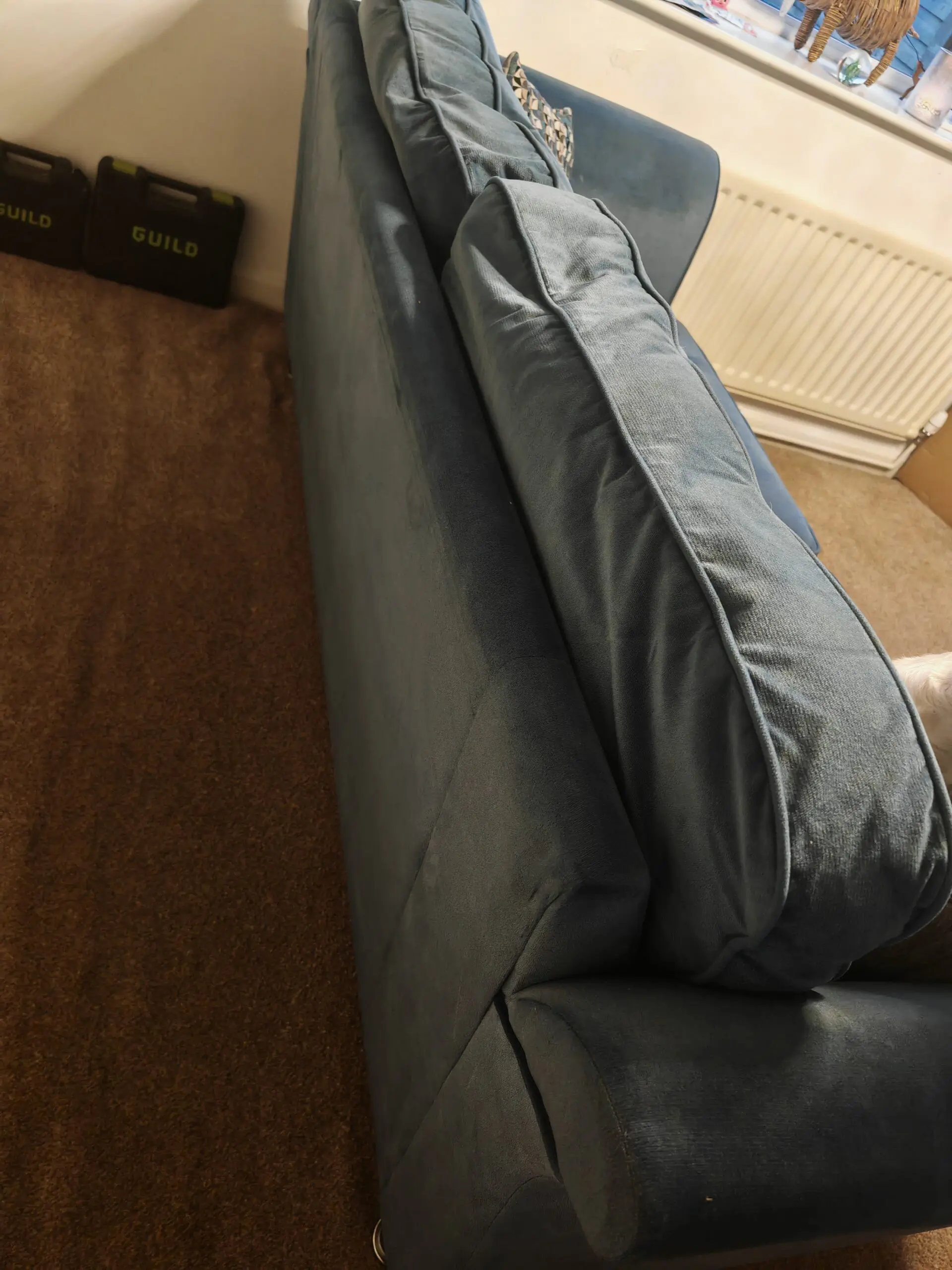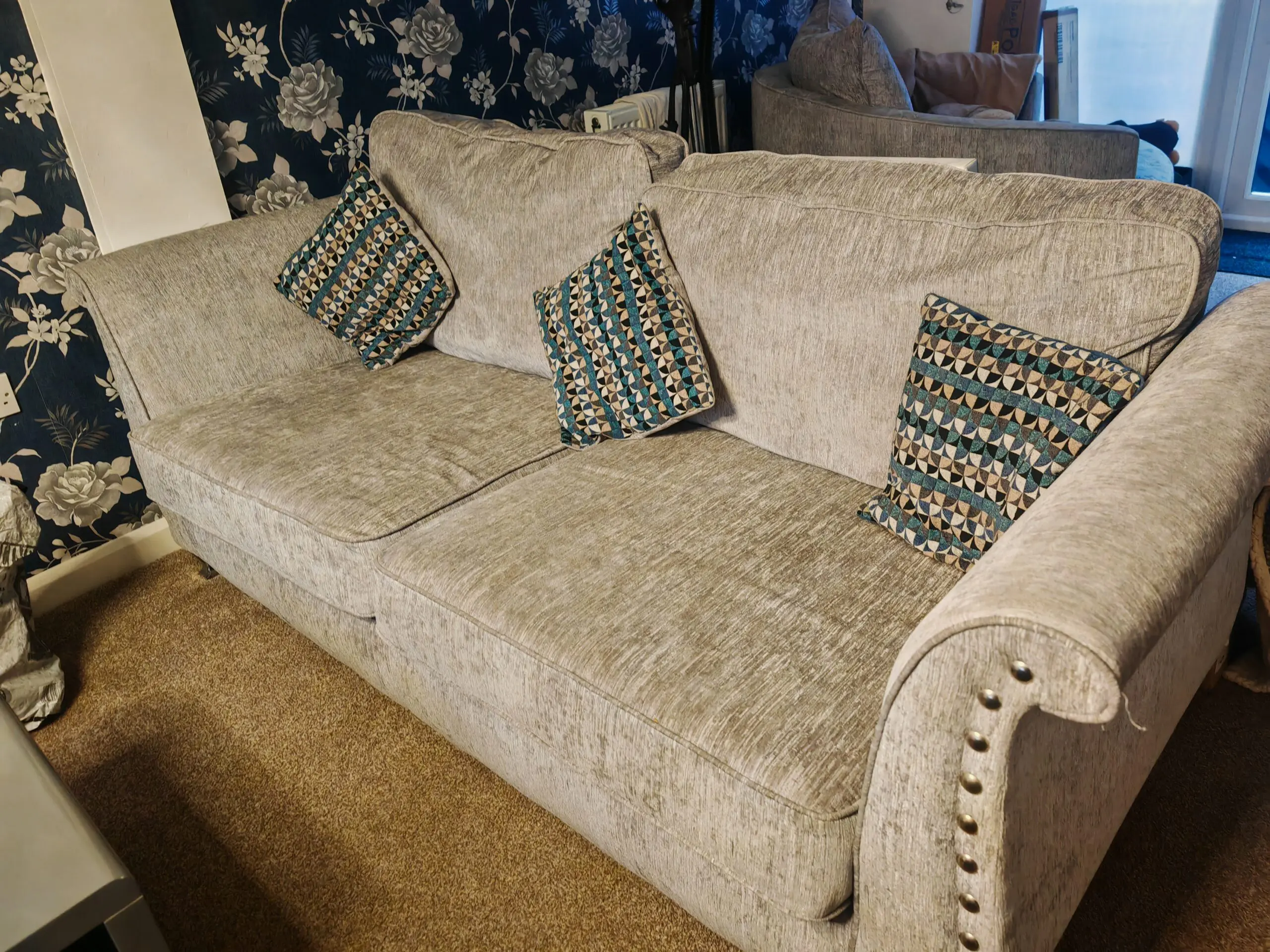 Comfy and modern sofa from scs. Well taken care of. Sofa was sold with scotch guard. One small mark, from reflective burn. Comes with 6 matching pillows.