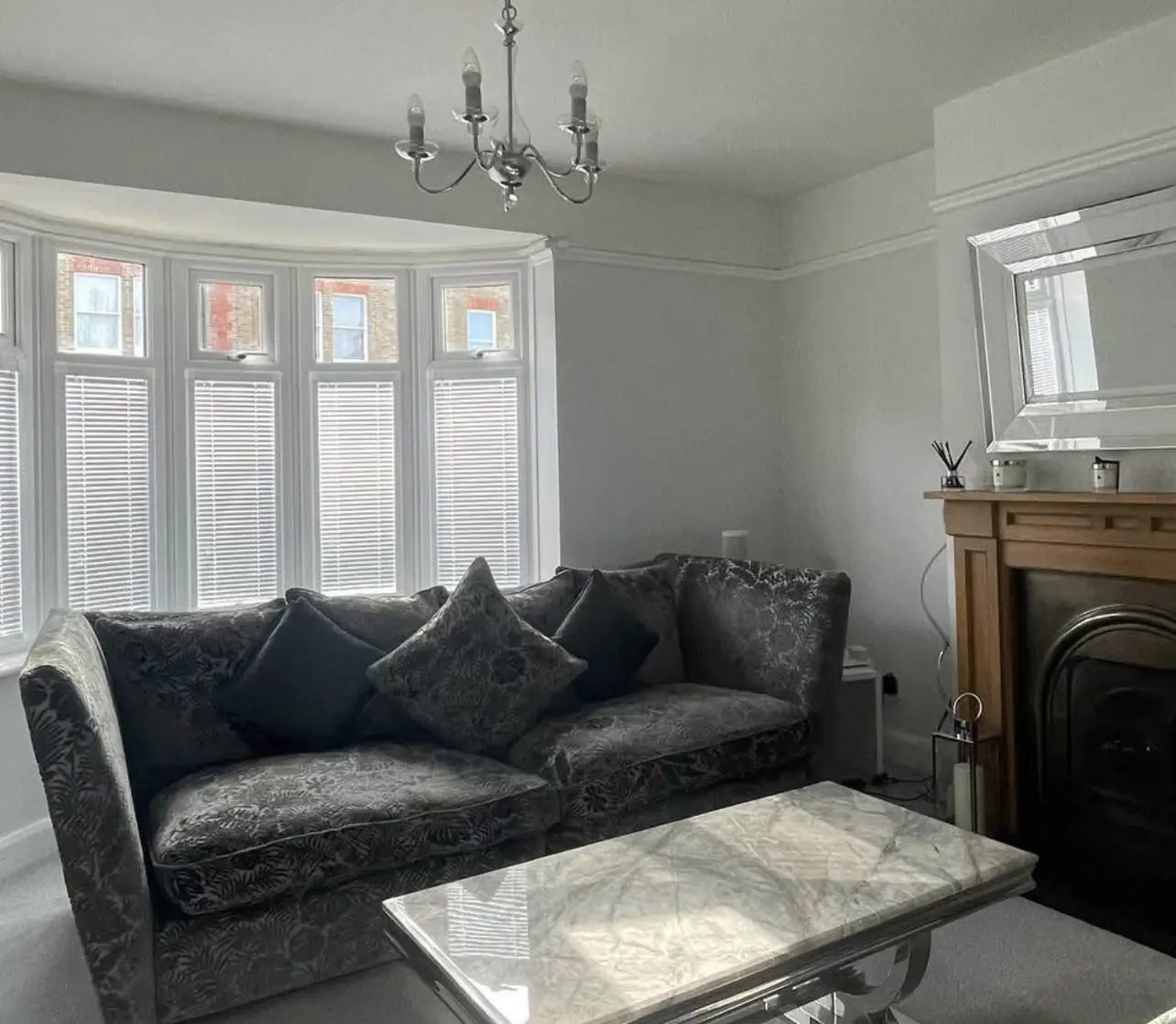 We’ve loved this sofa; it’s incredibly comfortable and just screams glamour. The silver and deep grey damask-style pattern is gorgeous, and the fabric has a rich, crushed velvet/velour feel that really catches the light.