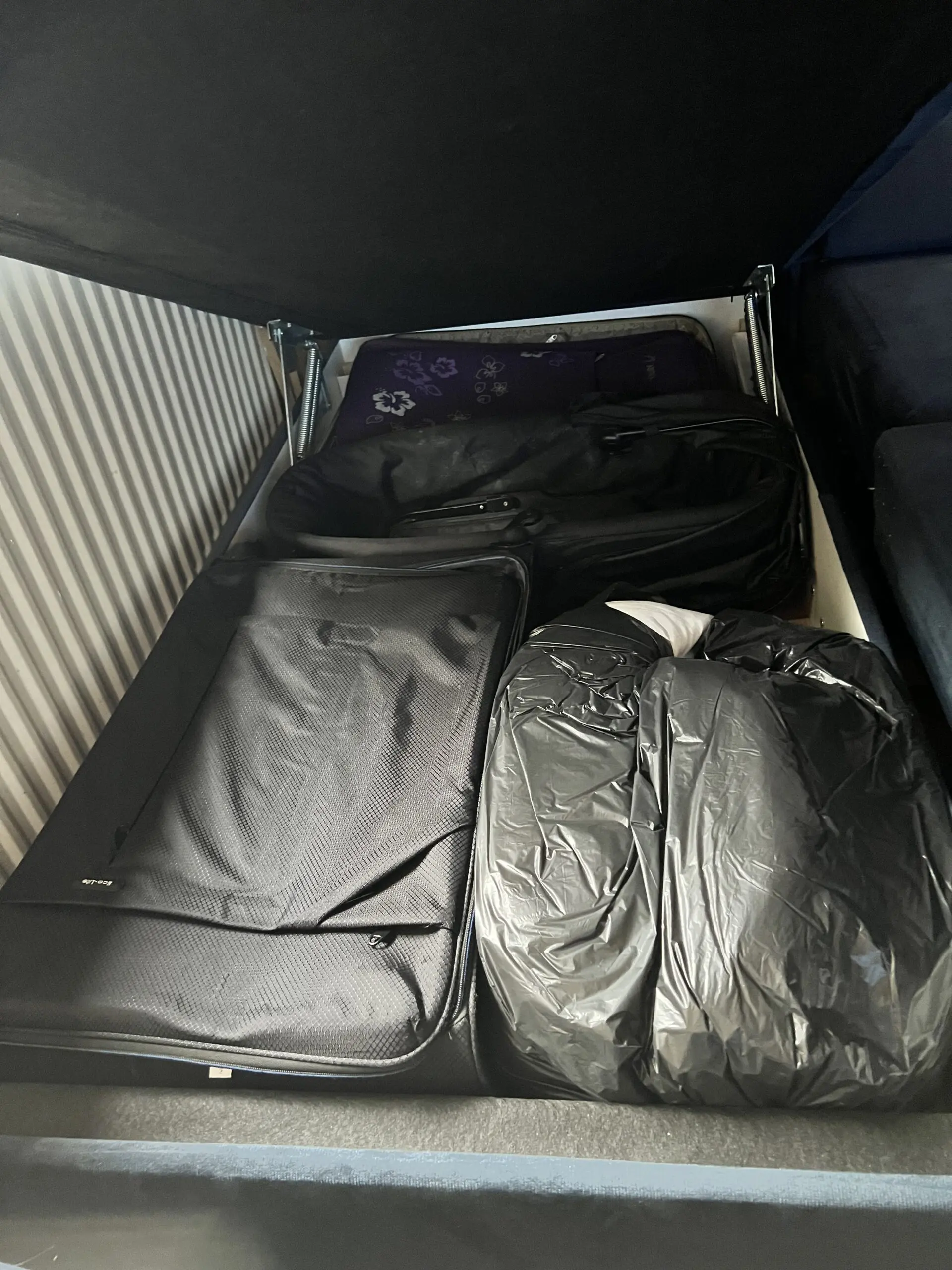 Large storage under left corner ( fits two suitcases, gondola and spare bedding) and mid size pouffe included
