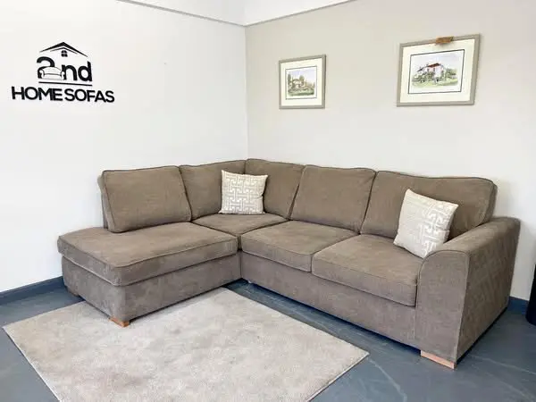 DFS 4 Seater Corner Sofa With High Back Pillows In Beige/Brown Color For Sale