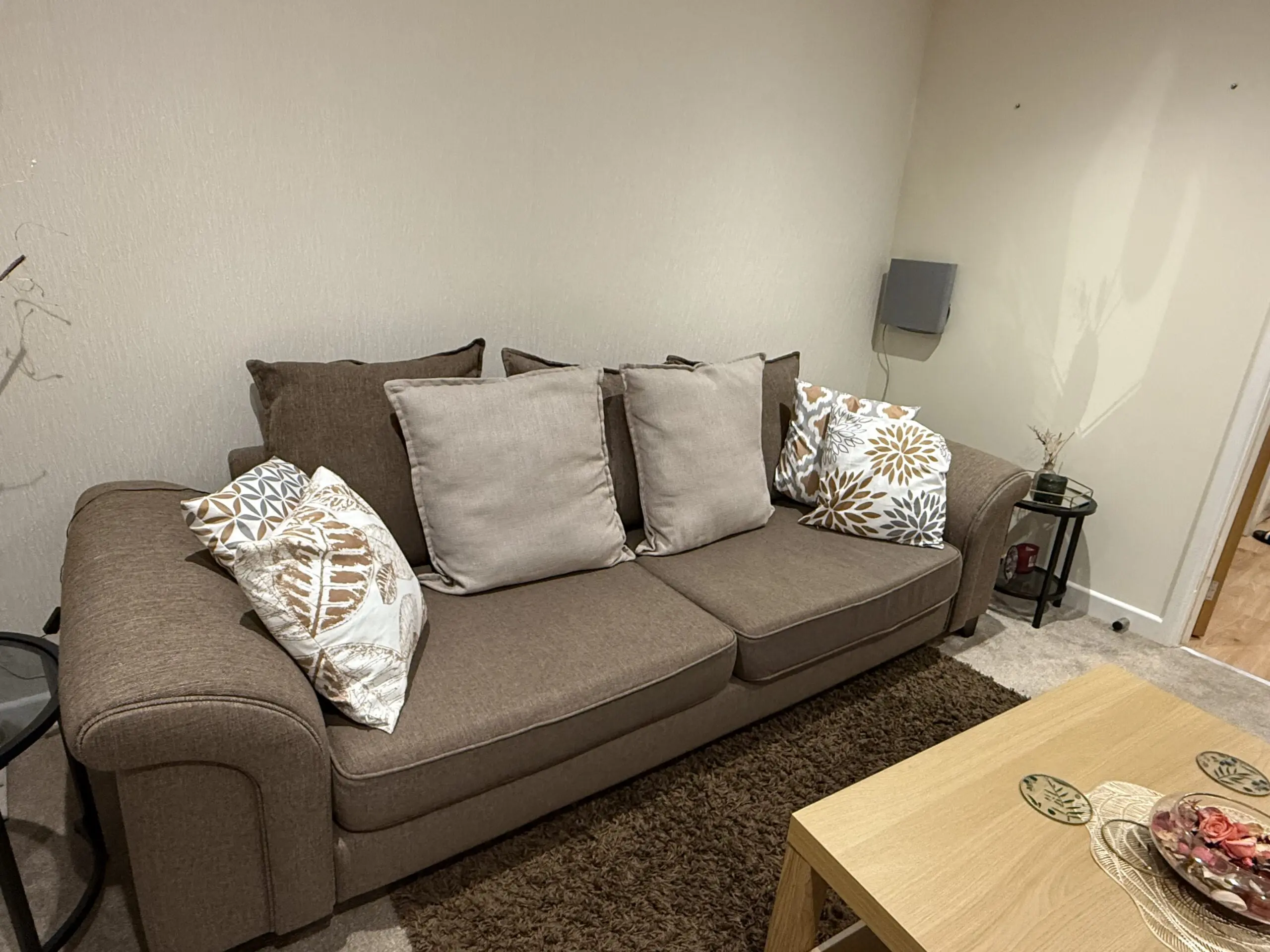 4 seater brown DFS scatter back sofa comfortable and in good condition with fire label attached. All cushions intact and included.
