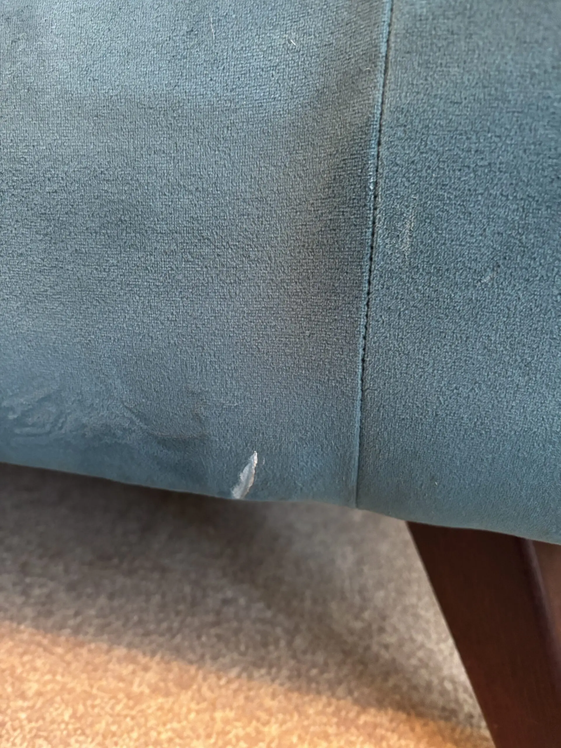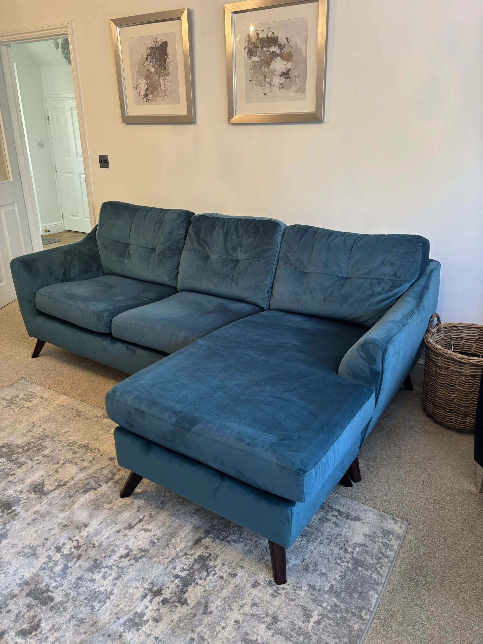 Excellent condition sofa. Chaise can be put either end, all cushions reversible. Has had minimal use. Slightly mark at bottom as shown. Chaise total length is 160cm.