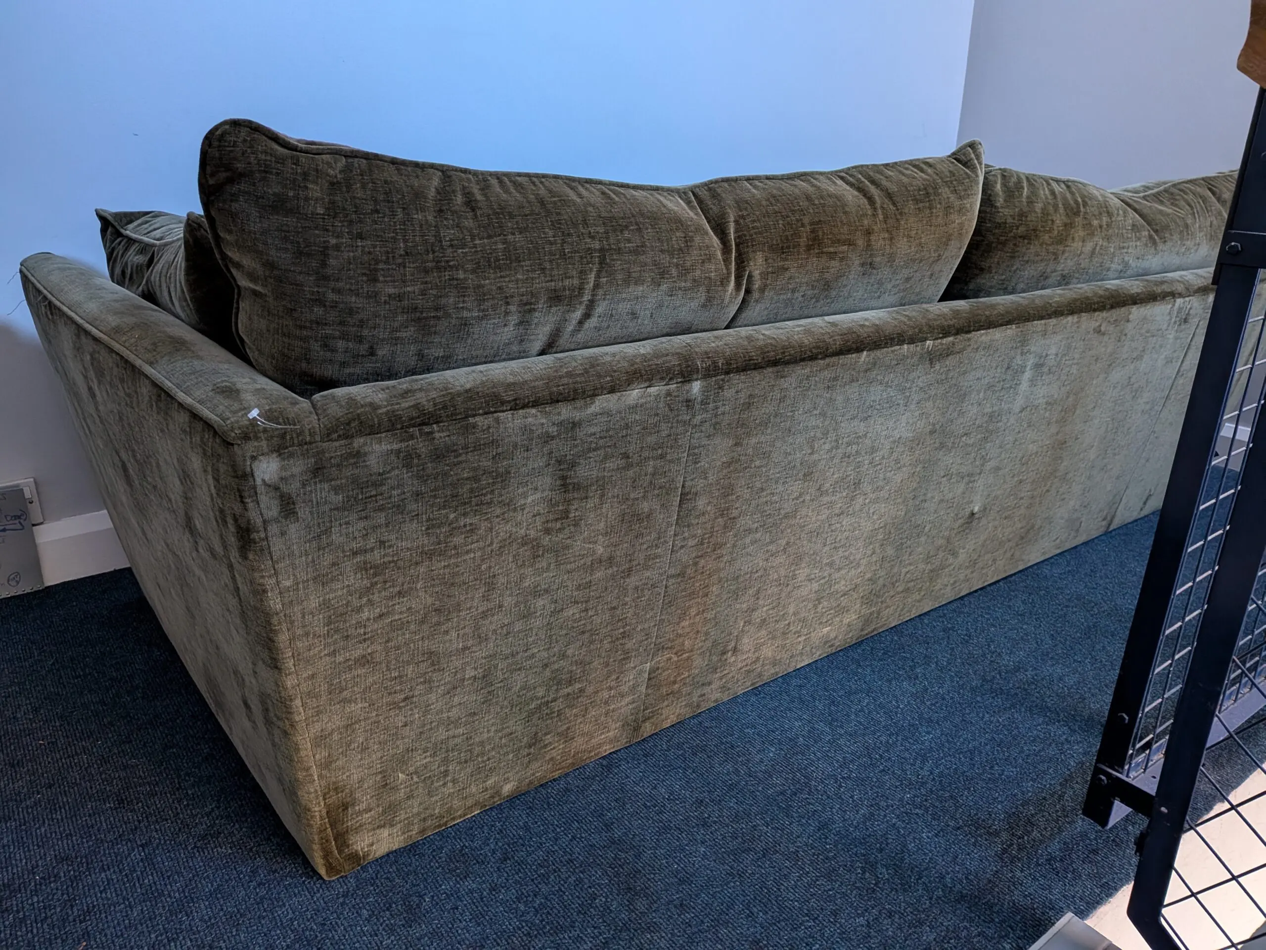 Upholstered in a thick, luxurious short pile fabric made from 60% recycled polyester, which catches the light differently across the sofa