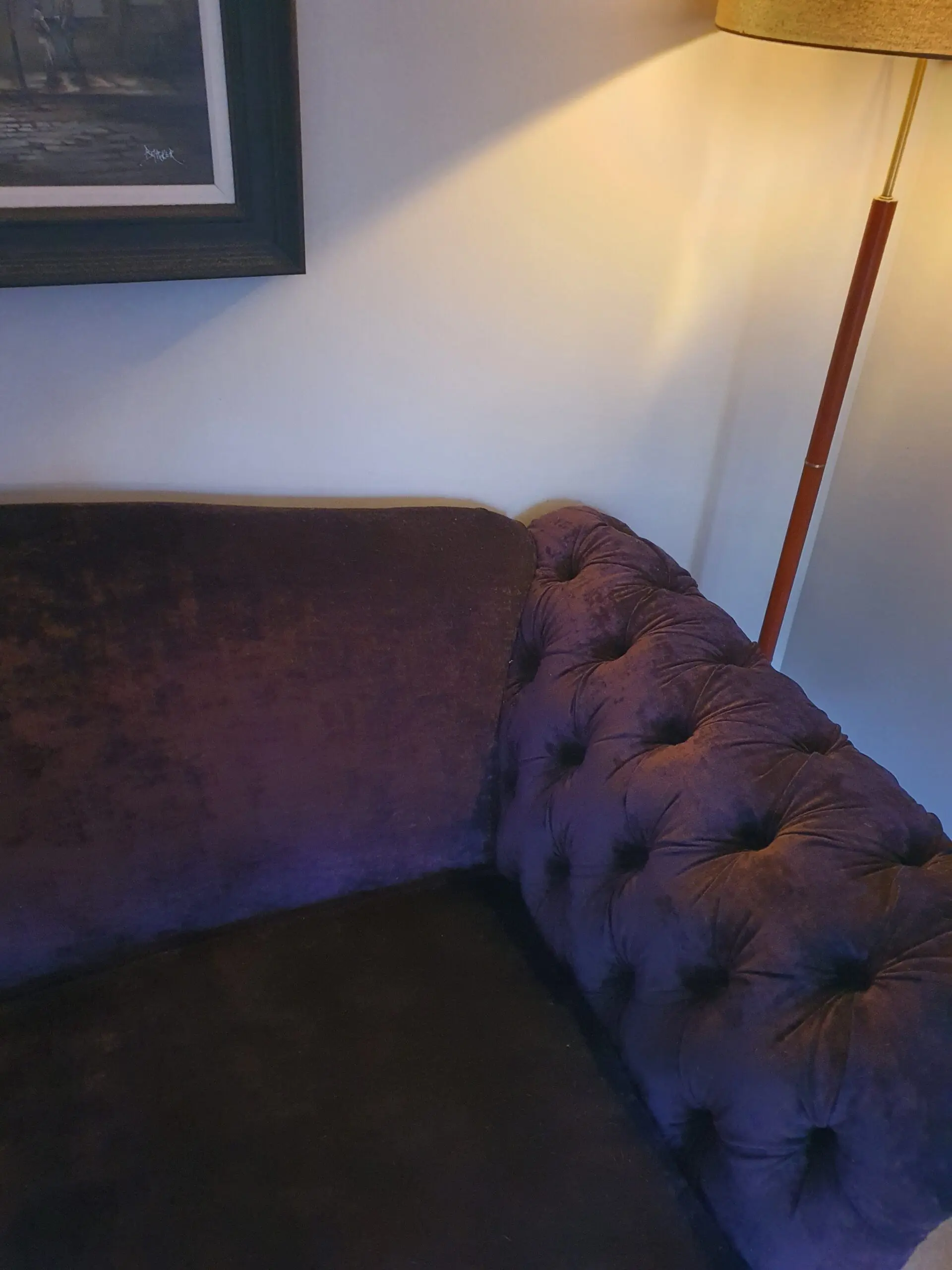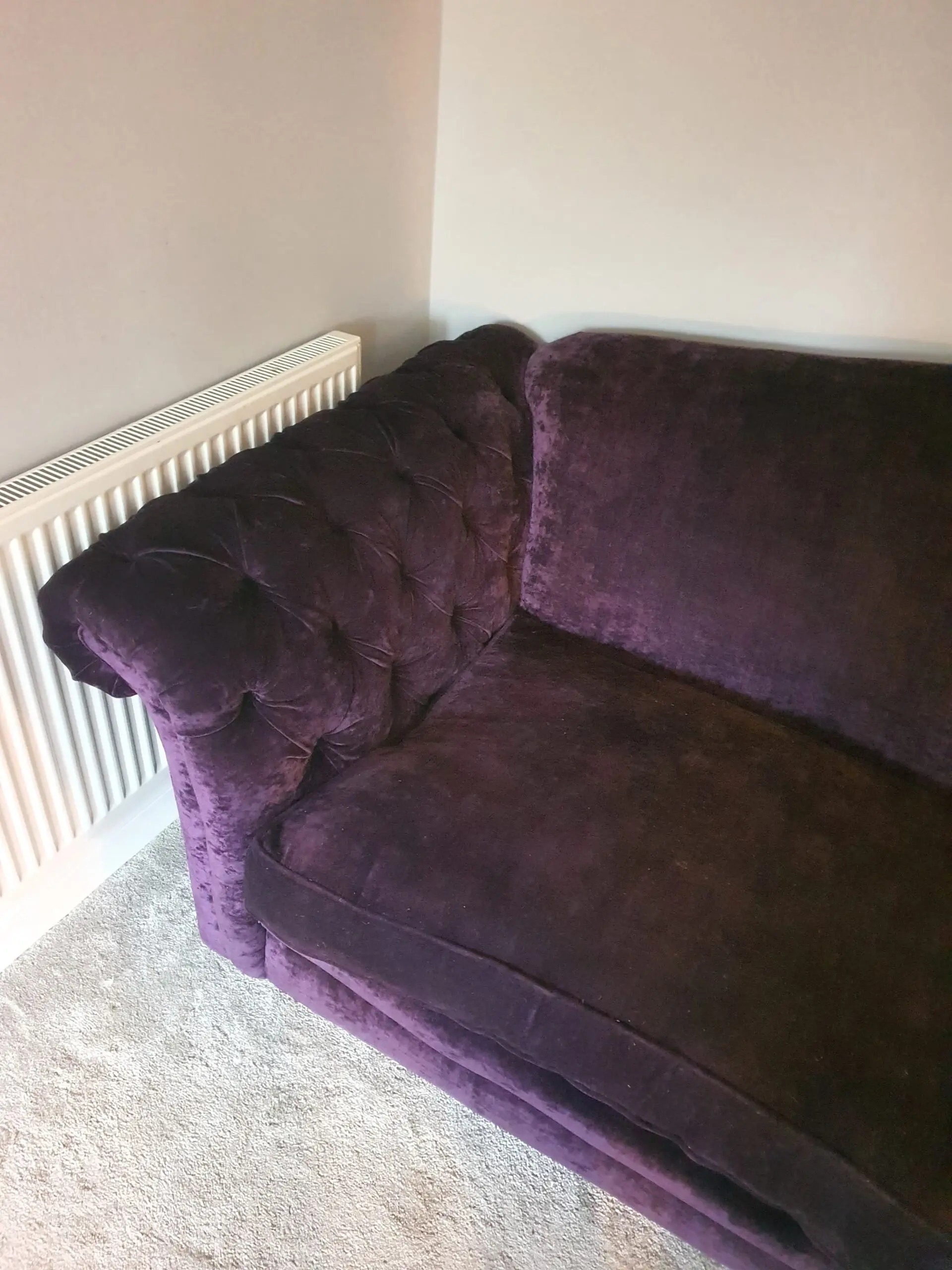 The sofa is Aubergine in colour. Very good condition. Antique feet. Extremely comfy.