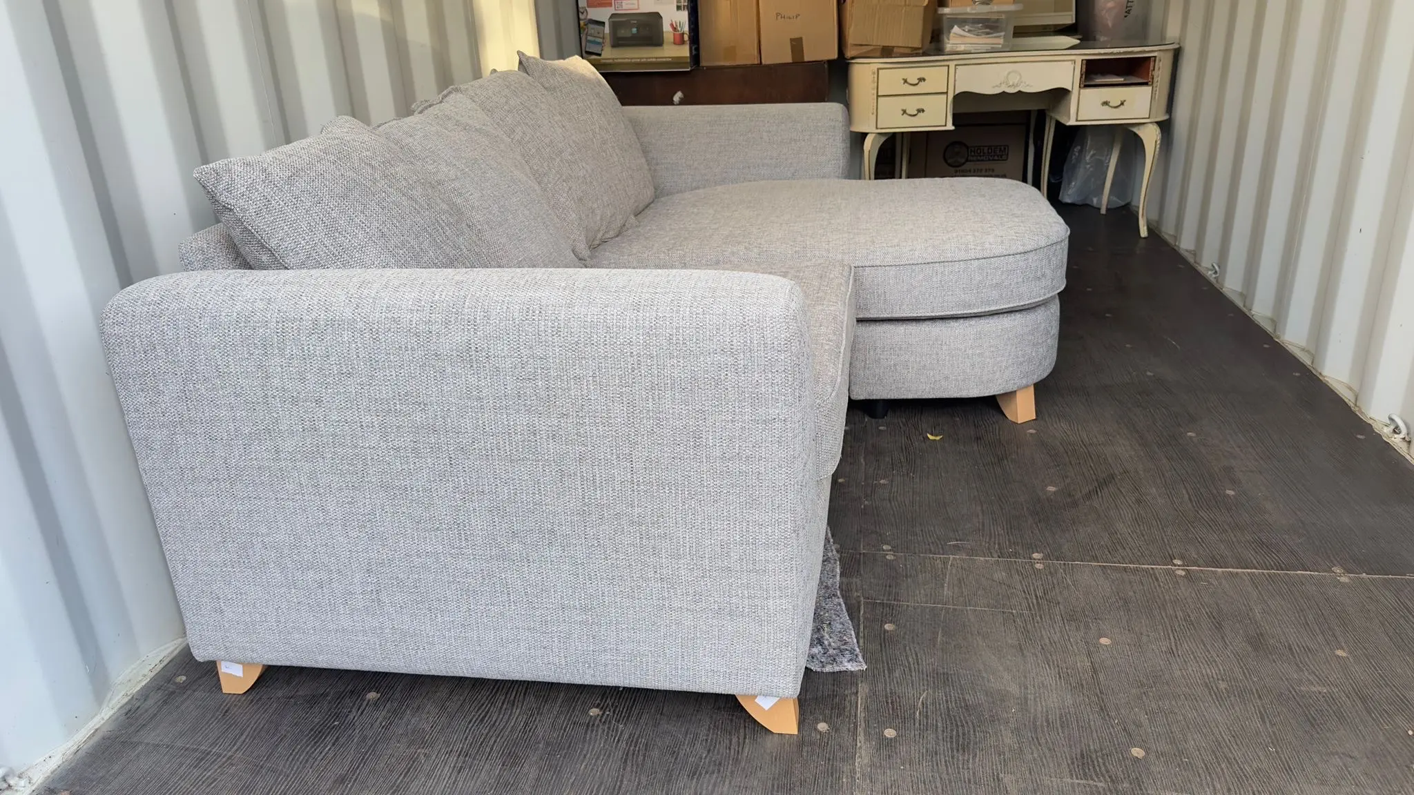 Upholstered in a chunkier basket weave fabric, which has more irregular, contrast colour tones making the weave pattern an eye catching feature.