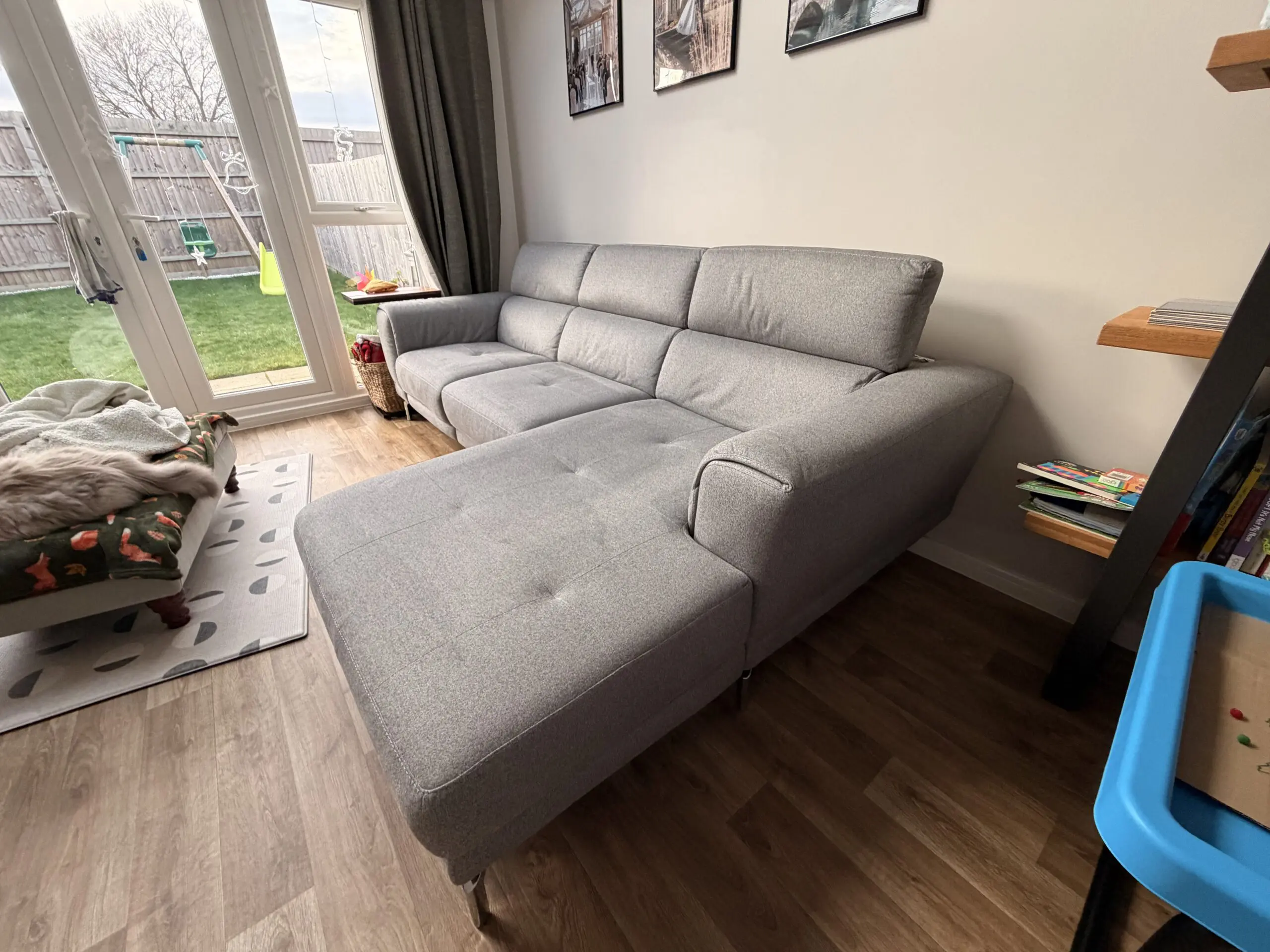 DFS Venezia corner sofa in silver, with power recline and adjustable head rest.