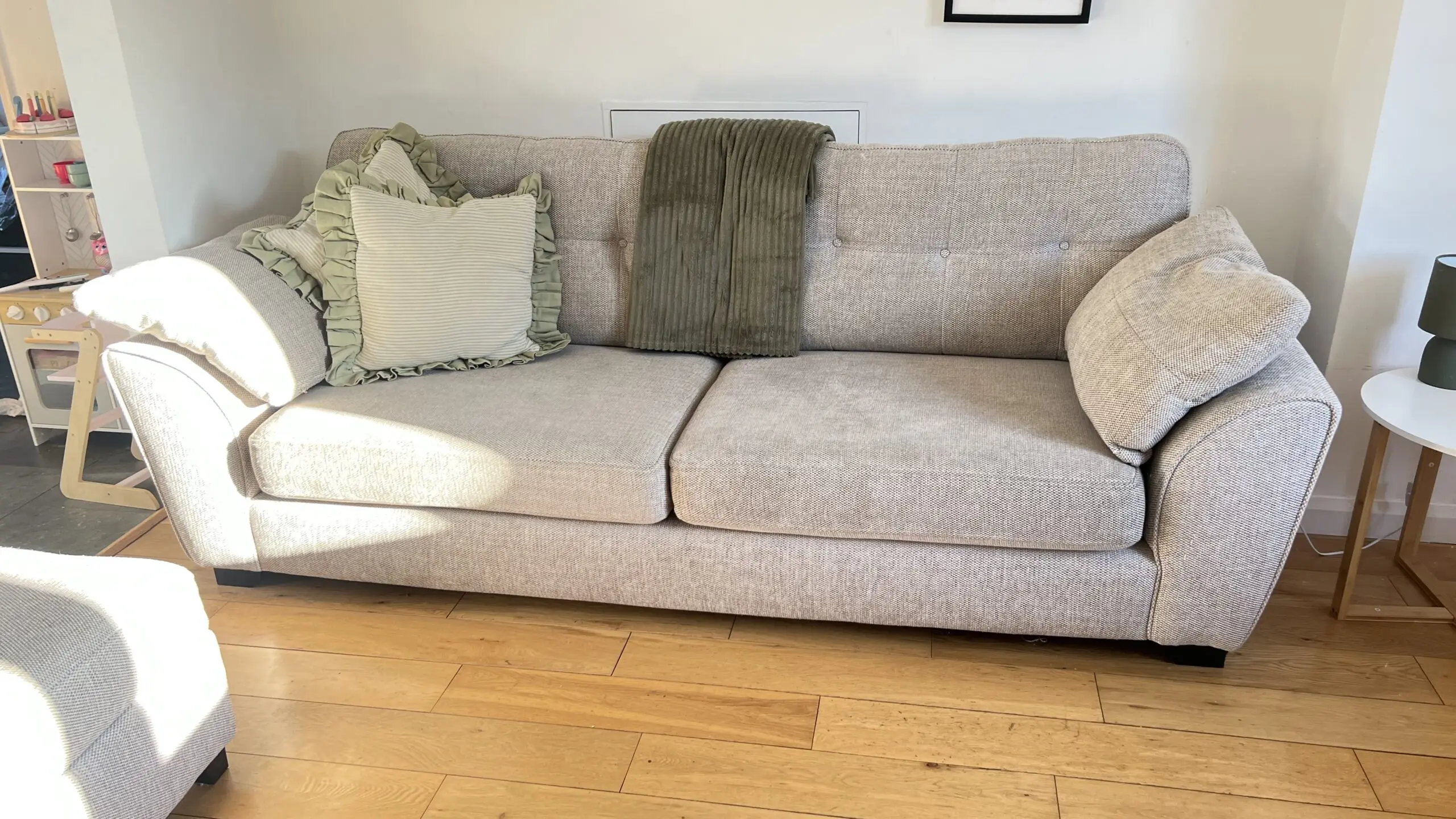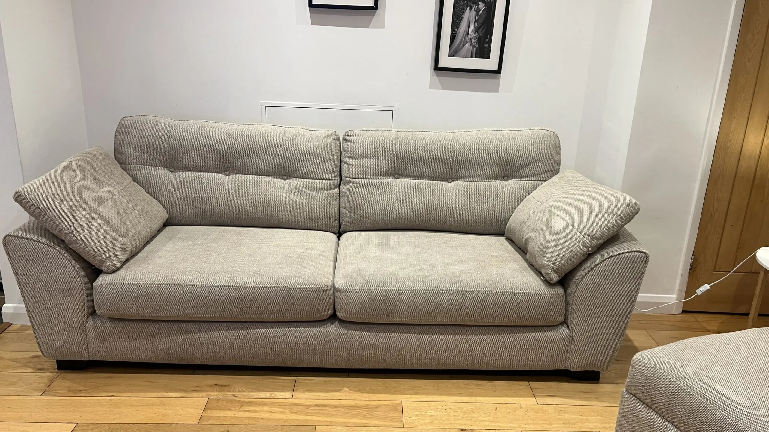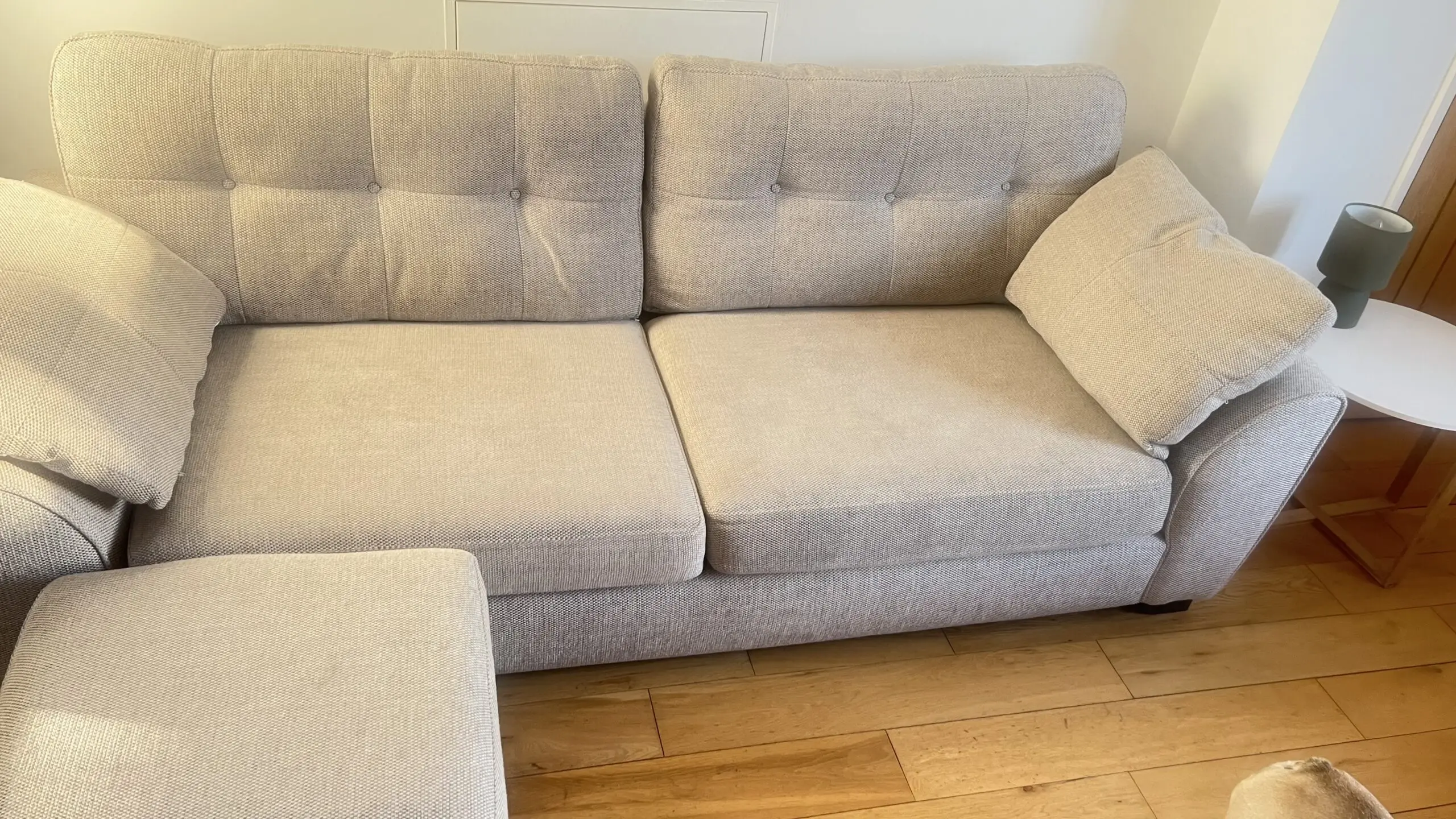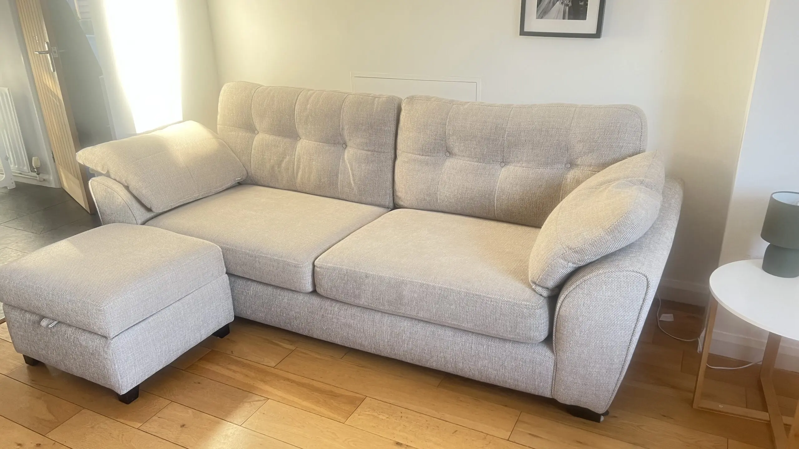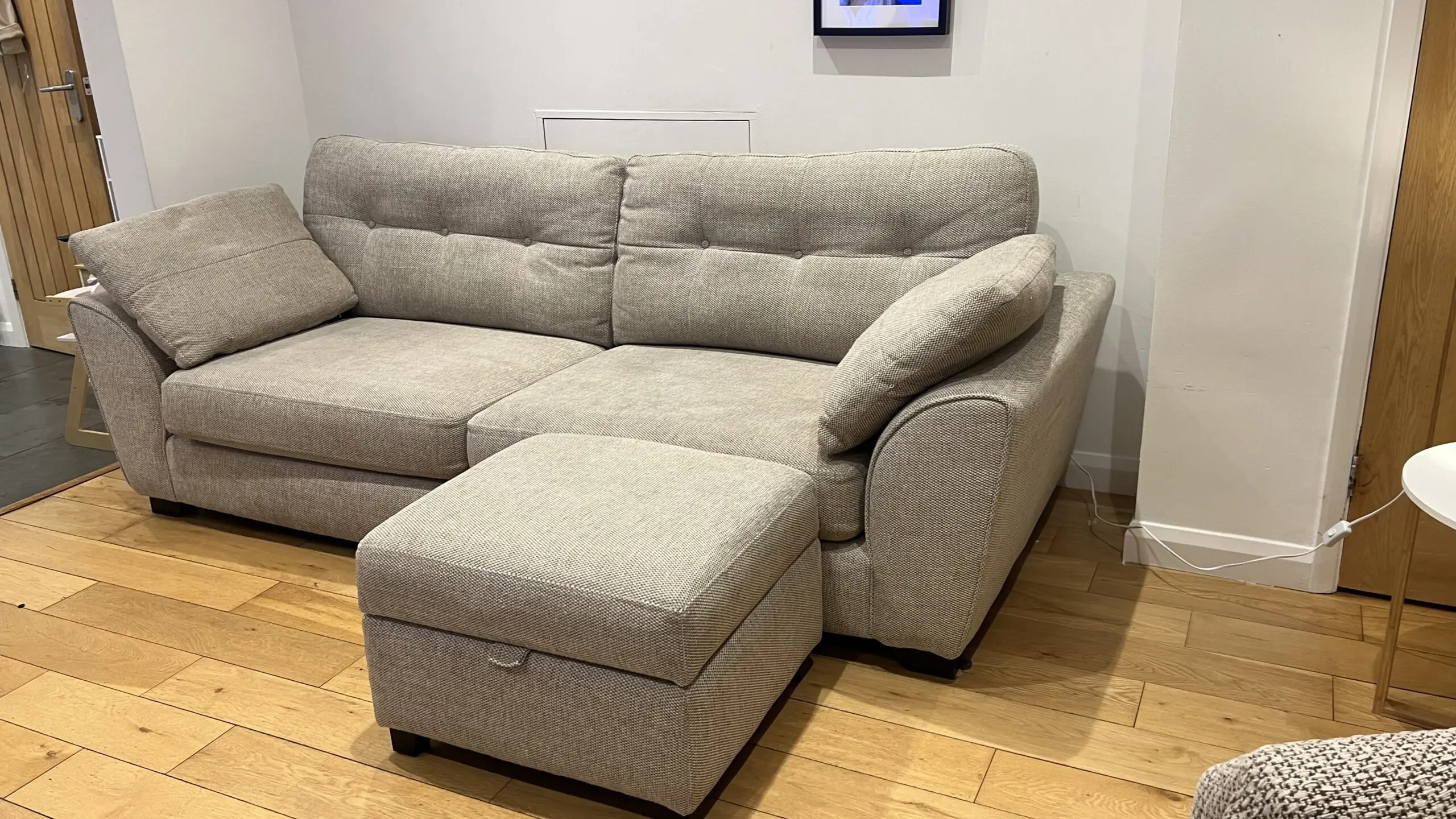 Extremely comfortable sofa with removable arms in sand colour with storage footstool. Less than 2 years old and still covered with Sofa Care. Some light marks from general use.