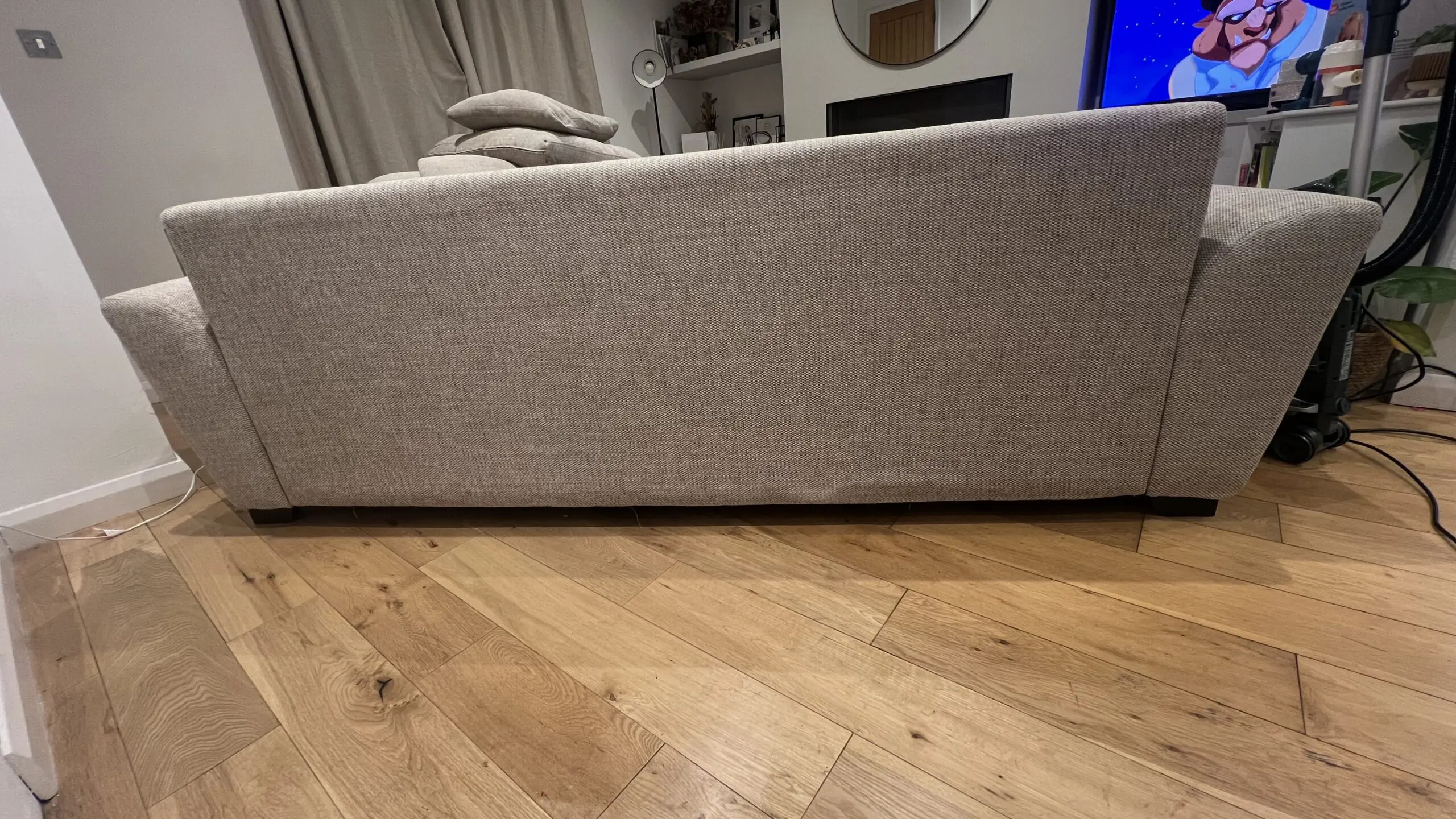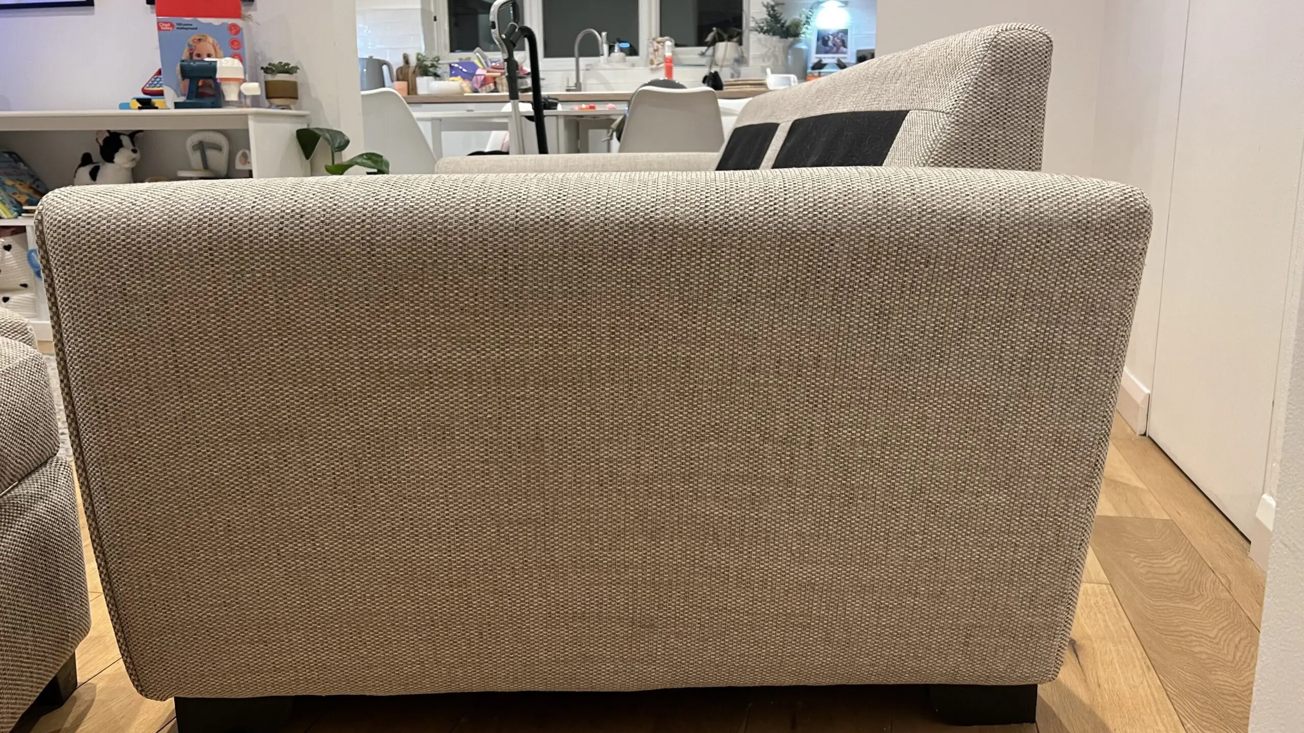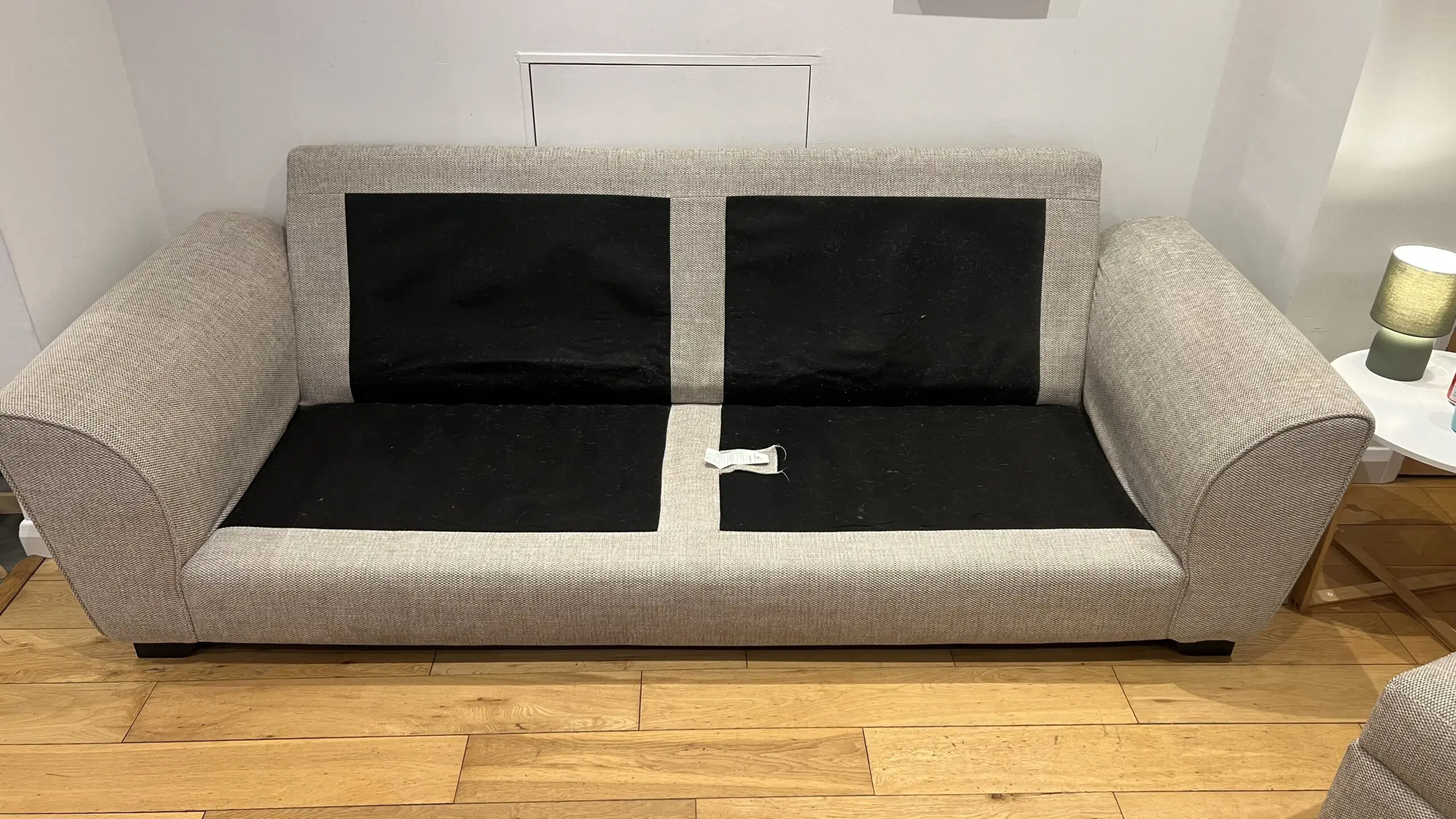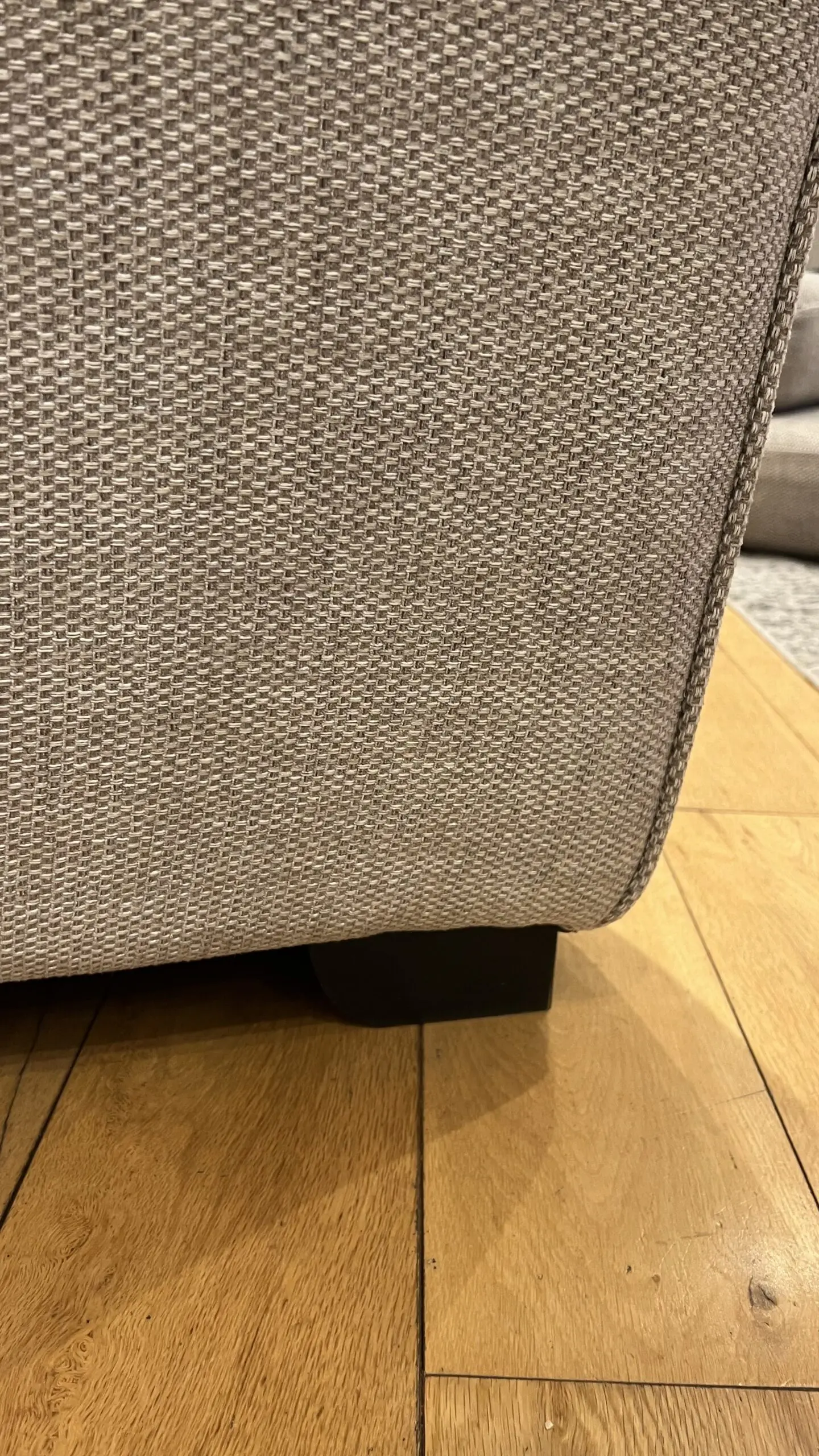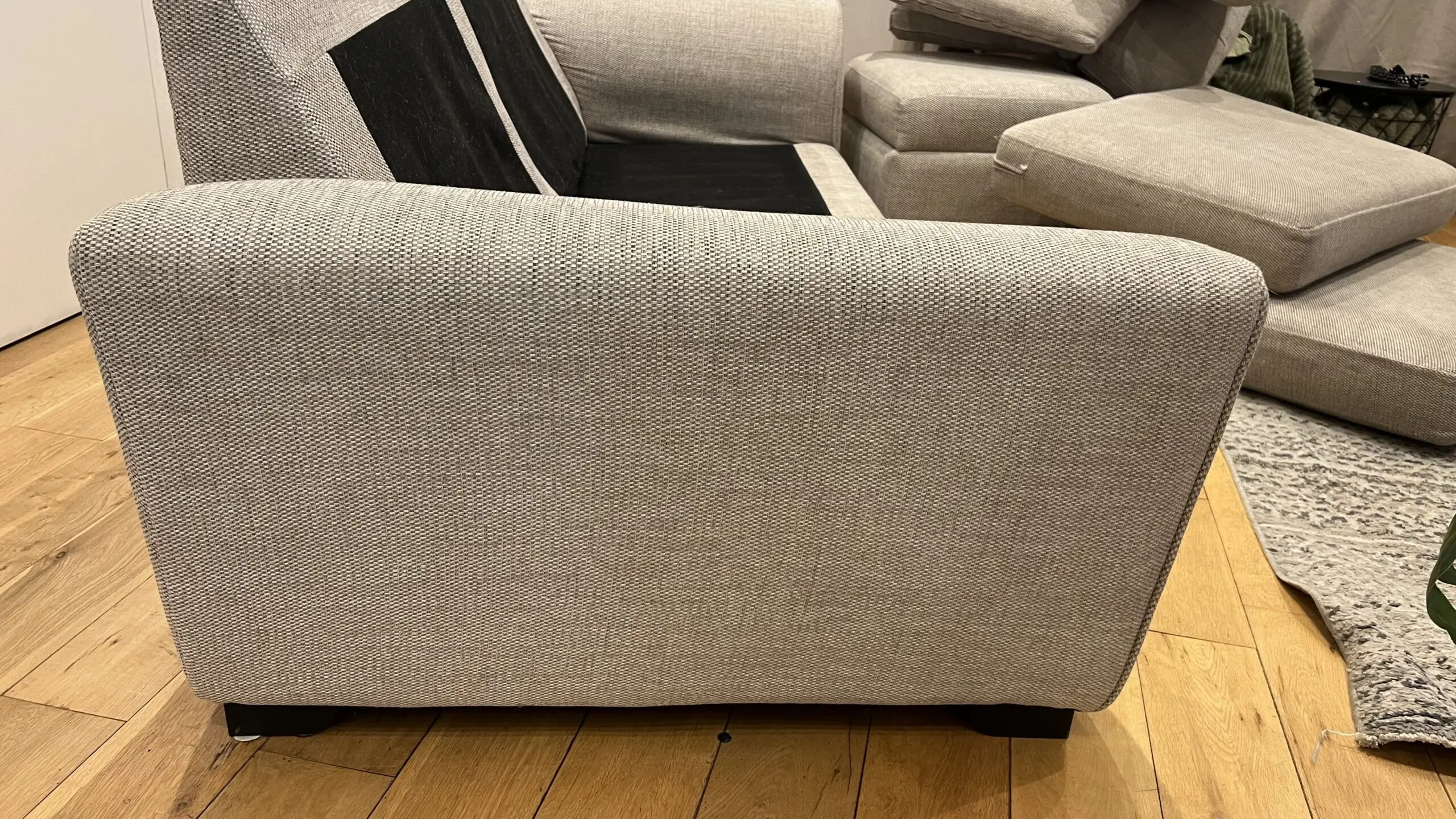 Extremely comfortable sofa with removable arms in sand colour with storage footstool. Less than 2 years old and still covered with Sofa Care. Some light marks from general use.