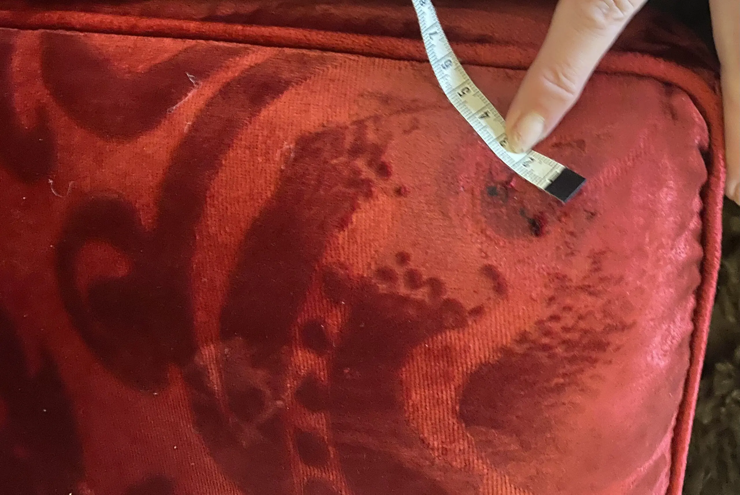 Stains and marks- just 1 mark on one of the seat cushions. 2 tiny black biro dots. Image attached. This is reflected in the asking price. The back and seat cushions are all reversible, and zipped for removal/cleaning.