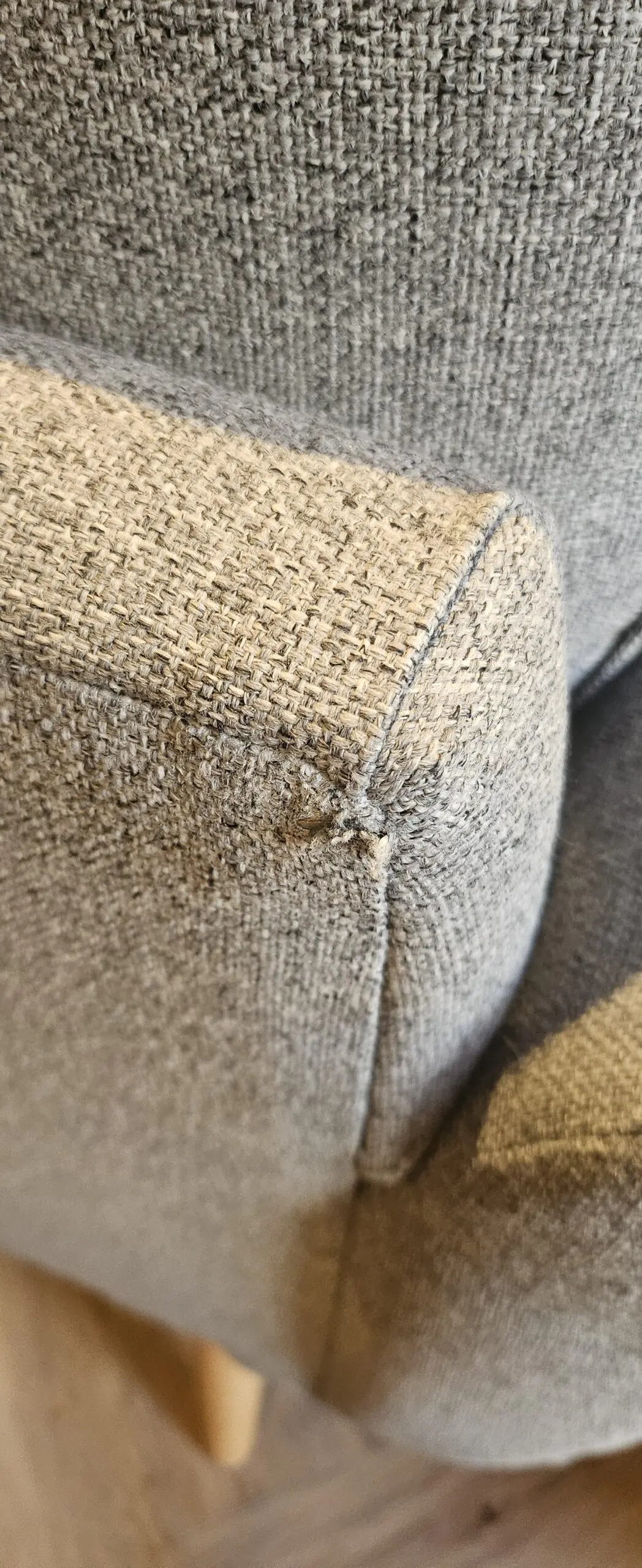 No photos of single armchair as this is in storage but in excellent condition. Children and pet free home and well looked after. There is slight wearing on the cuddle chair corner where this has rubbed against the wall and a slight click on the back (see last 2 photos).