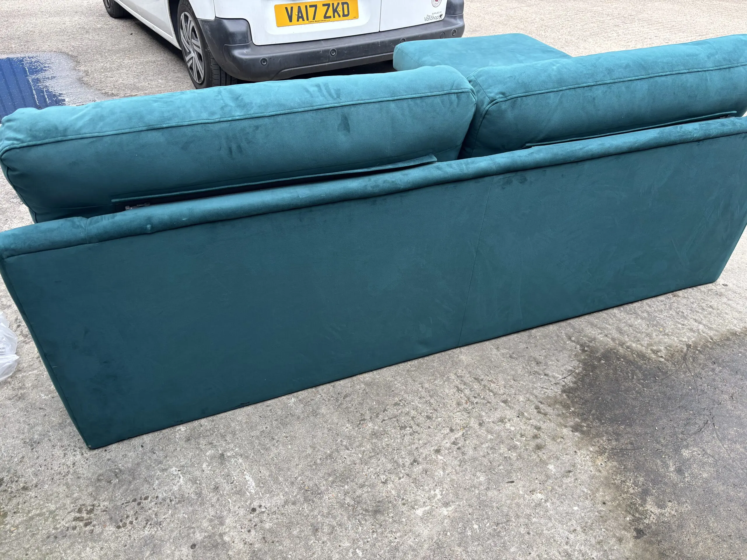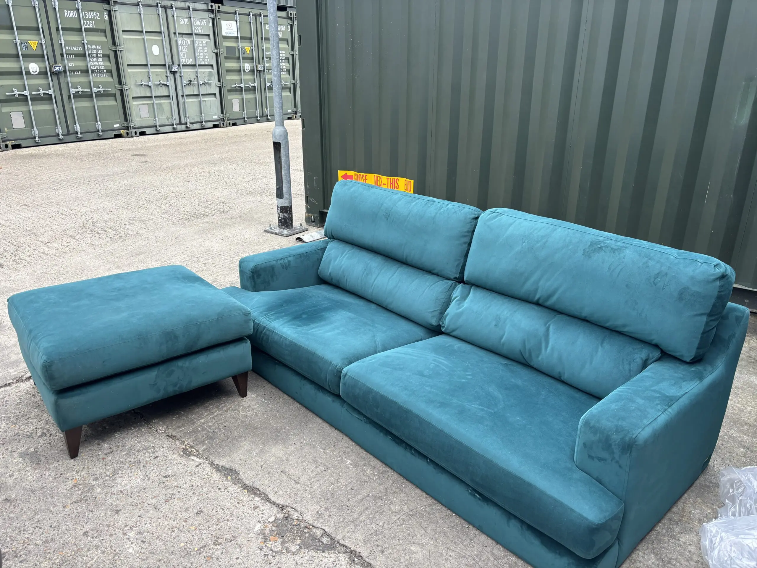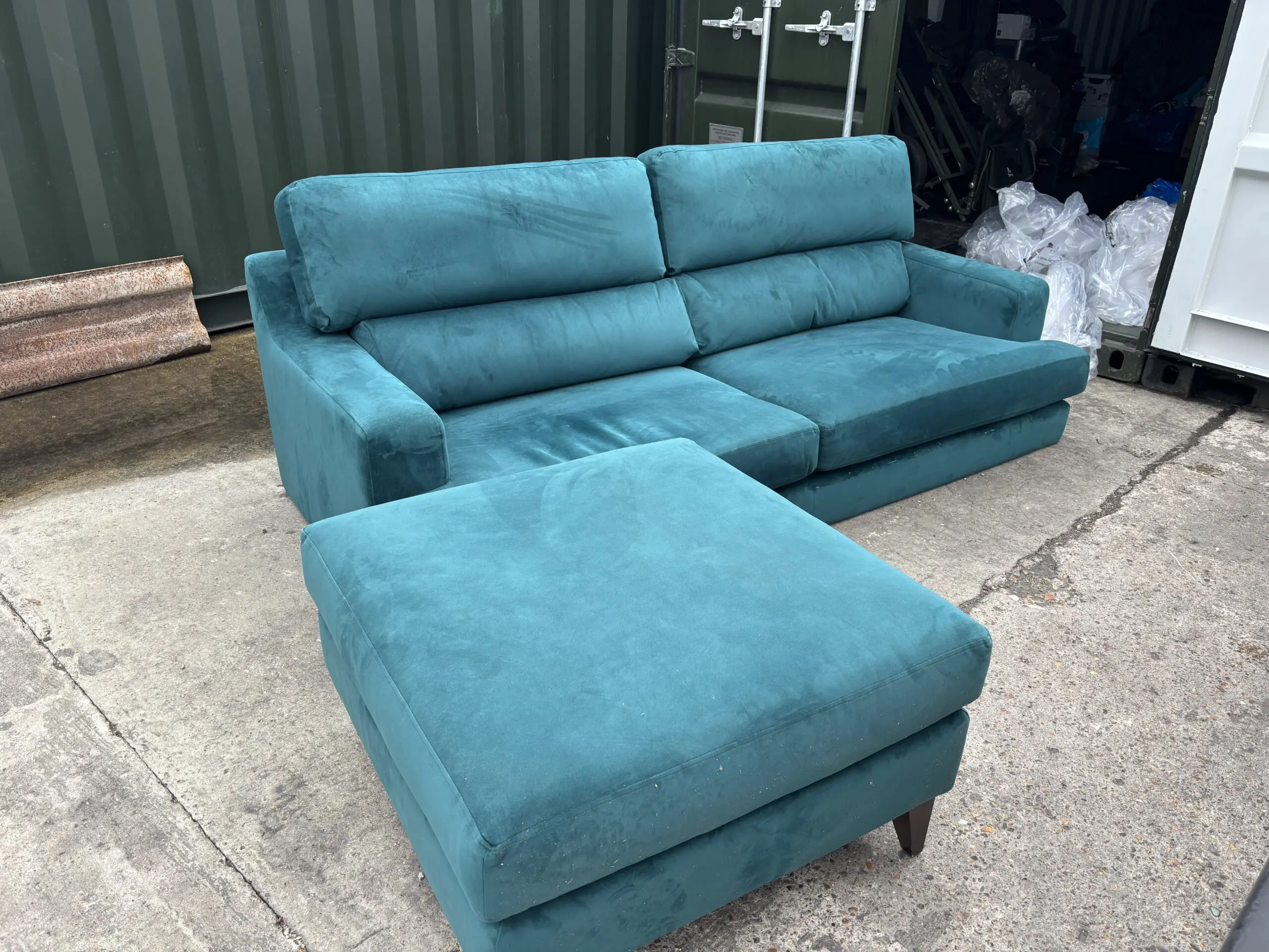 Excellent condition 4 seater sofa and footstool from furniture village. Reason for selling is that it doesn’t fit in my flat. Currently in dry storage only been used for roughly 5 months before I sold my house. Feet for sofa are currently off and in a bag. Sofa is in storage in purfleet
