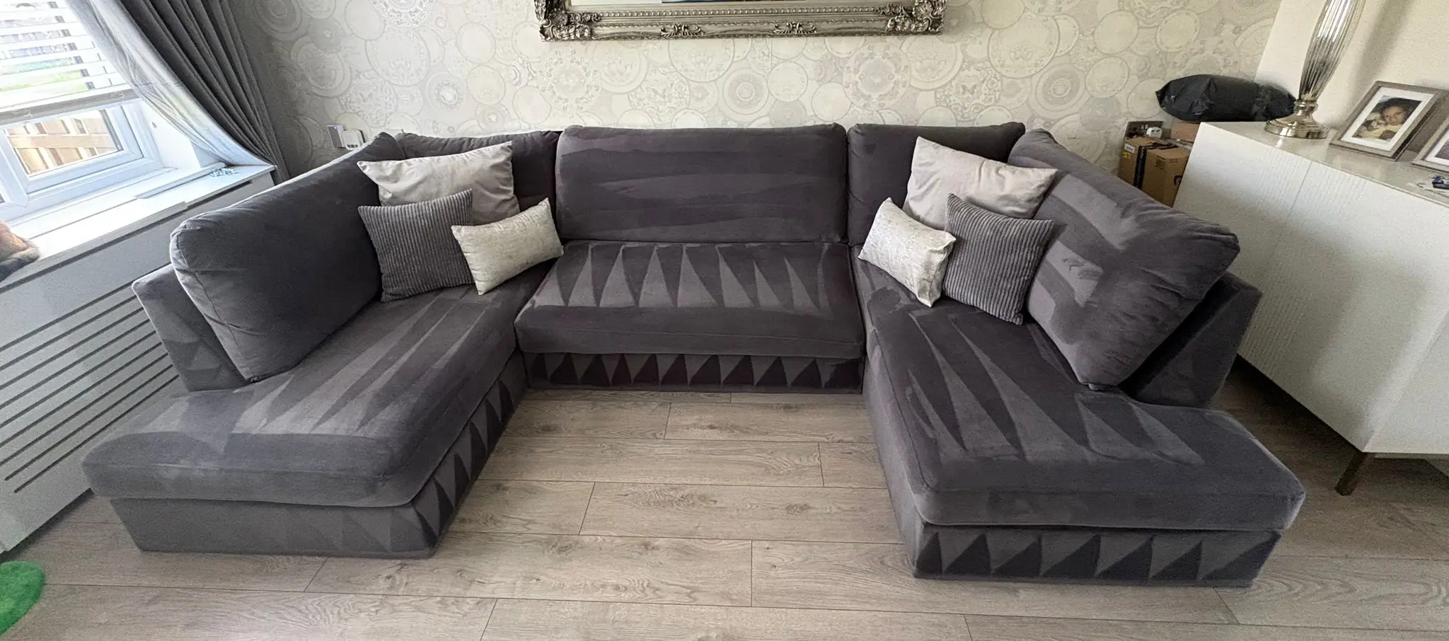 U shaped, grey velvet effect sofa. Like new from smoke free home