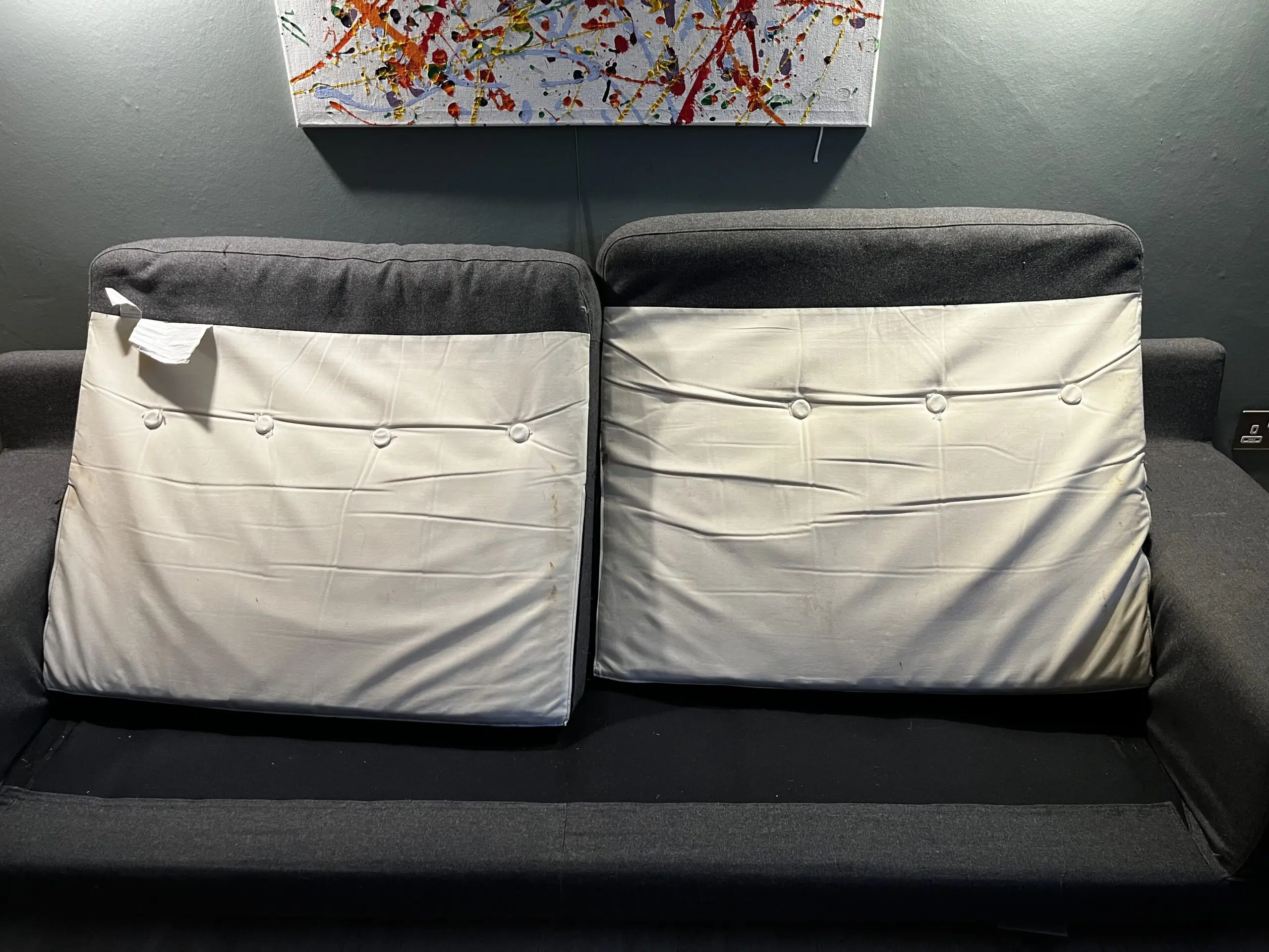 Habitat no longer do a wool version of this range. The sofa is in satisfactory condition. I would suggest that it could do with reupholstering. The fabric is worn and there are a few marks. The main cover is removable and washable, although I have never done this. The cushions have zipped covers but they have buttons through the whole cushion, so it would be difficult to remove.