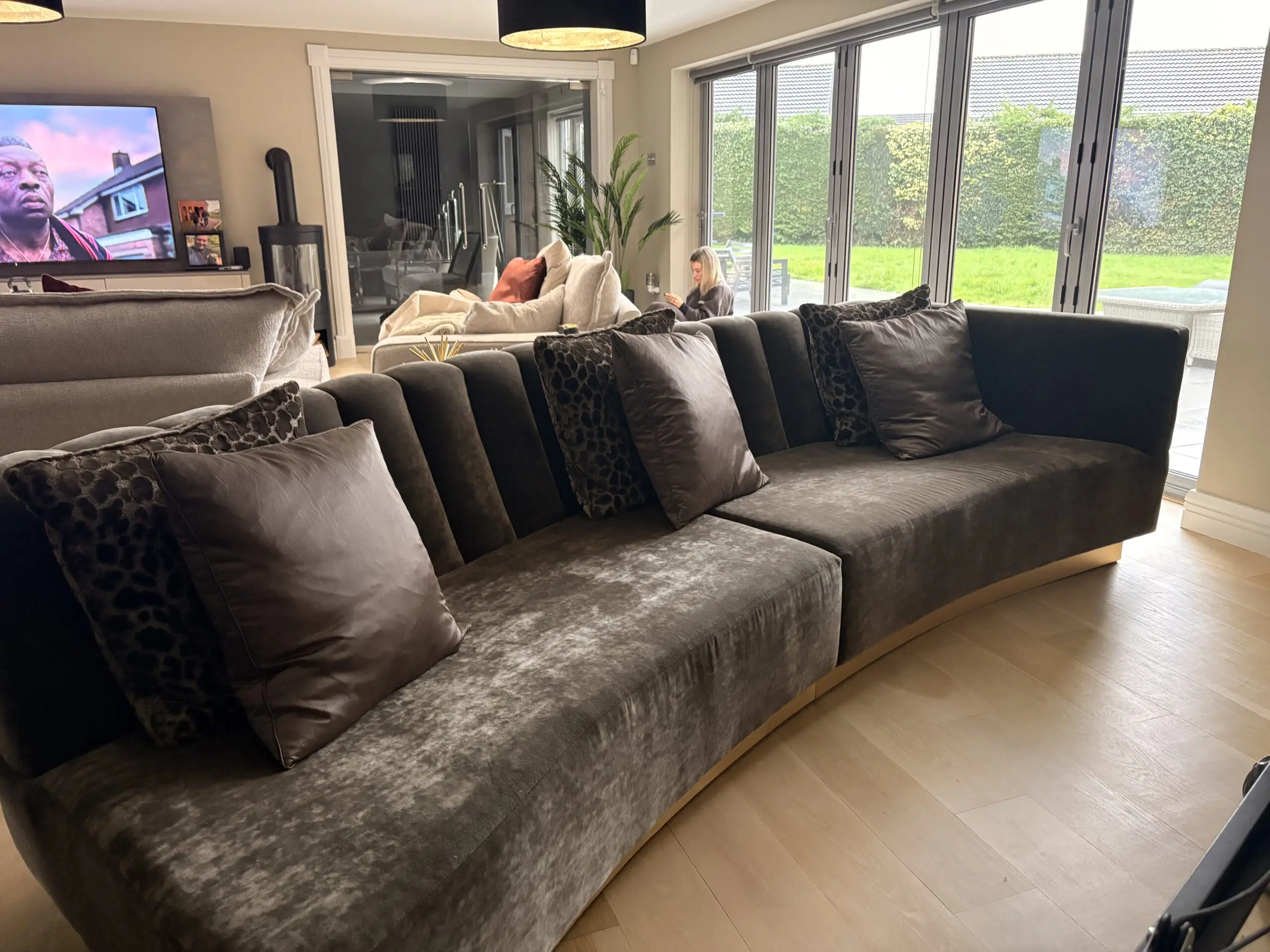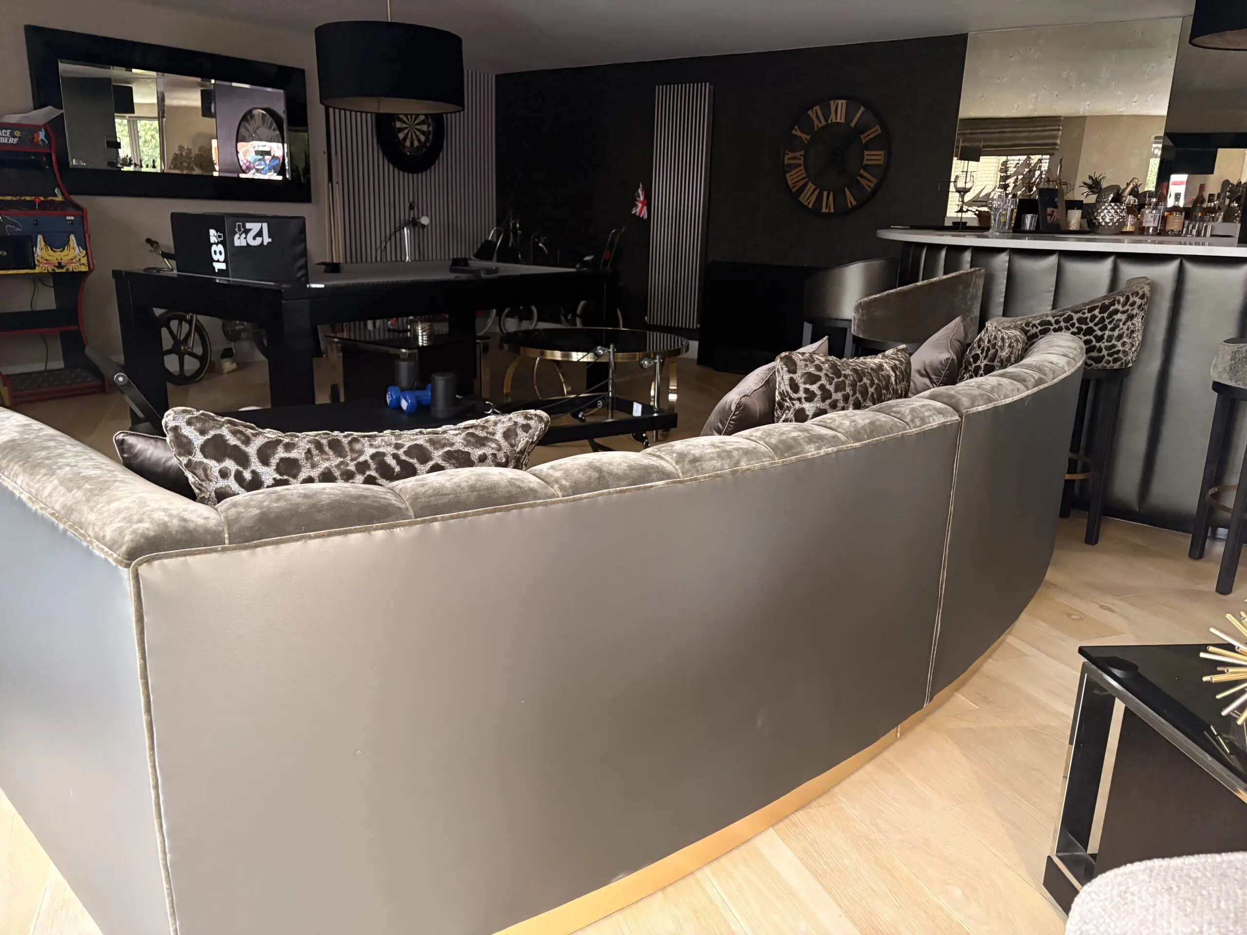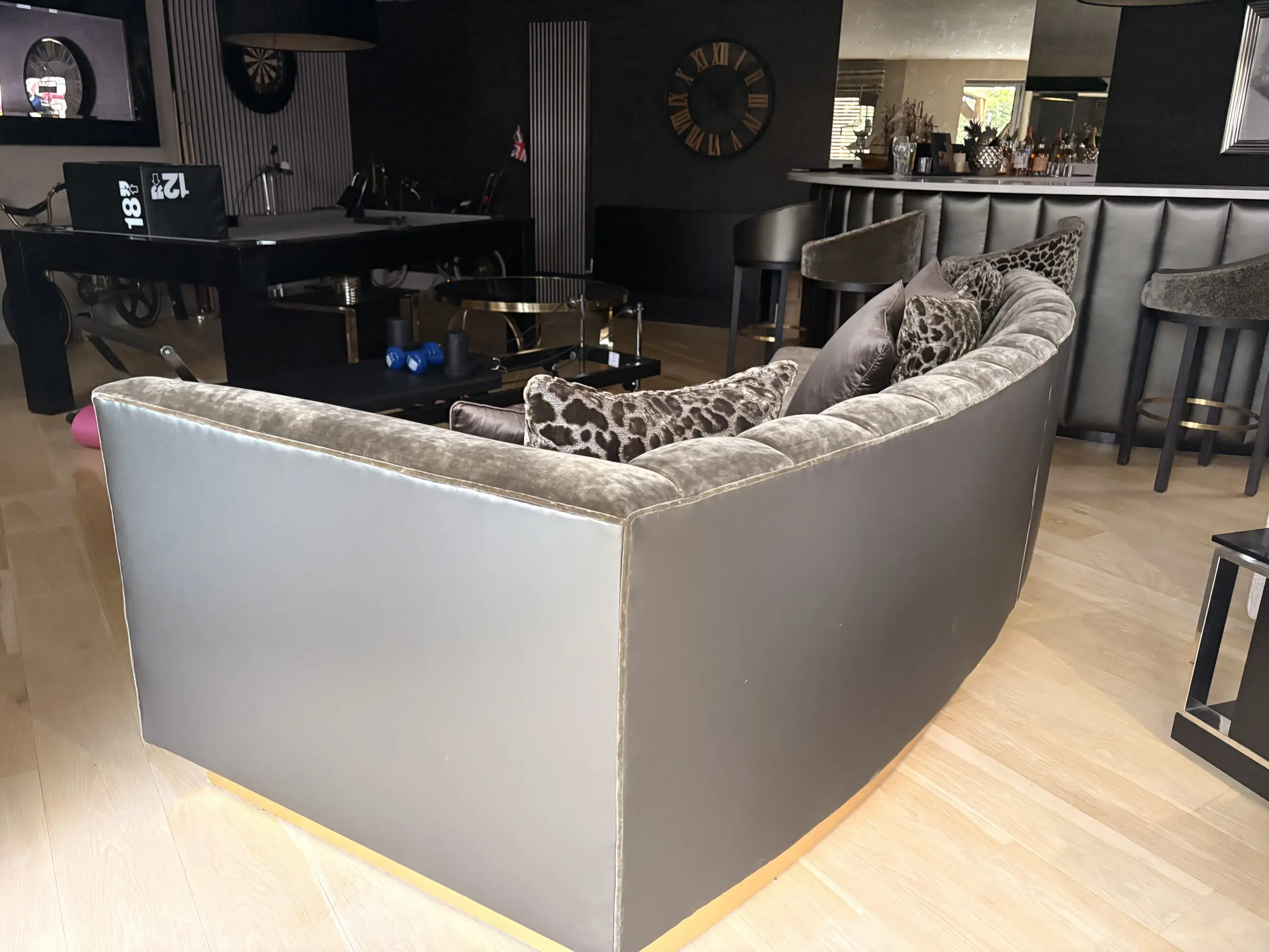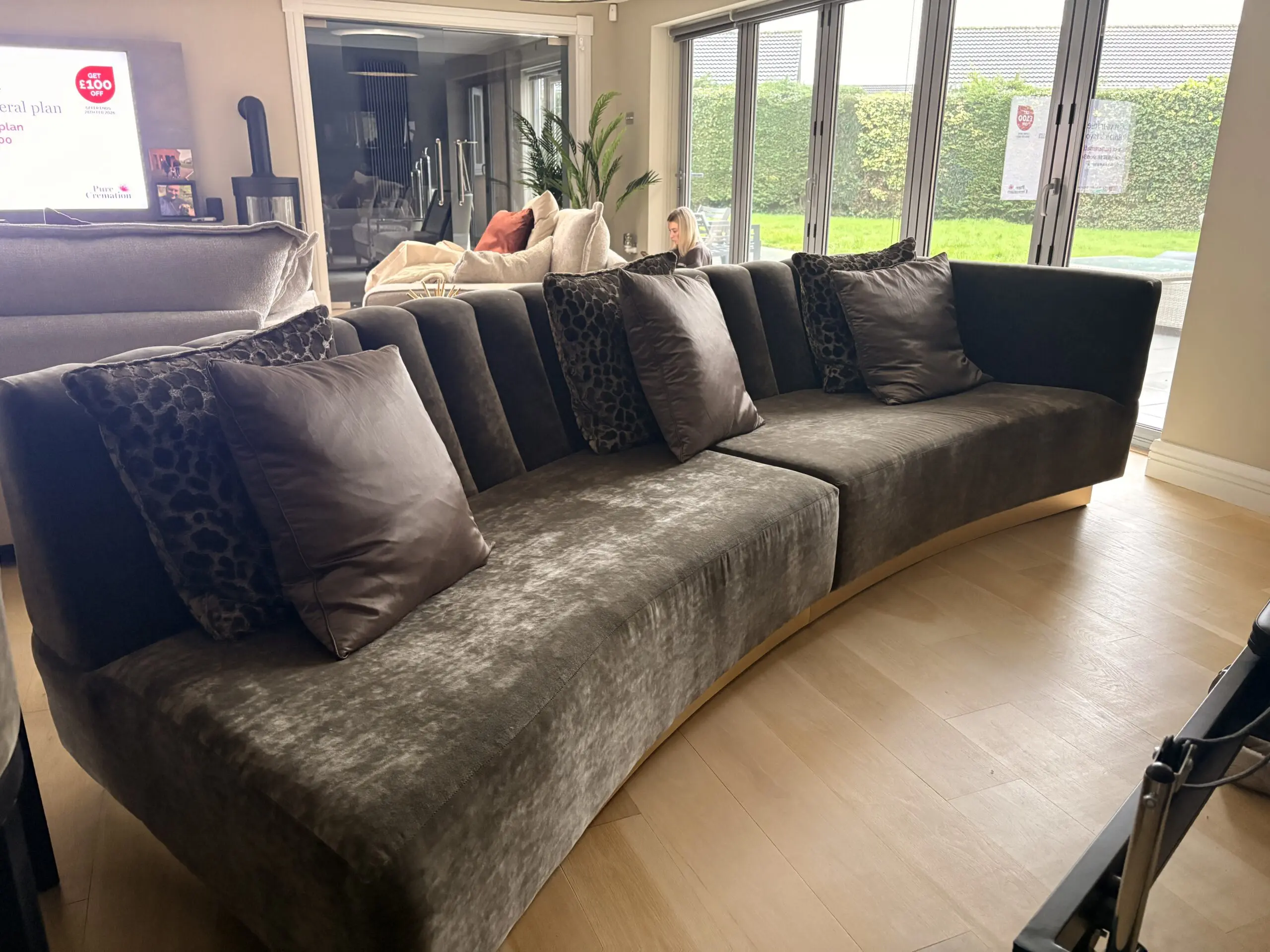 Brown curved sofa with brown leather back. Was handmade so won’t find this in the shops. Cushions are also included.