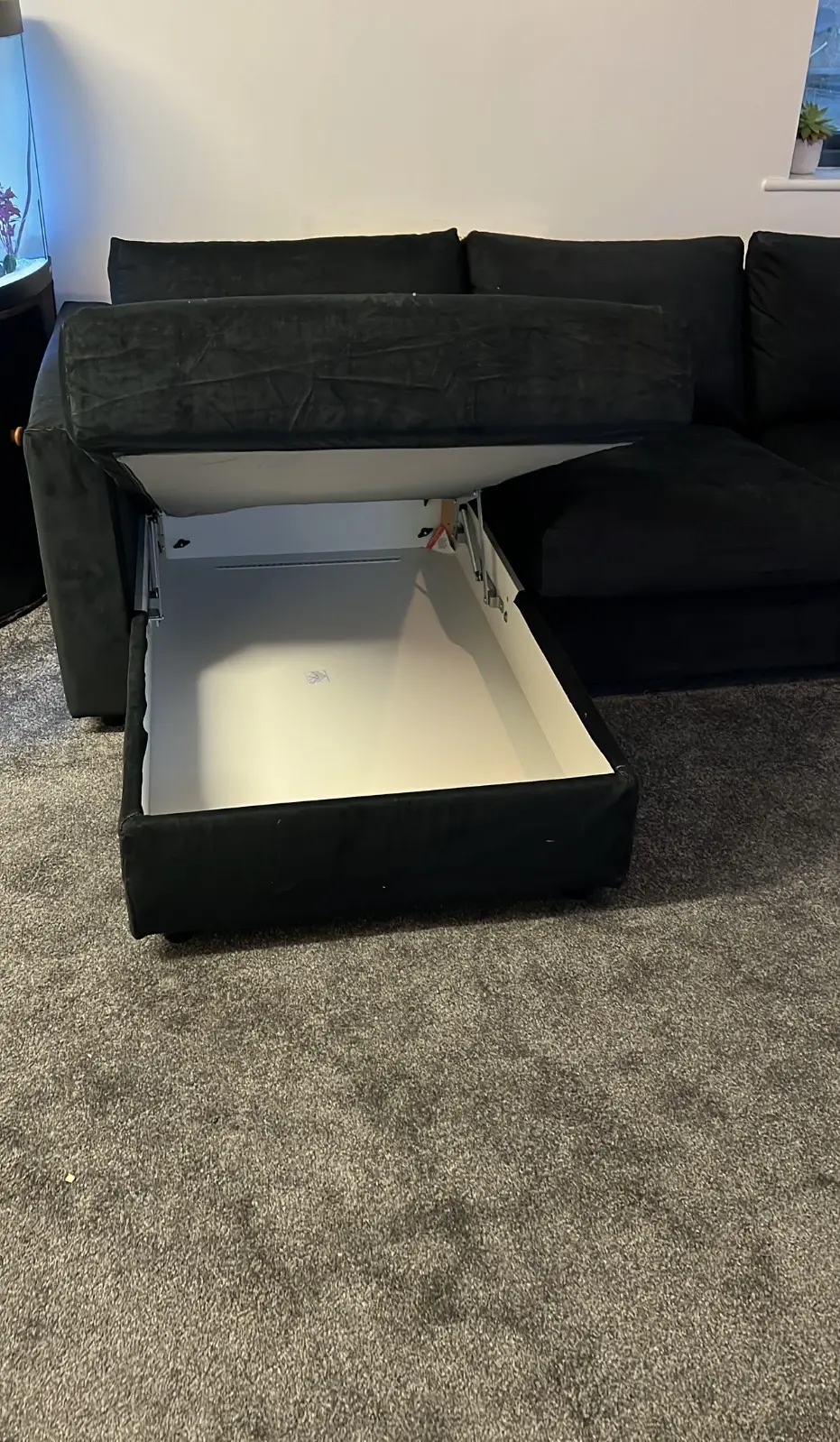 The chaise has large storage underneath. The seat cover zip for the chaise is broken. It doesn’t enable me to remove it but someone who’s good with zips would be able to fix it – happy to provide extra photos of this. Doesn’t prevent the cover from staying on & can’t be seen.