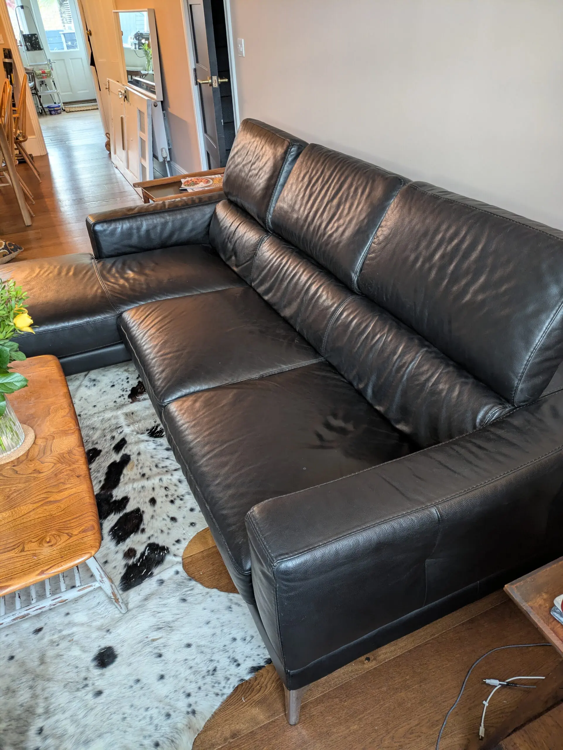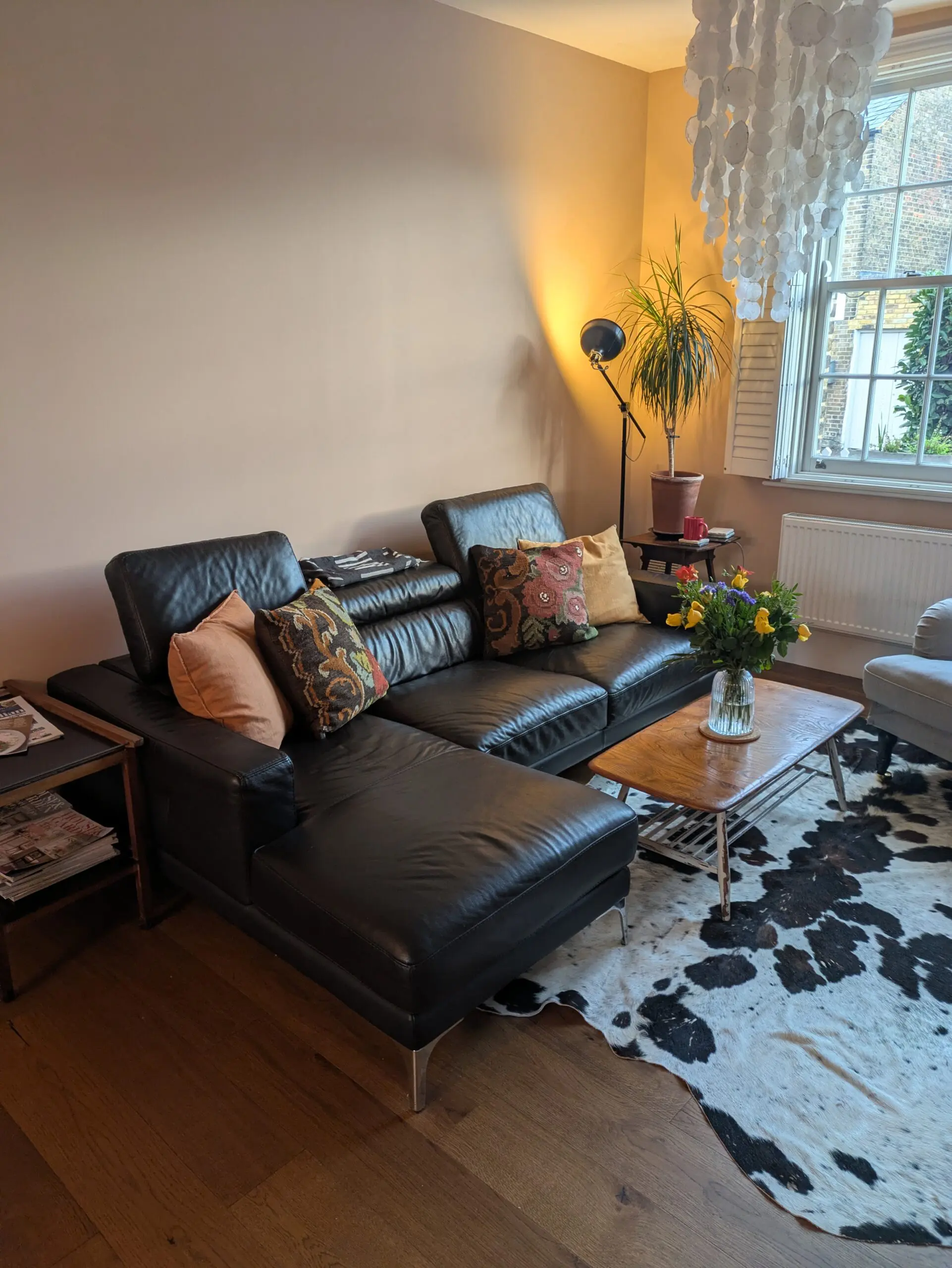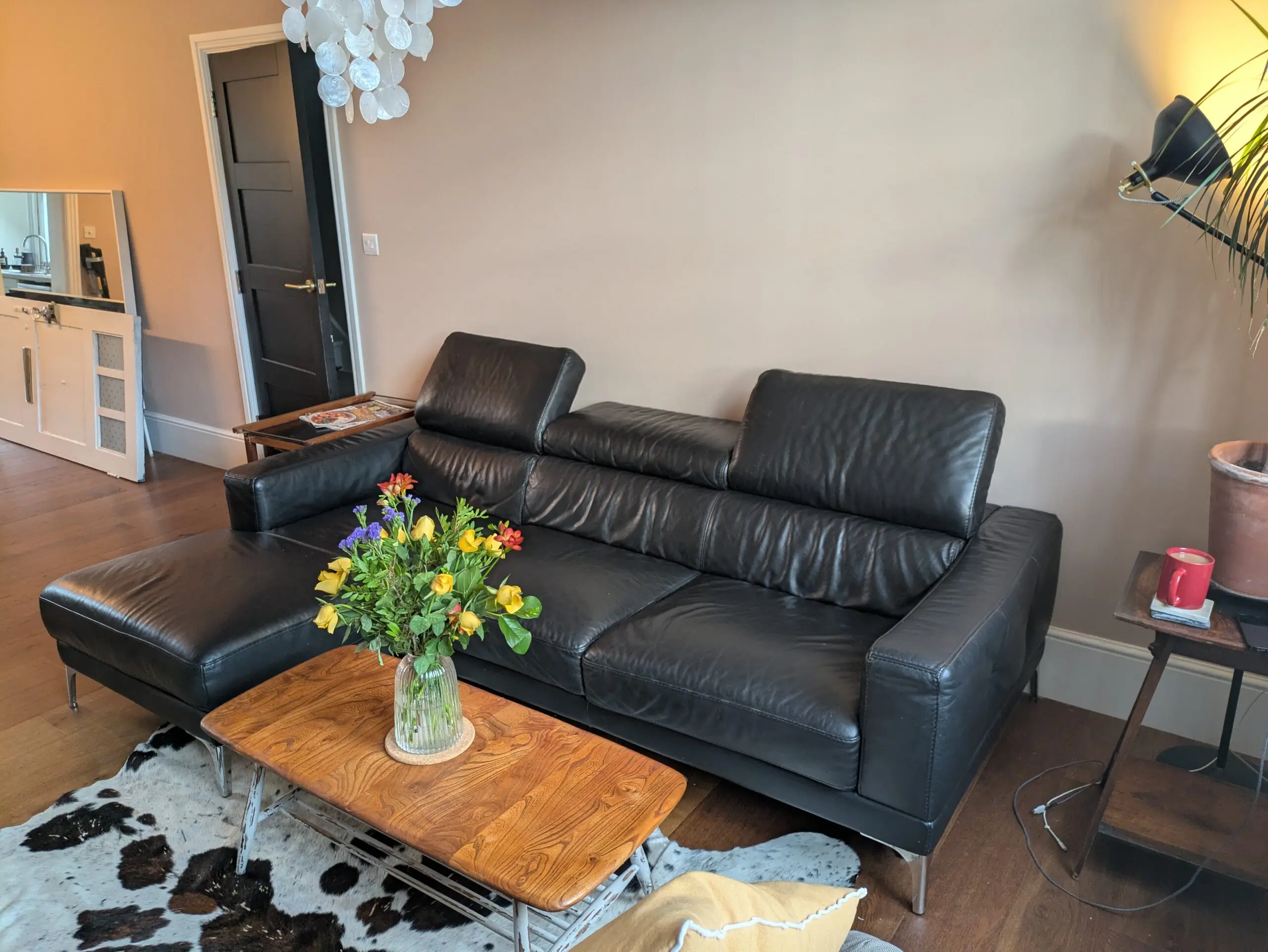 Beautiful and timeless mid-century real leather Italian L-shaped (right-armed) sofa with chrome legs. Head rests can be moved up and down. I’m told it was £5,000 new, I bought it as vintage (unknown brand) and we’ve had it for less than 9 months (child/pet/smoke-free home) but there are no signs of wear and tear. It separates easily into two segments for easy delivery. Collection only.