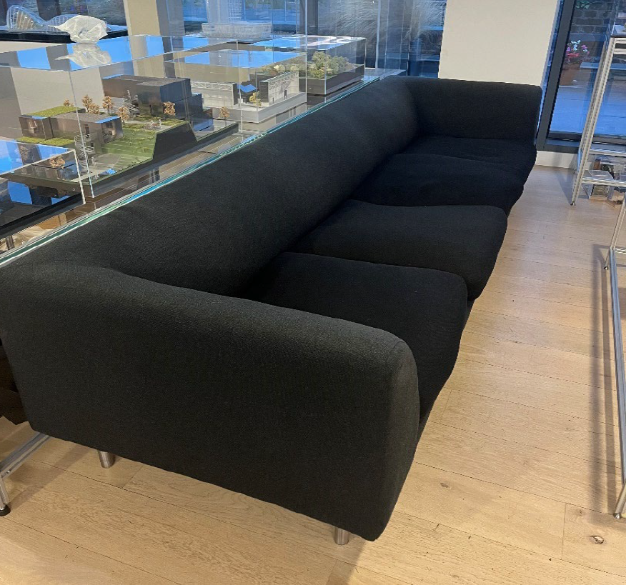 A modern, minimalist black fabric sofa with clean lines. It has rounded arms and back, a low profile, and metal cylindrical legs.