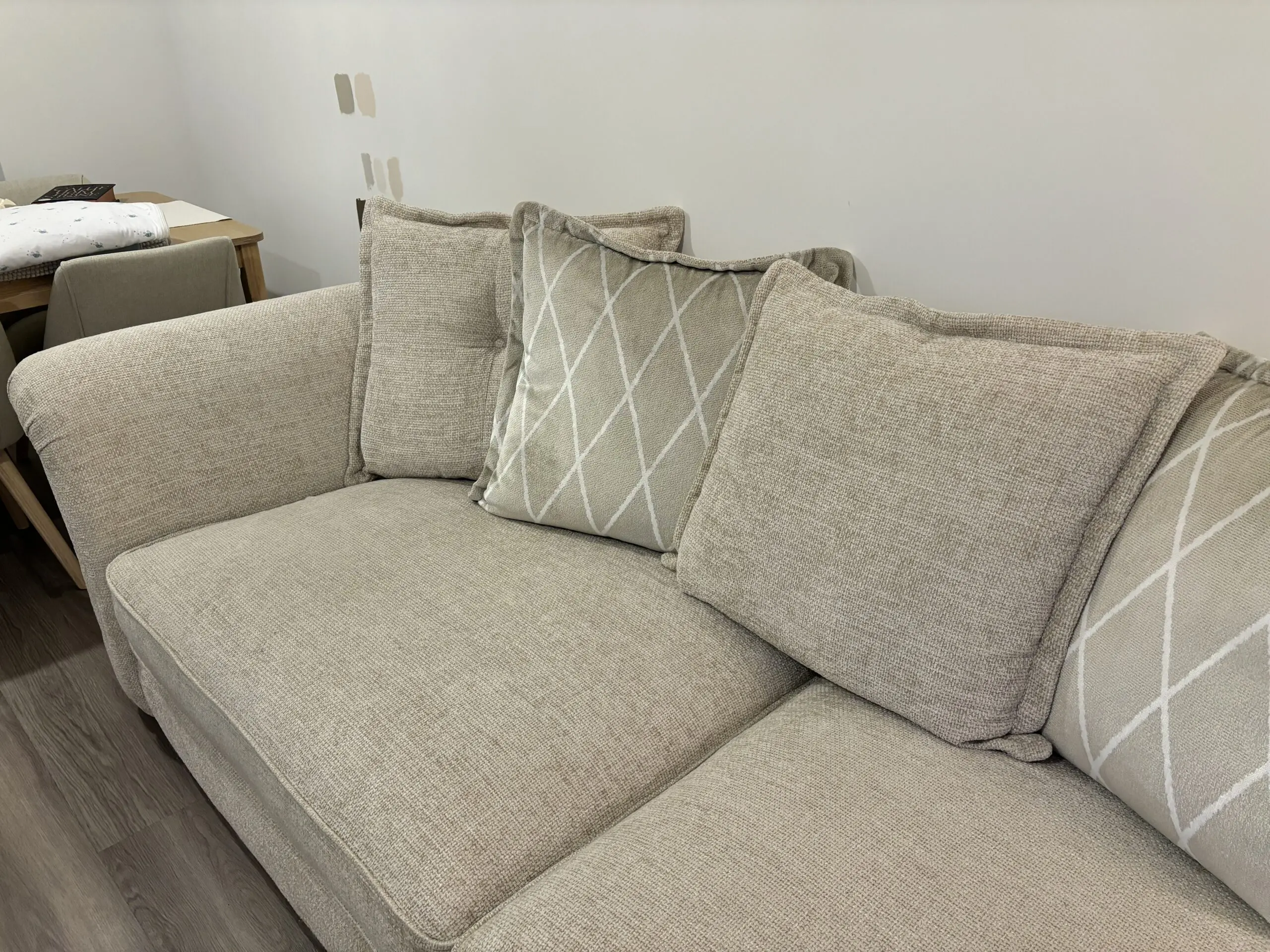 Oak Furniture Land Dewsbury 4 seater sofa. Sofa comes as a cushion back. Cream colour. Only had for one year, like new. Small mark on back of sofa as seen in pictures. Sofa can be dismantled in half for transport.
