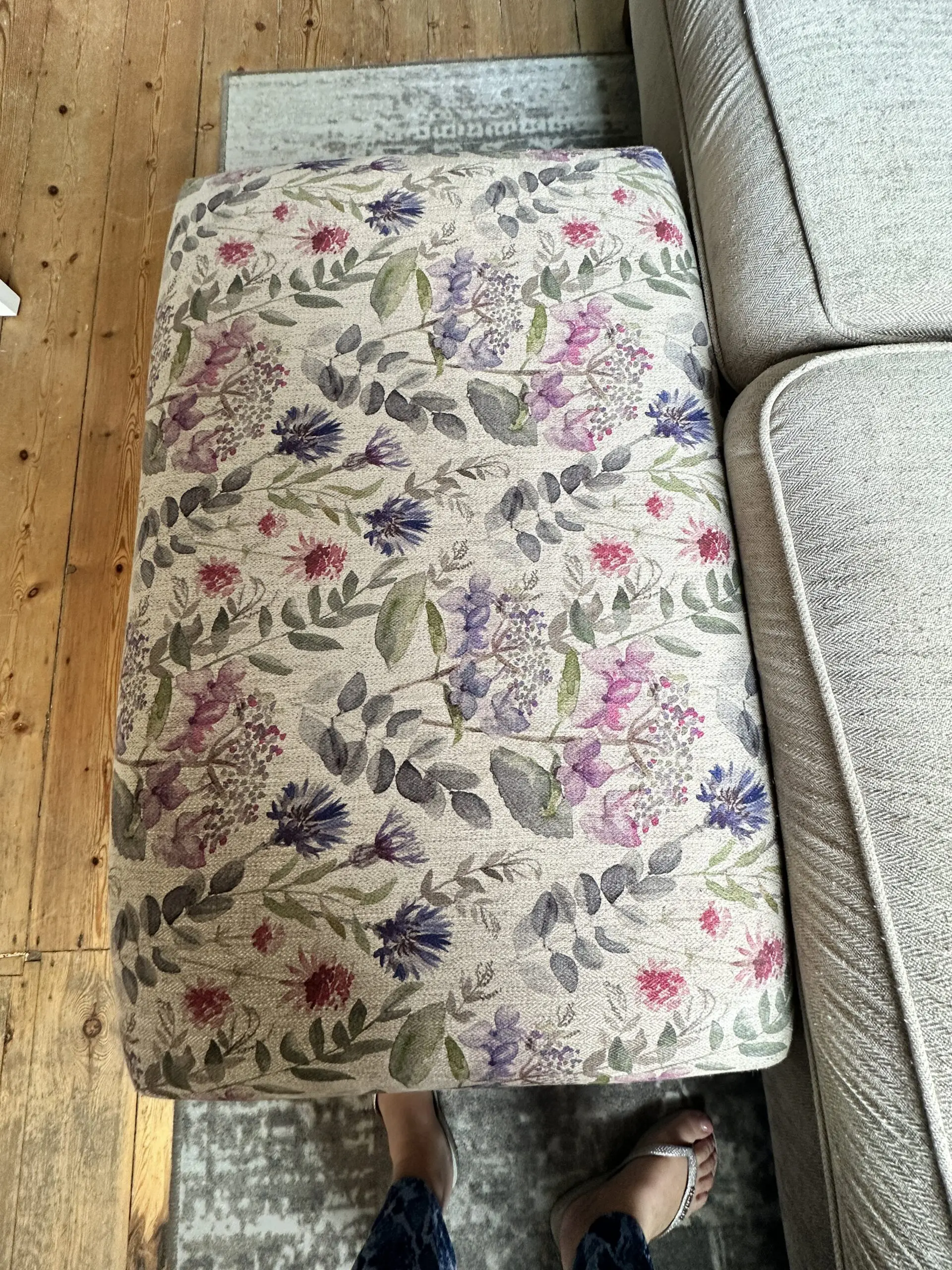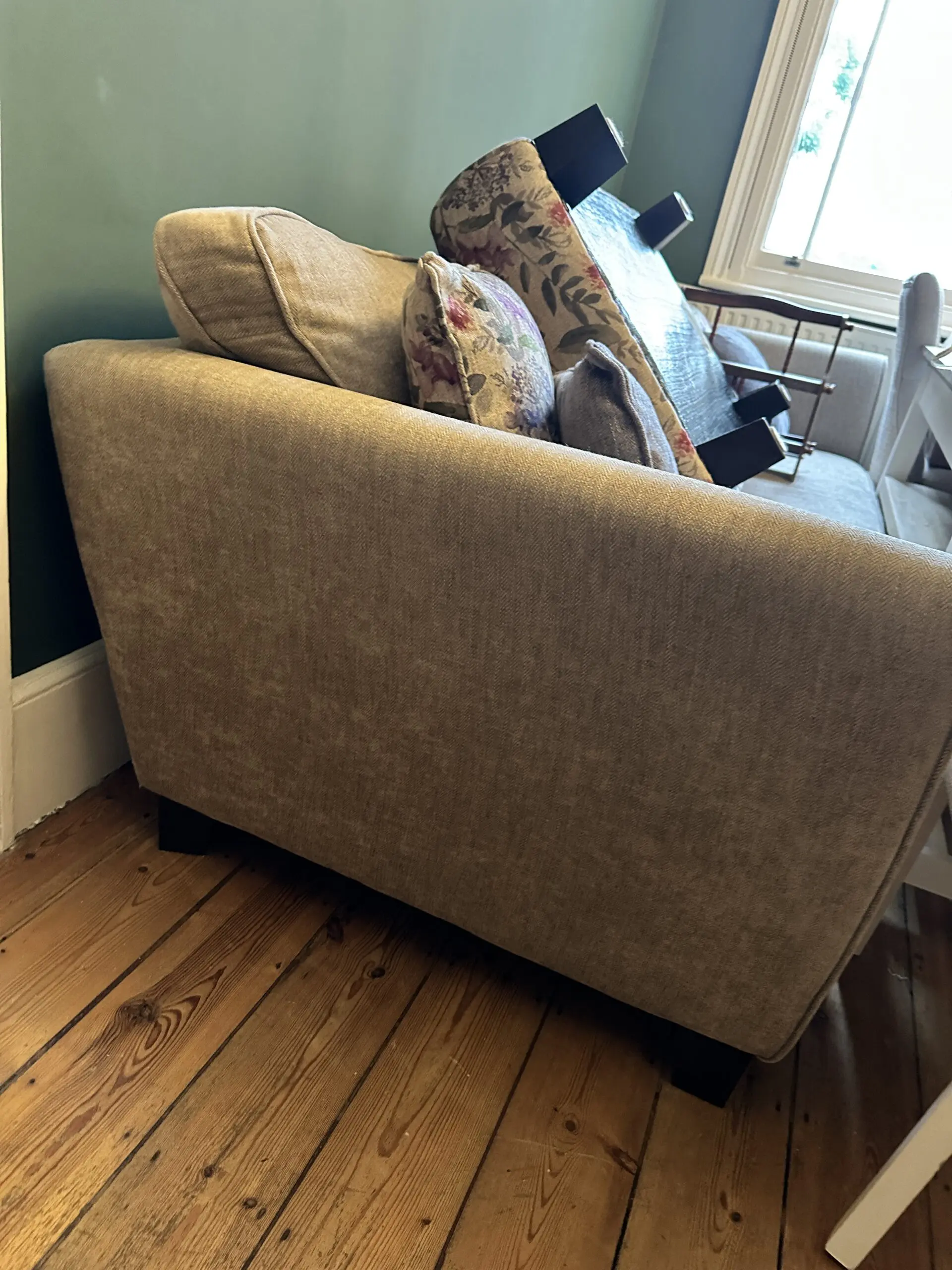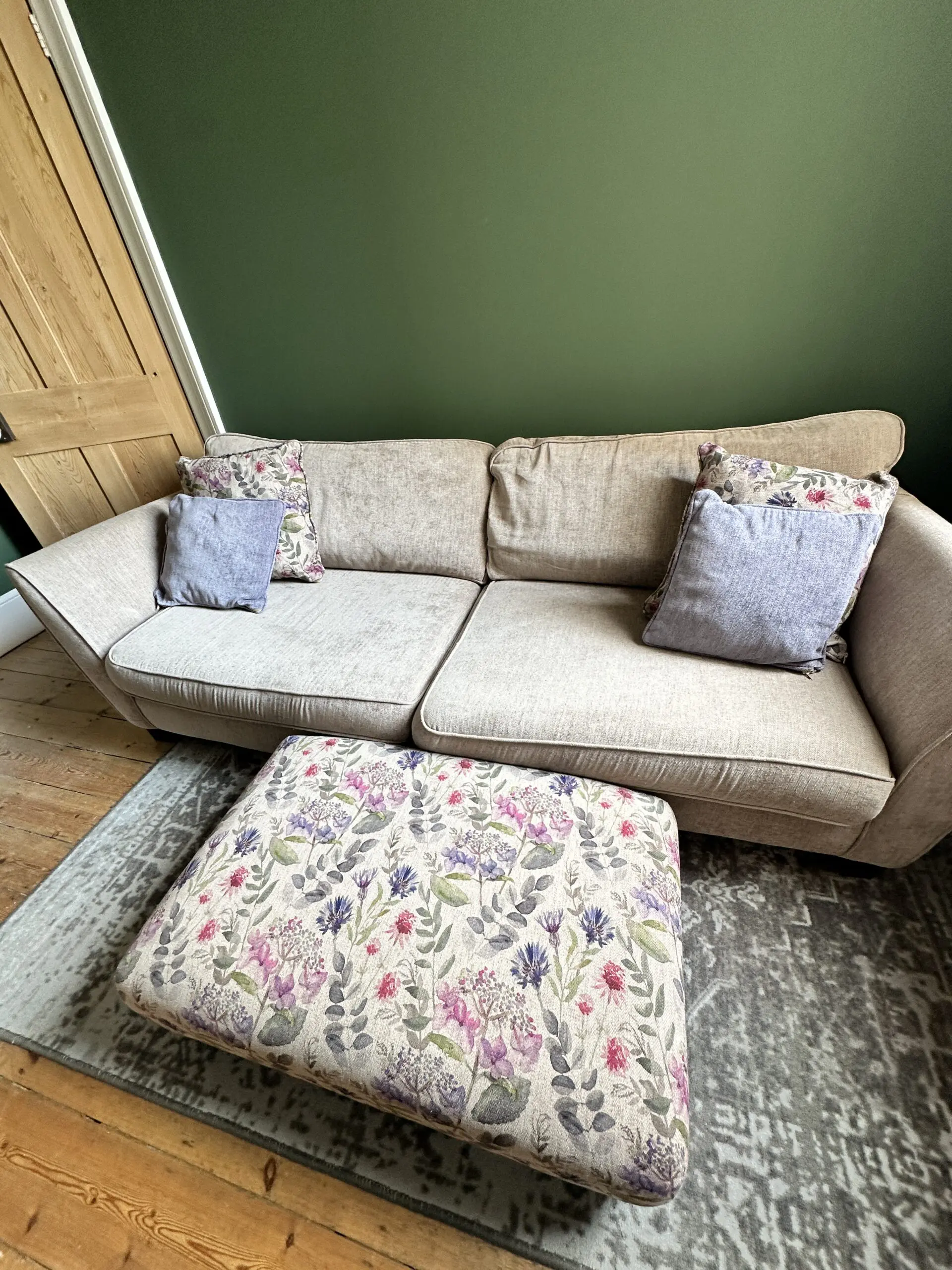 Beige 4 seater. So comfortable. Comes with two matching cushions. Two floral and two purple. Has dark wooden feet. Comes with floral footstool ( Foot stall 97x60cm and Height 29cm)