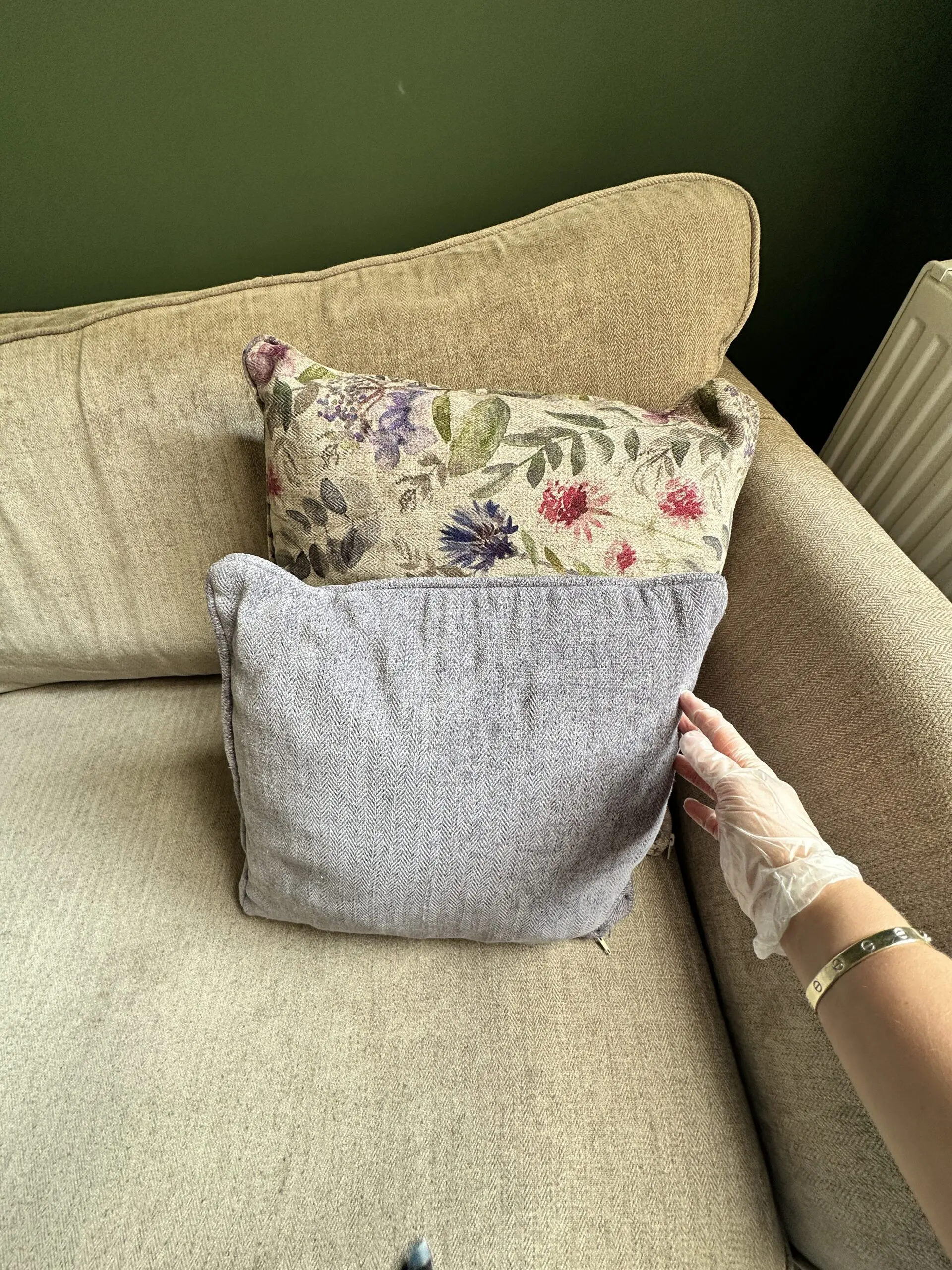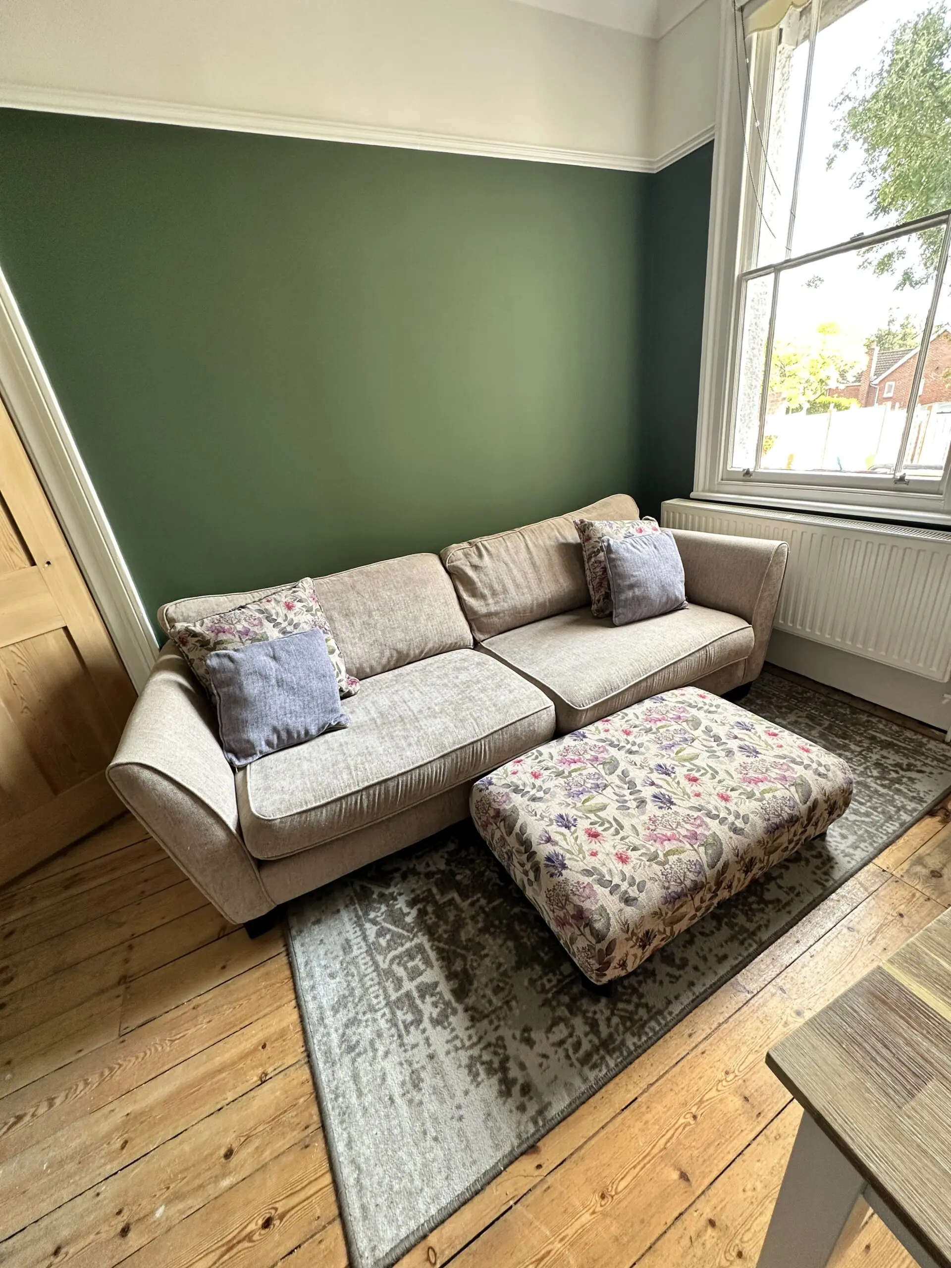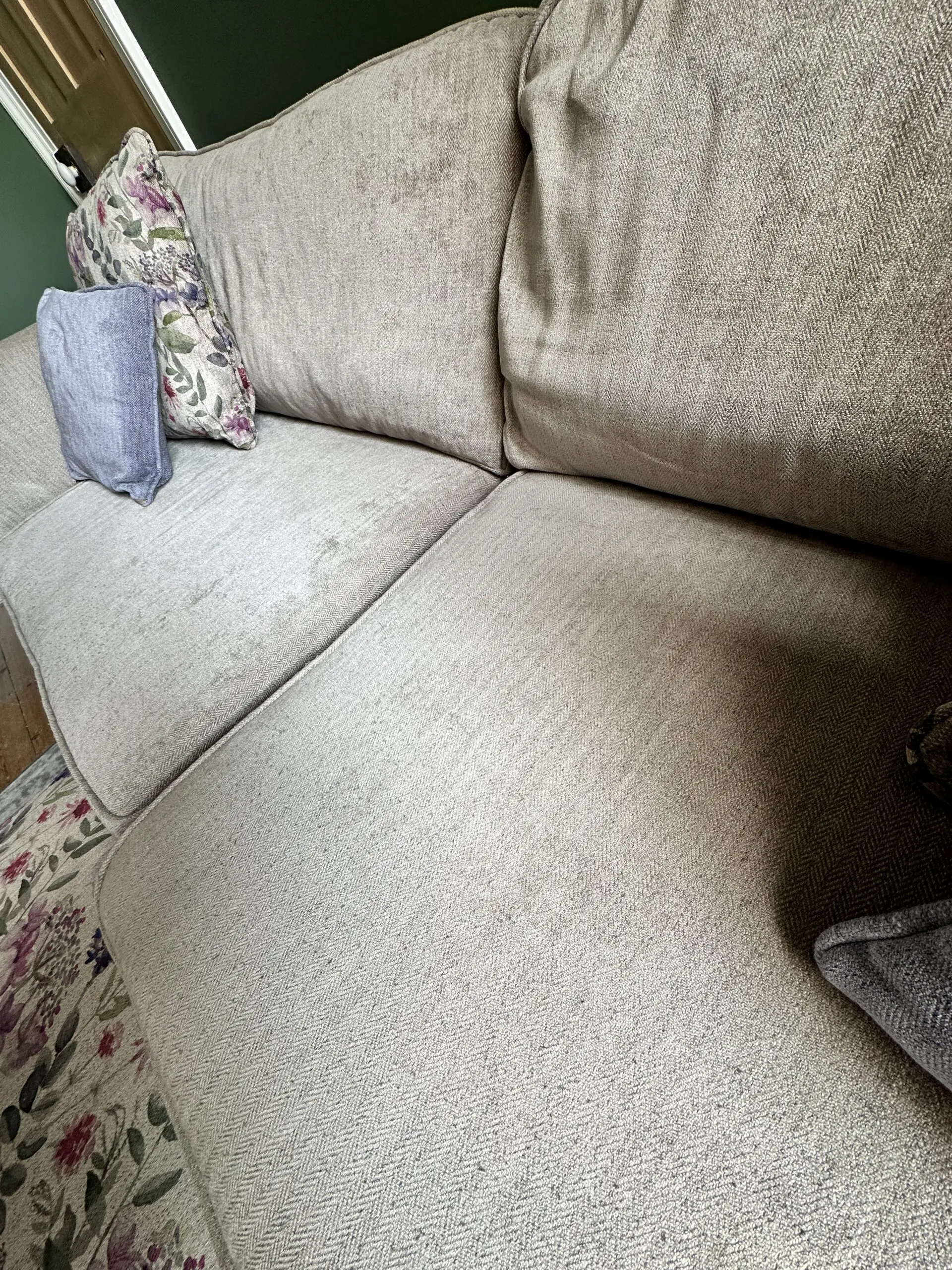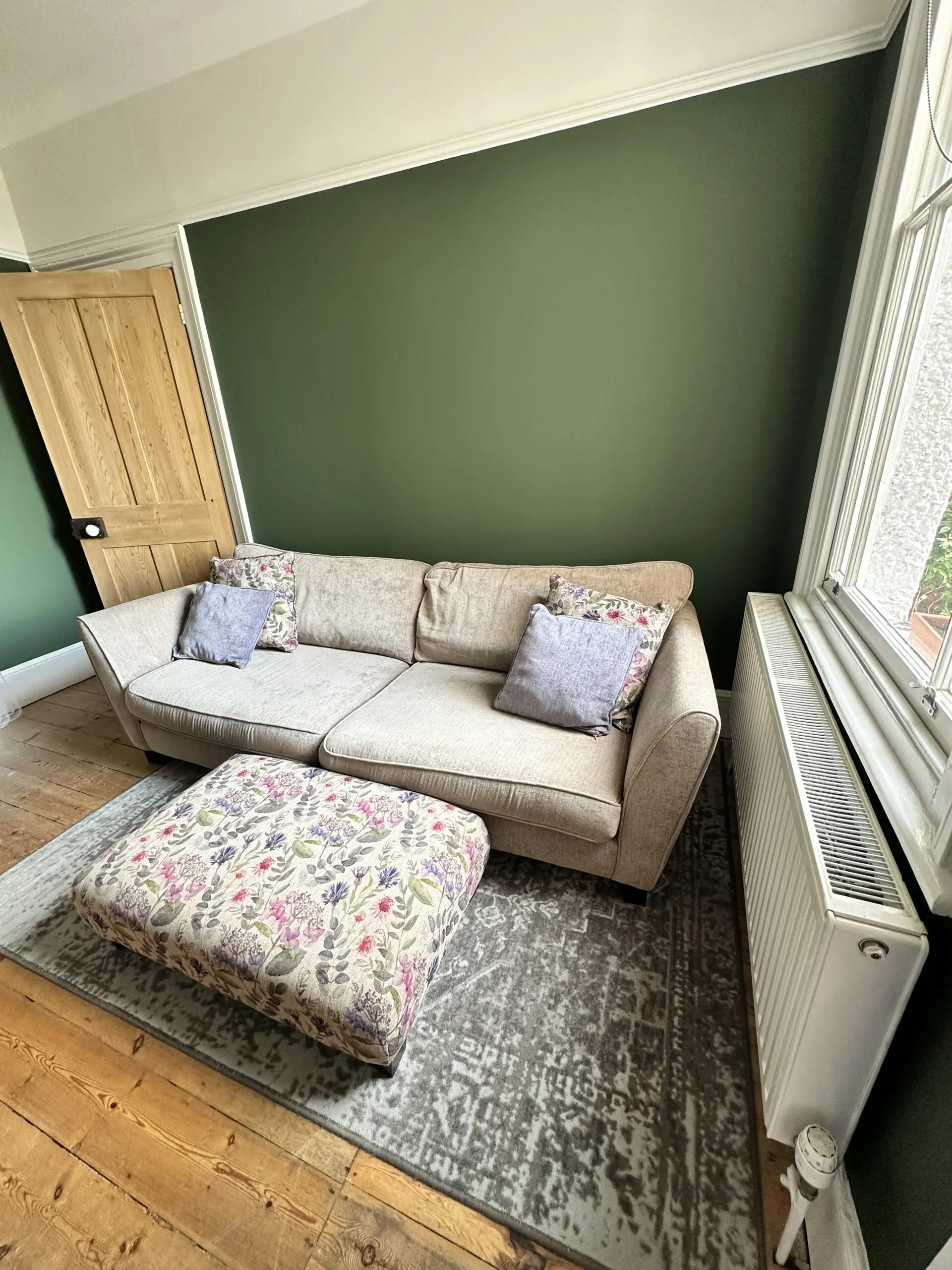 Beige 4 seater. So comfortable. Comes with two matching cushions. Two floral and two purple. Has dark wooden feet. Comes with floral footstool ( Foot stall 97x60cm and Height 29cm)