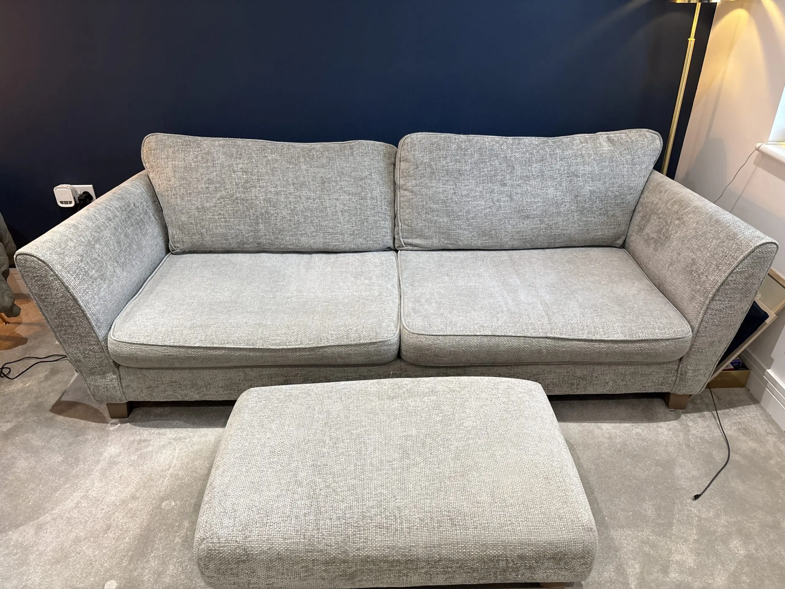 Excellent condition 4 seater sofa with designer footstool. Dove granite grey with light wood feet. Non smoking household, pet free.