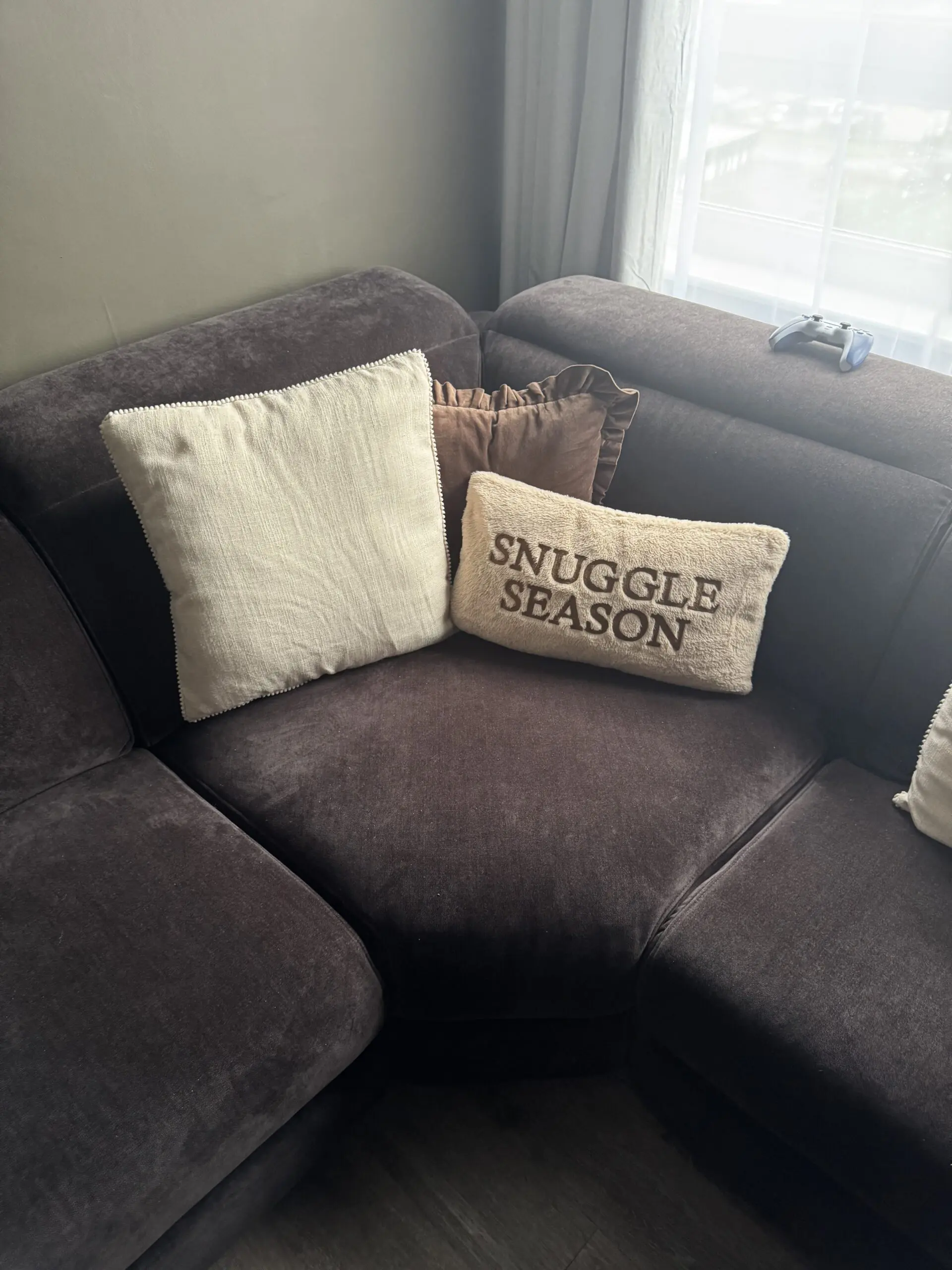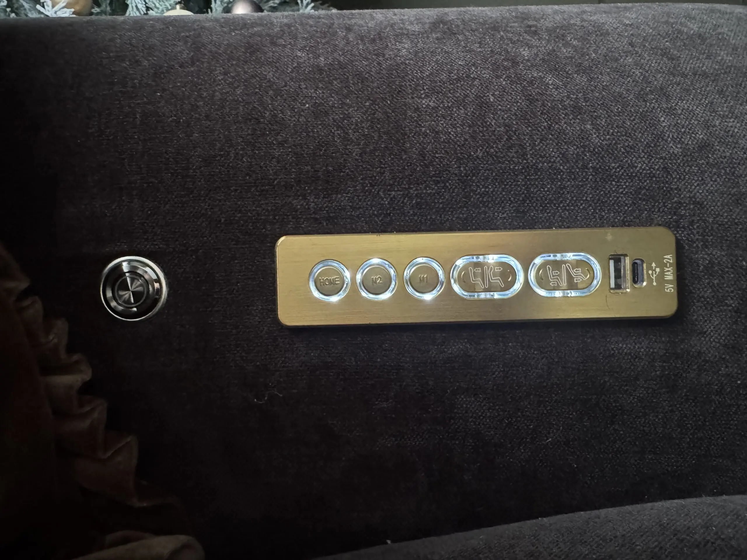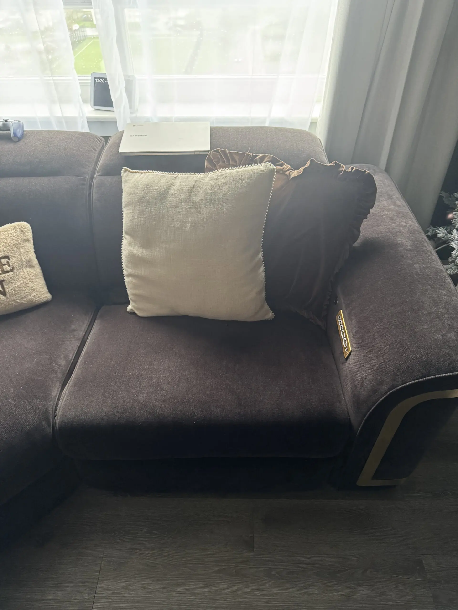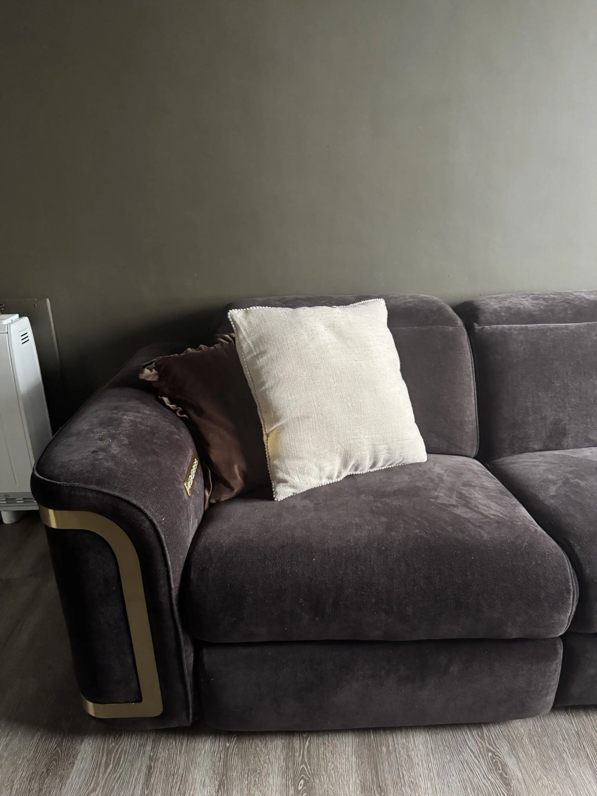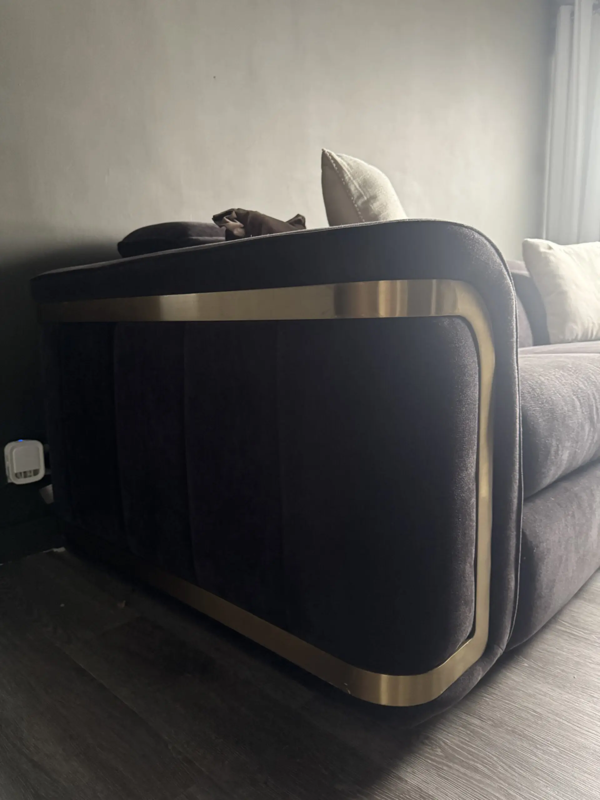 Gorgeous sofa from Sofology, Black Chenille Fabric and Gold Trims. Heated Seats, Charger Ports, Head and Leg Recliners and can save your preferred setup. Was bought for £4000