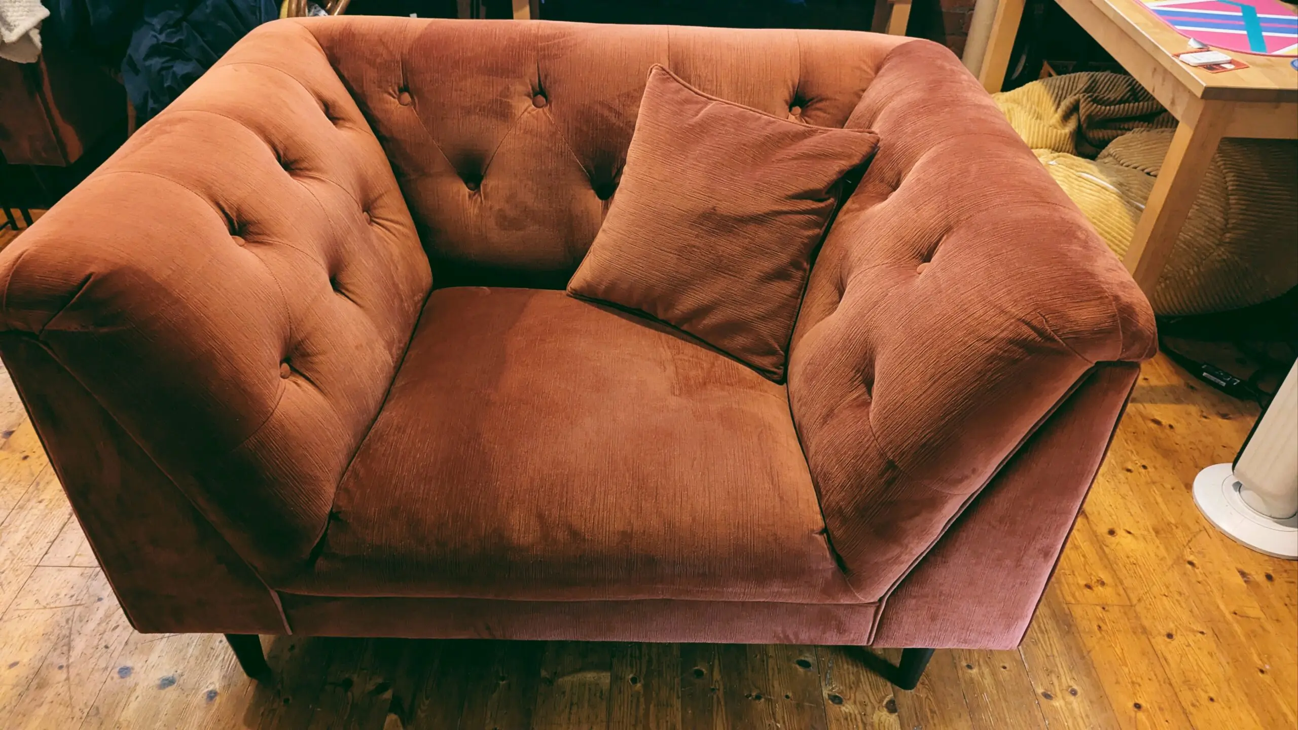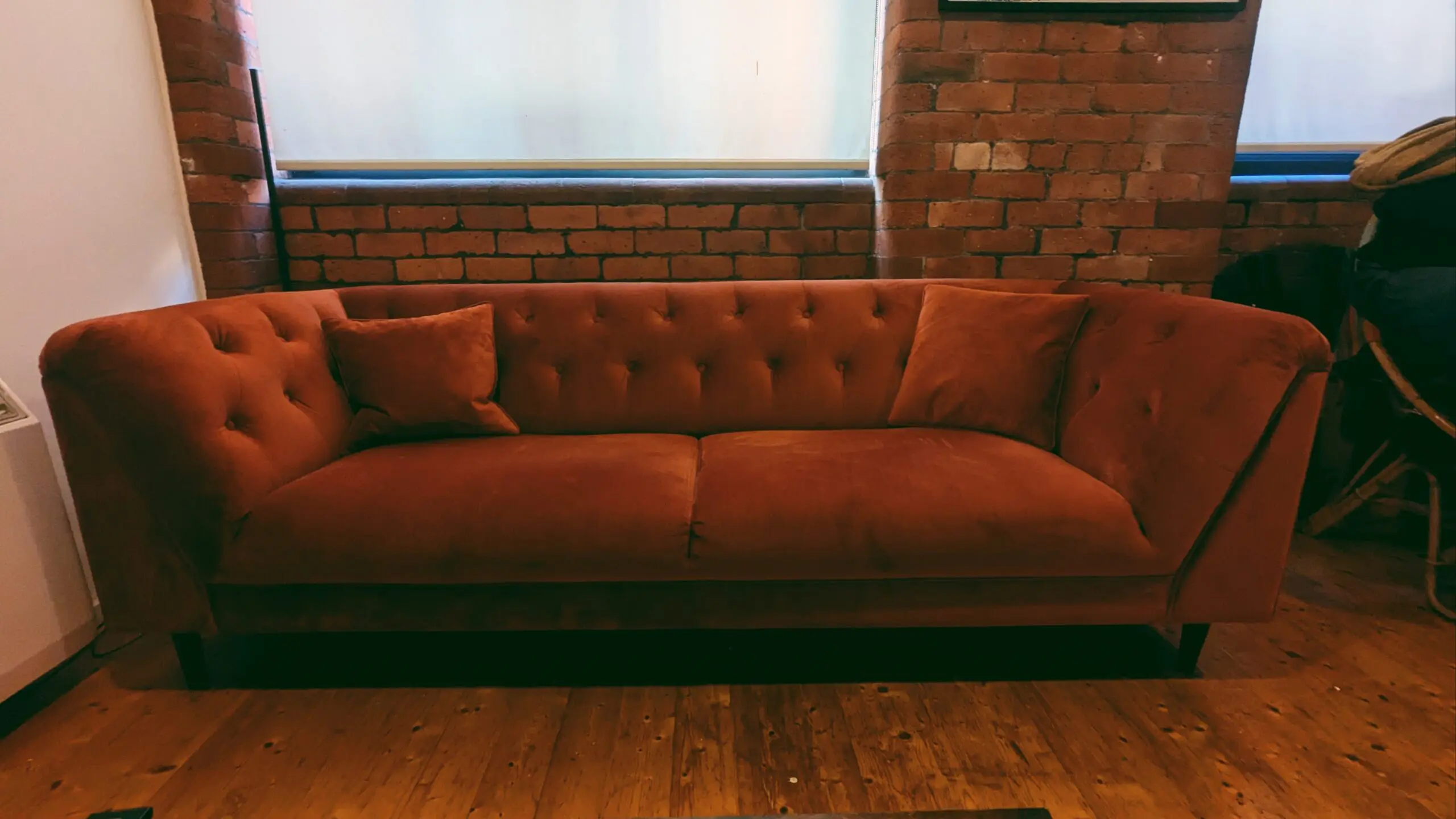 This stylish 4-seater sofa makes a perfect statement piece for any living room with its distinctive button-tufted back design. The curved arms and deep seat cushions offer comfortable seating for two people, whilst the sleek wooden legs add a modern touch. Its compact size makes it ideal for smaller spaces, apartments, or as additional seating in larger rooms. The rich colour complements both contemporary and traditional interior styles beautifully.