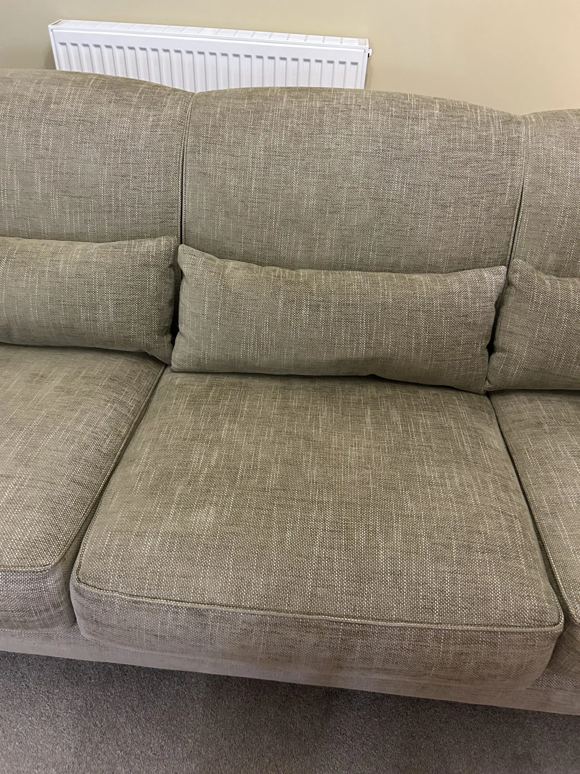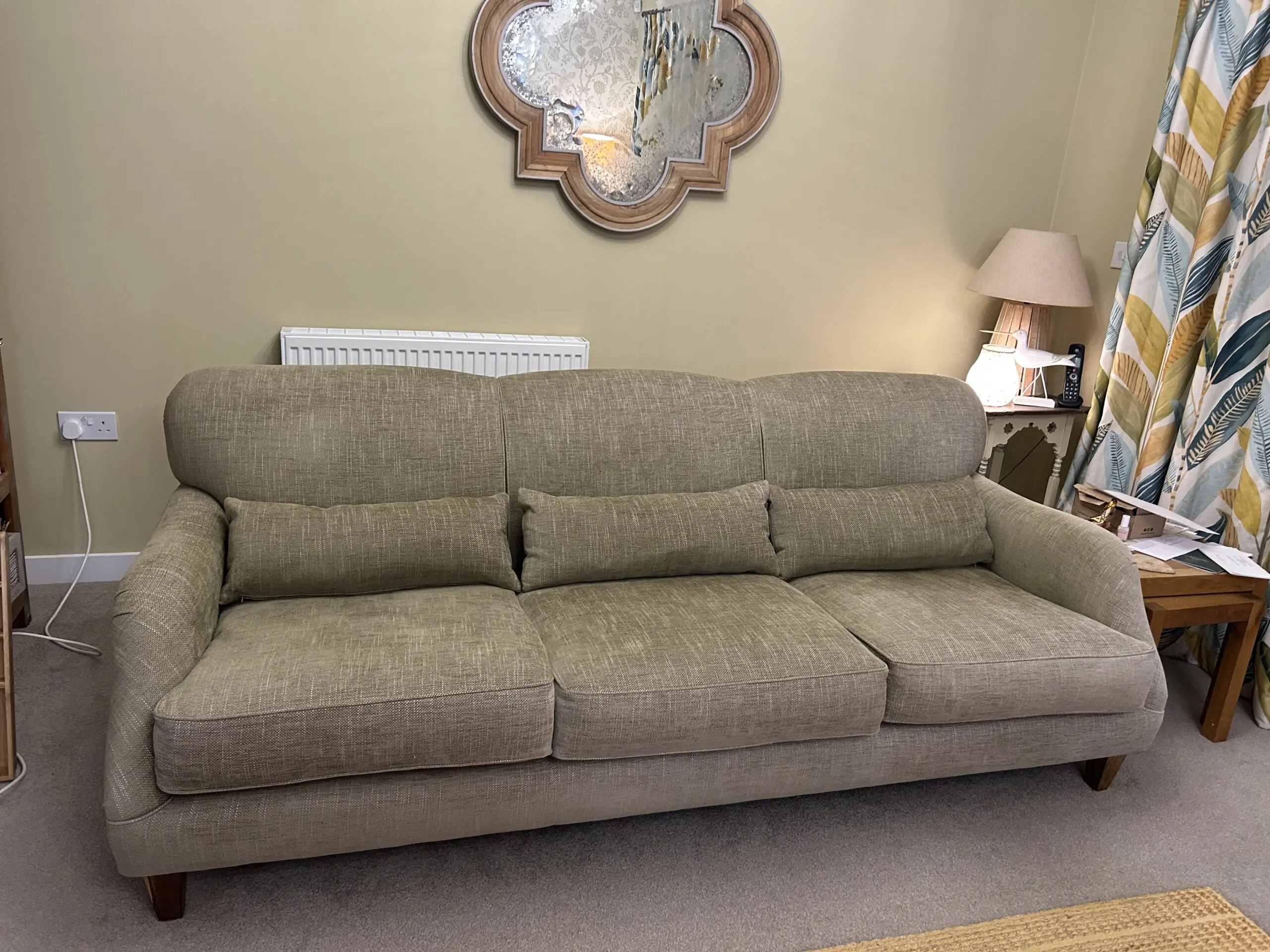 Beautiful Grand size four seater Tamarisk sofa from the Loxton range. Manufactured to order less than a year ago – house move forces sale. Manufactured in a tweed material for durability and easy cleaning. Incredibly comfortable. In a very soft green. Goes with many colour schemes. When new cost £3,275.00