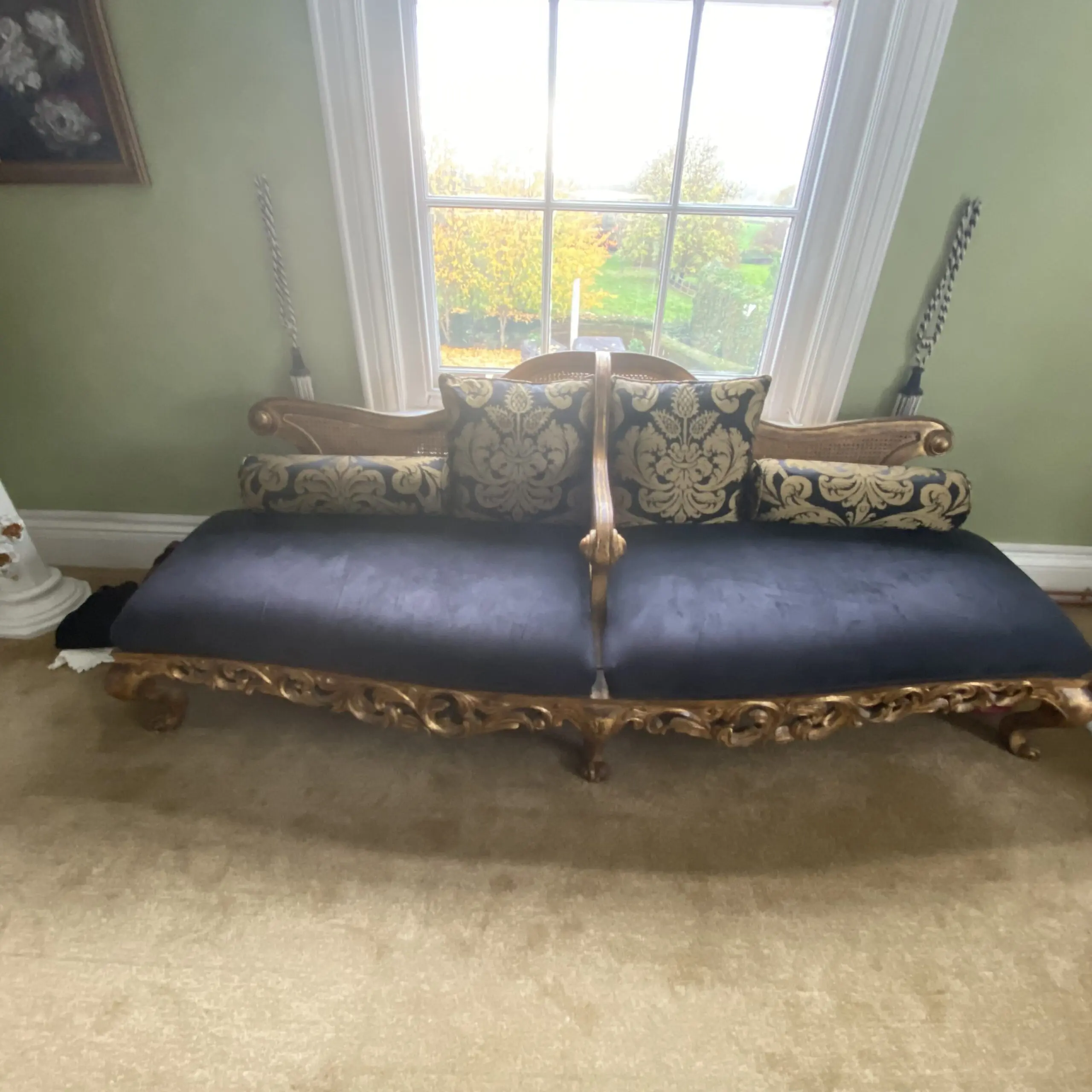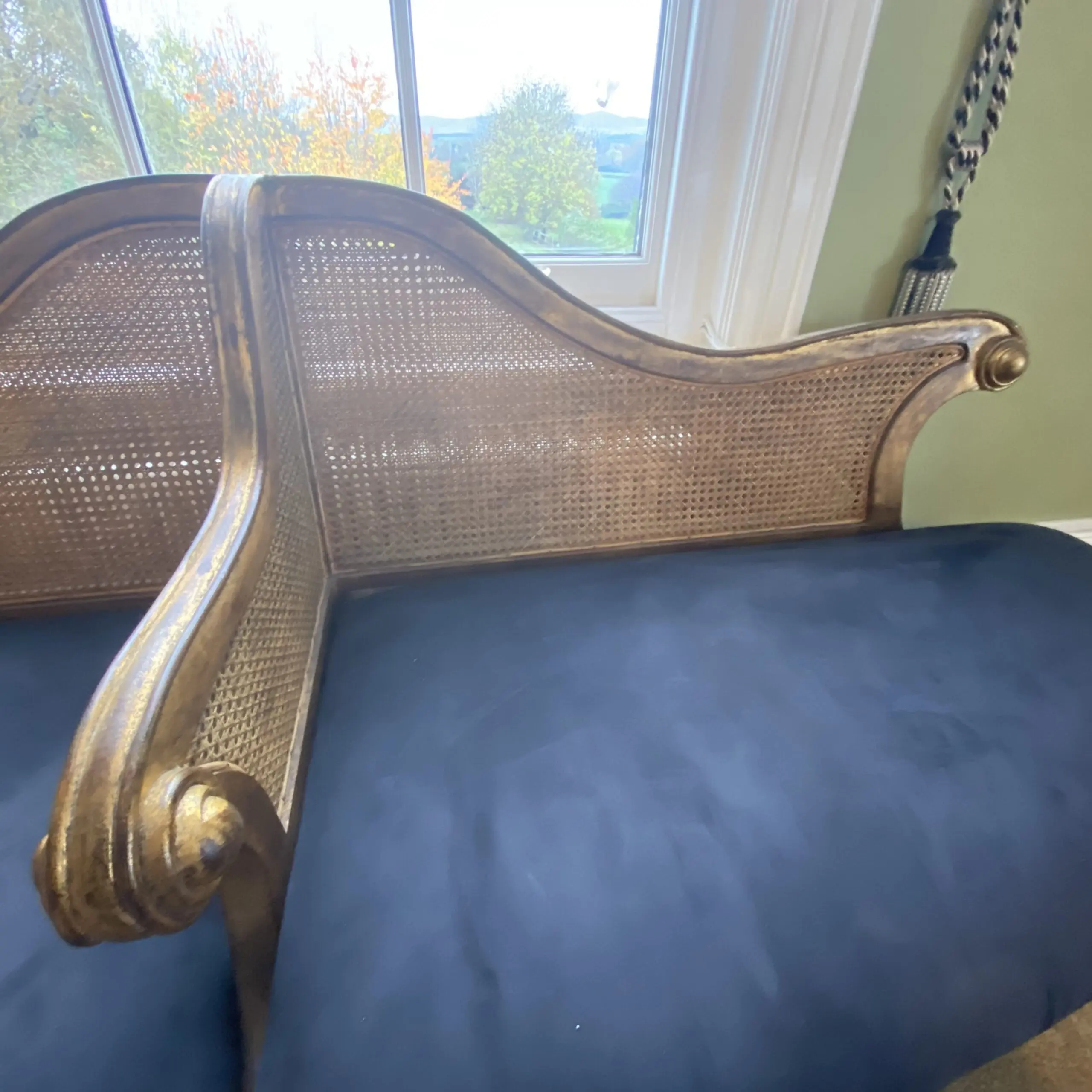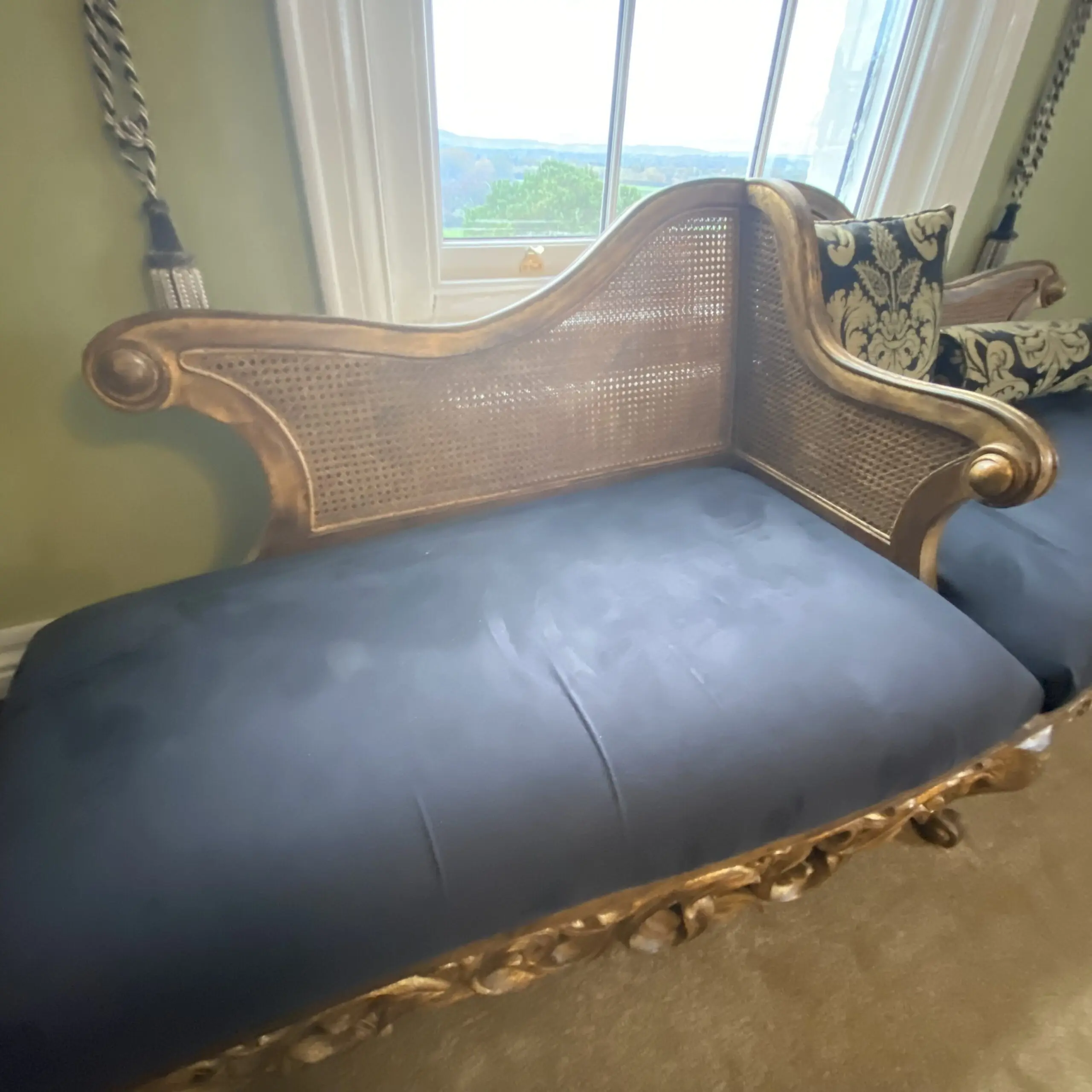 Impressive antique French style chaise longue in blue and gold which is in excellent condition.