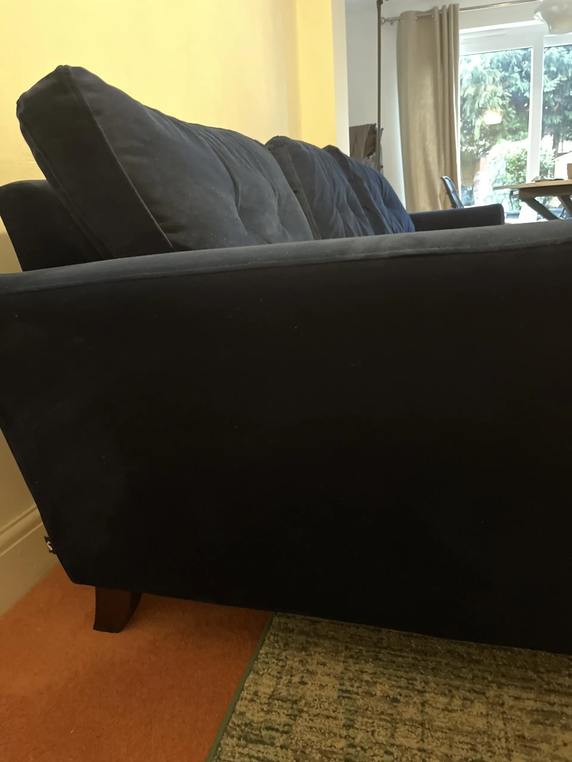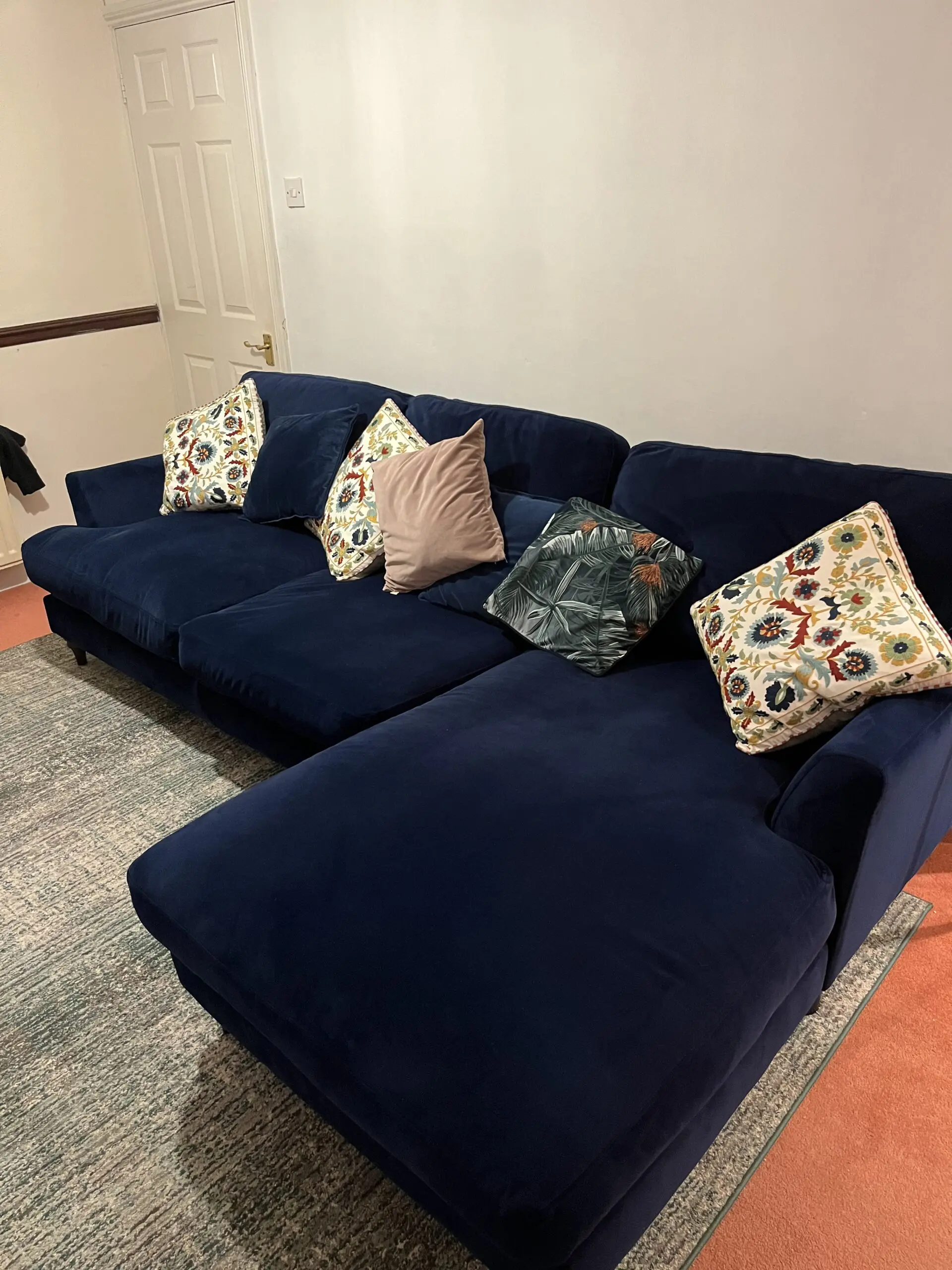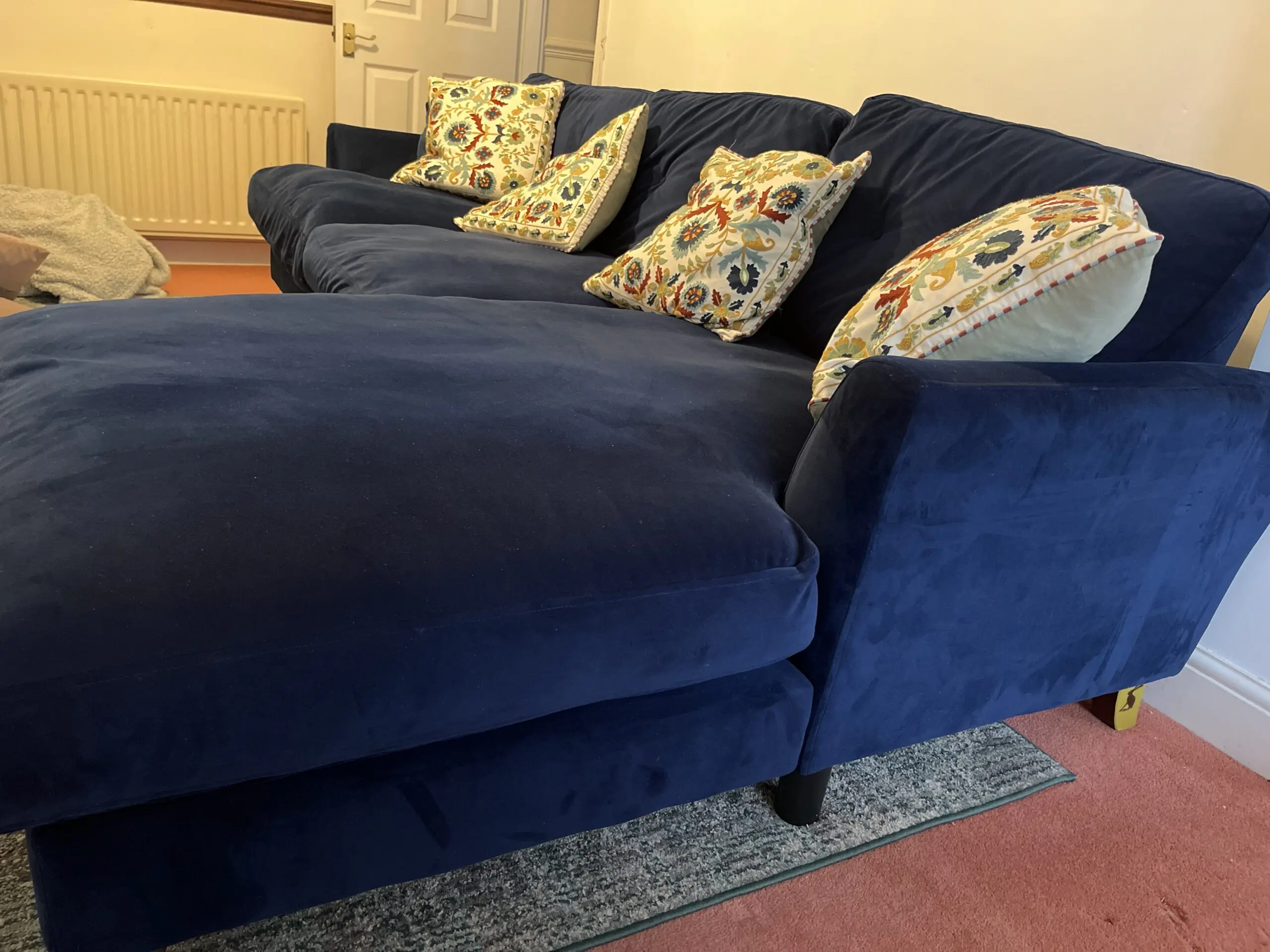Joules for DFS – Patterdale velvet right hand facing chaise sofa in navy blue with walnut colour feet