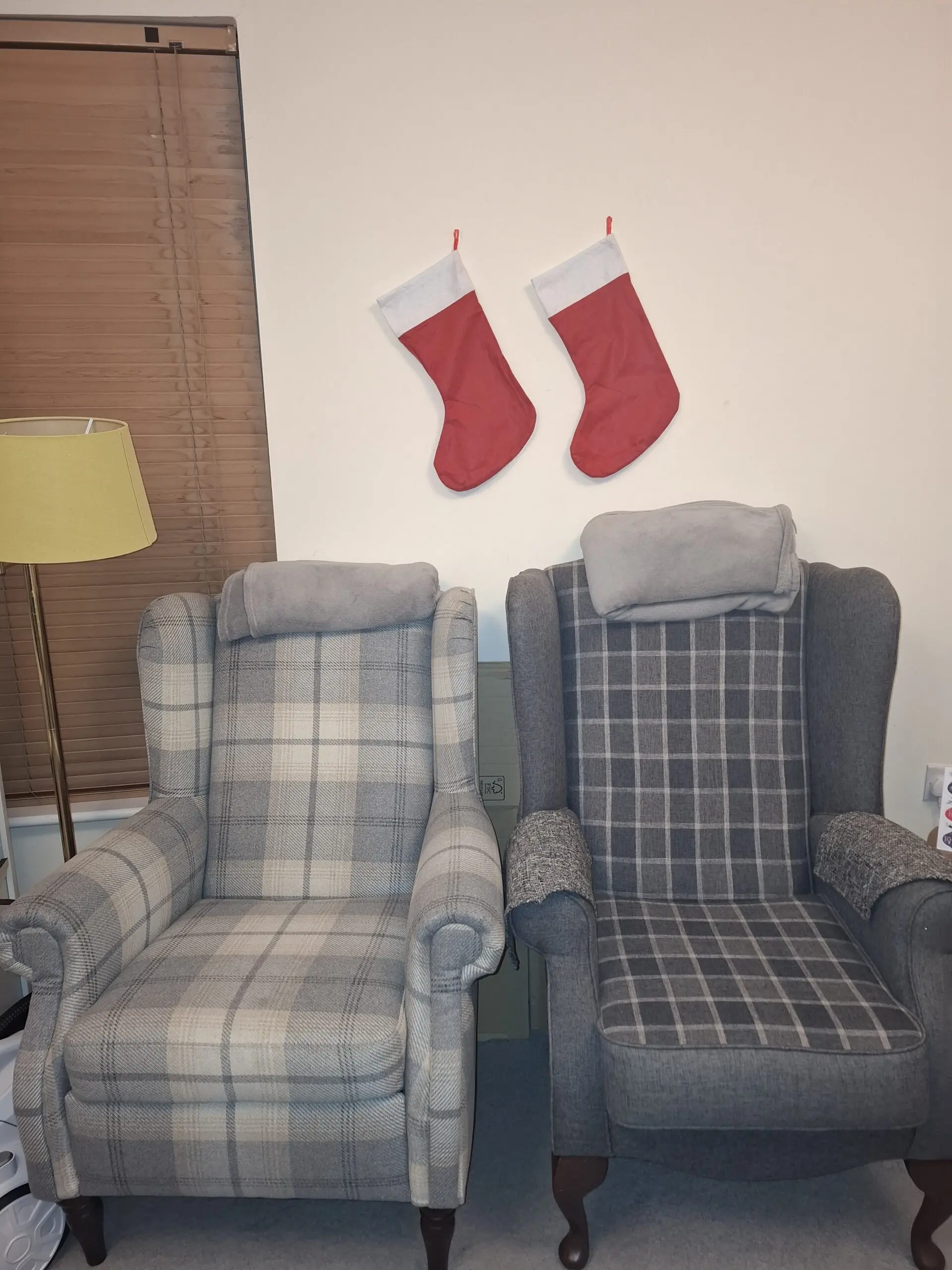 One is grey and the other is beige. Both good condition. Only one small stain on the beige sofa. Not as noticeable in person.