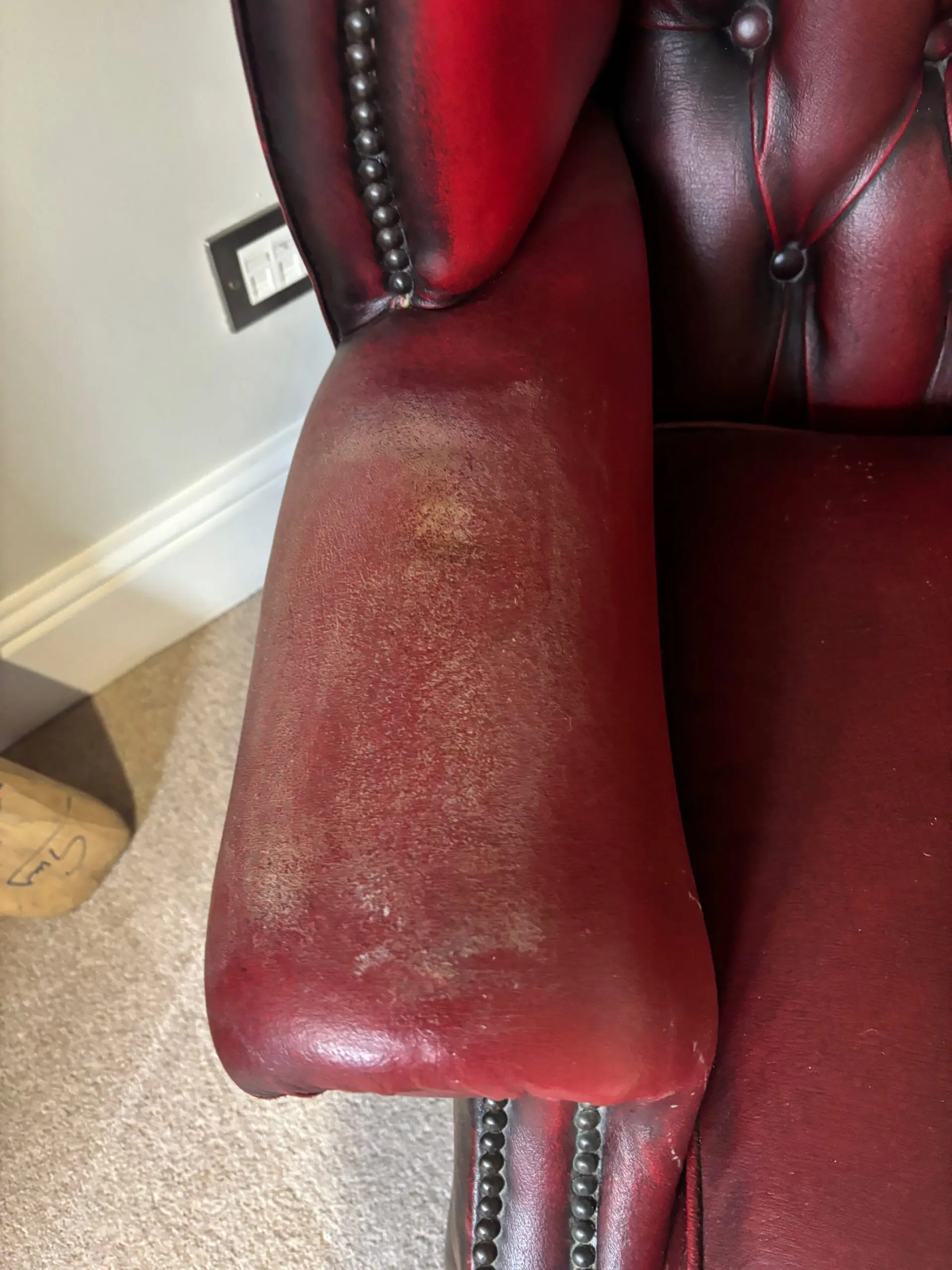 Wear and tear on the arms which has been repaired in the past. These chairs have a lot of life in them and I am reluctantly selling them due to lack of space.