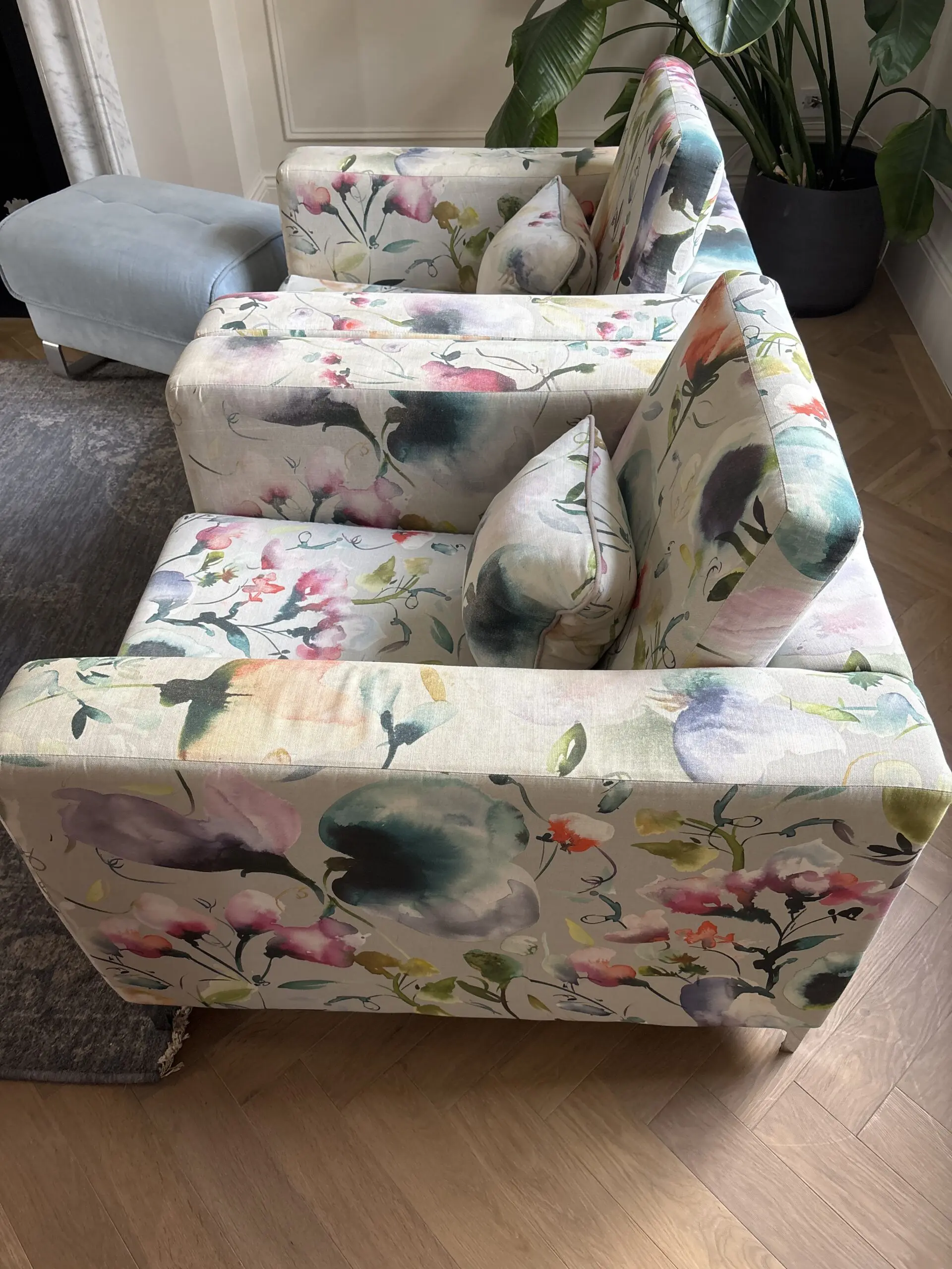 These eye-catching arm chairs make stunning statement pieces with their vibrant watercolour floral pattern featuring pinks, greens, and blues on a cream base. The contemporary design includes comfortable cushioning and clean lines that work beautifully in modern living spaces. Perfect for smaller rooms or as an accent piece. The bold botanical print adds personality and charm to any home, making it an ideal choice for those who love distinctive, stylish furniture.