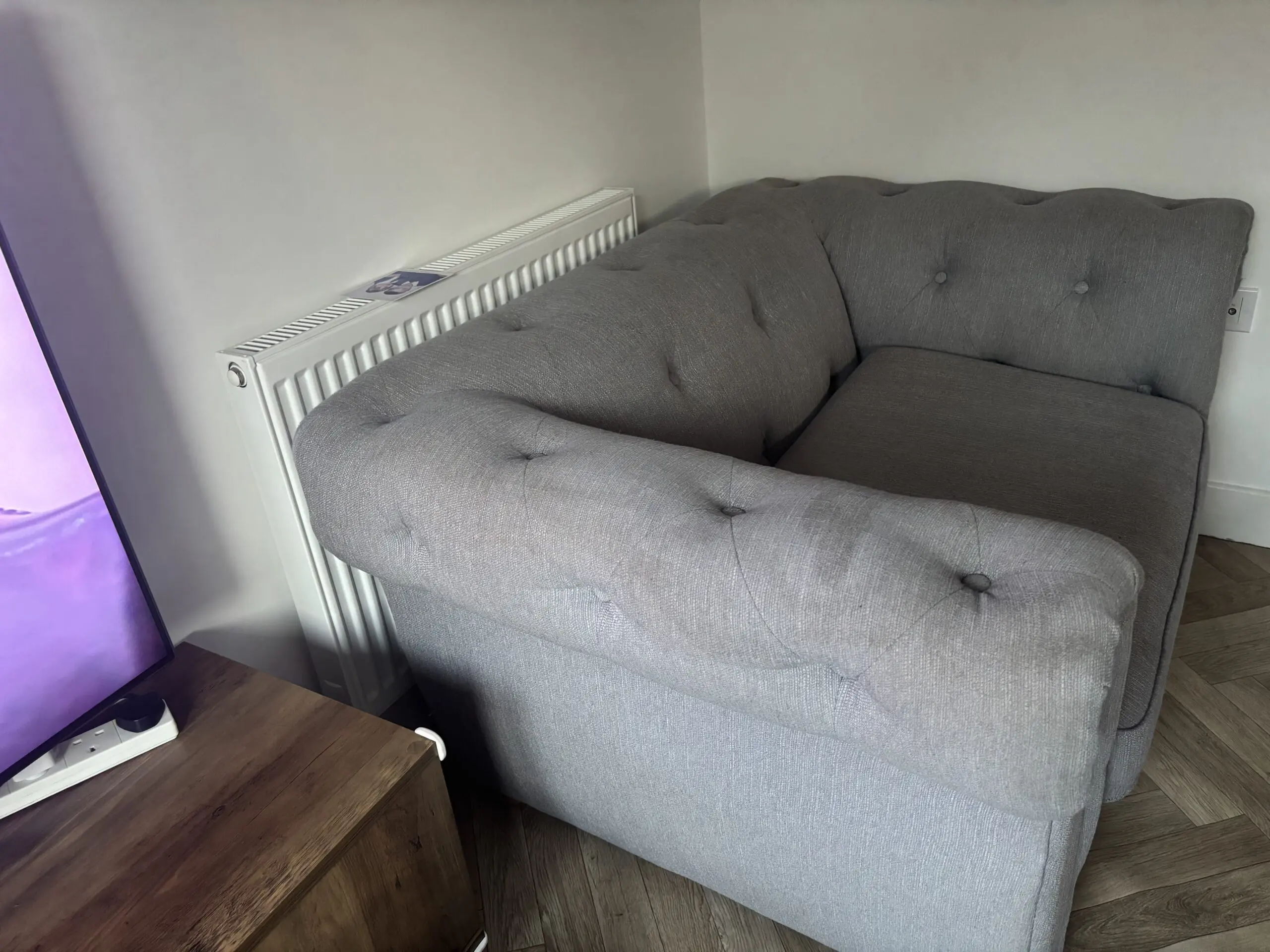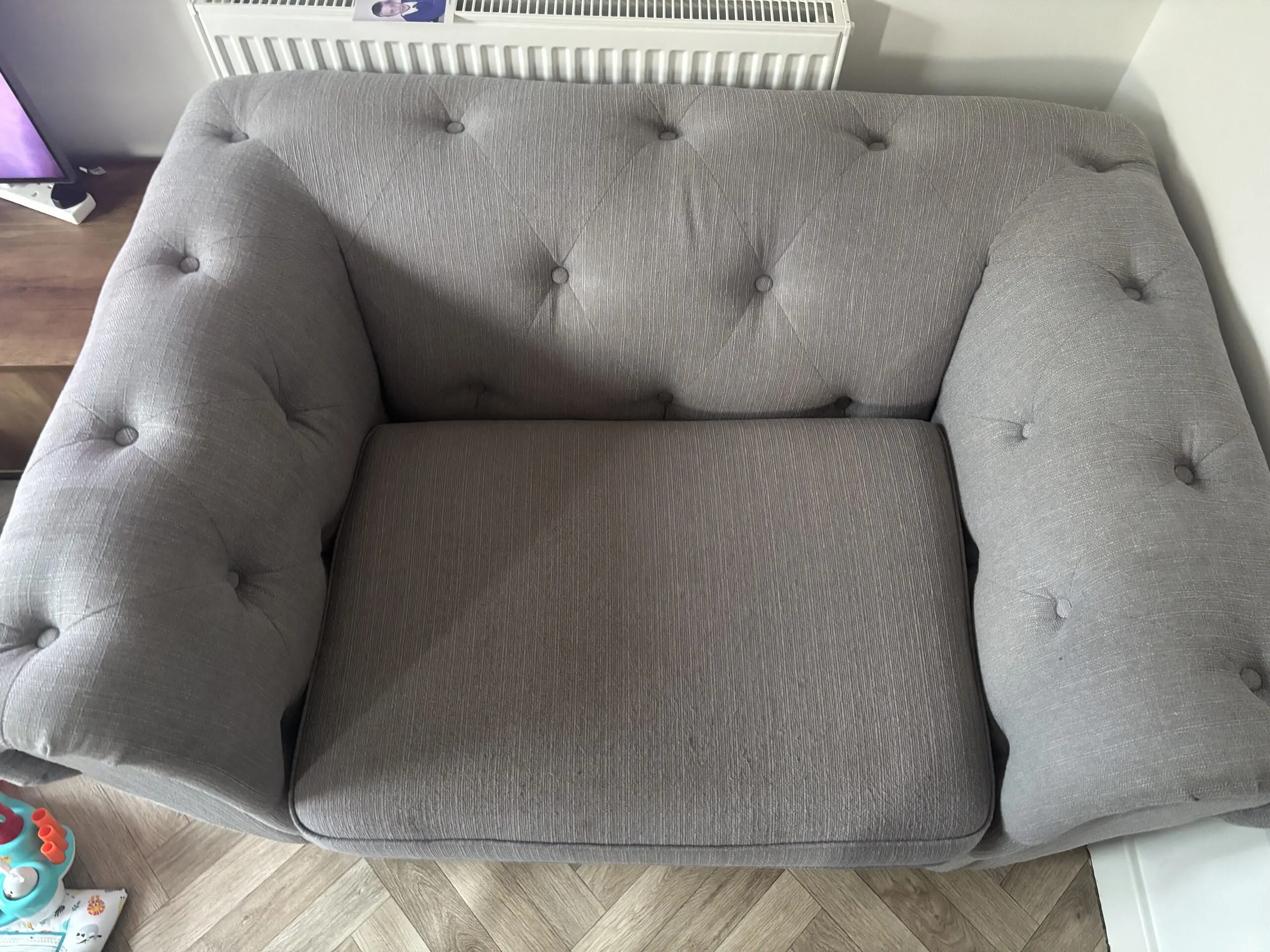 grey chesterfield sofa, 2 stains on arm rest other then that lovely spacious chair very comfortable