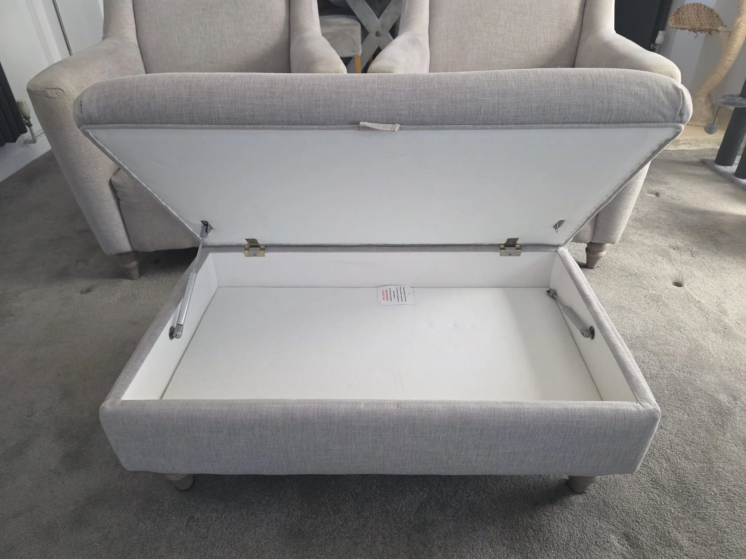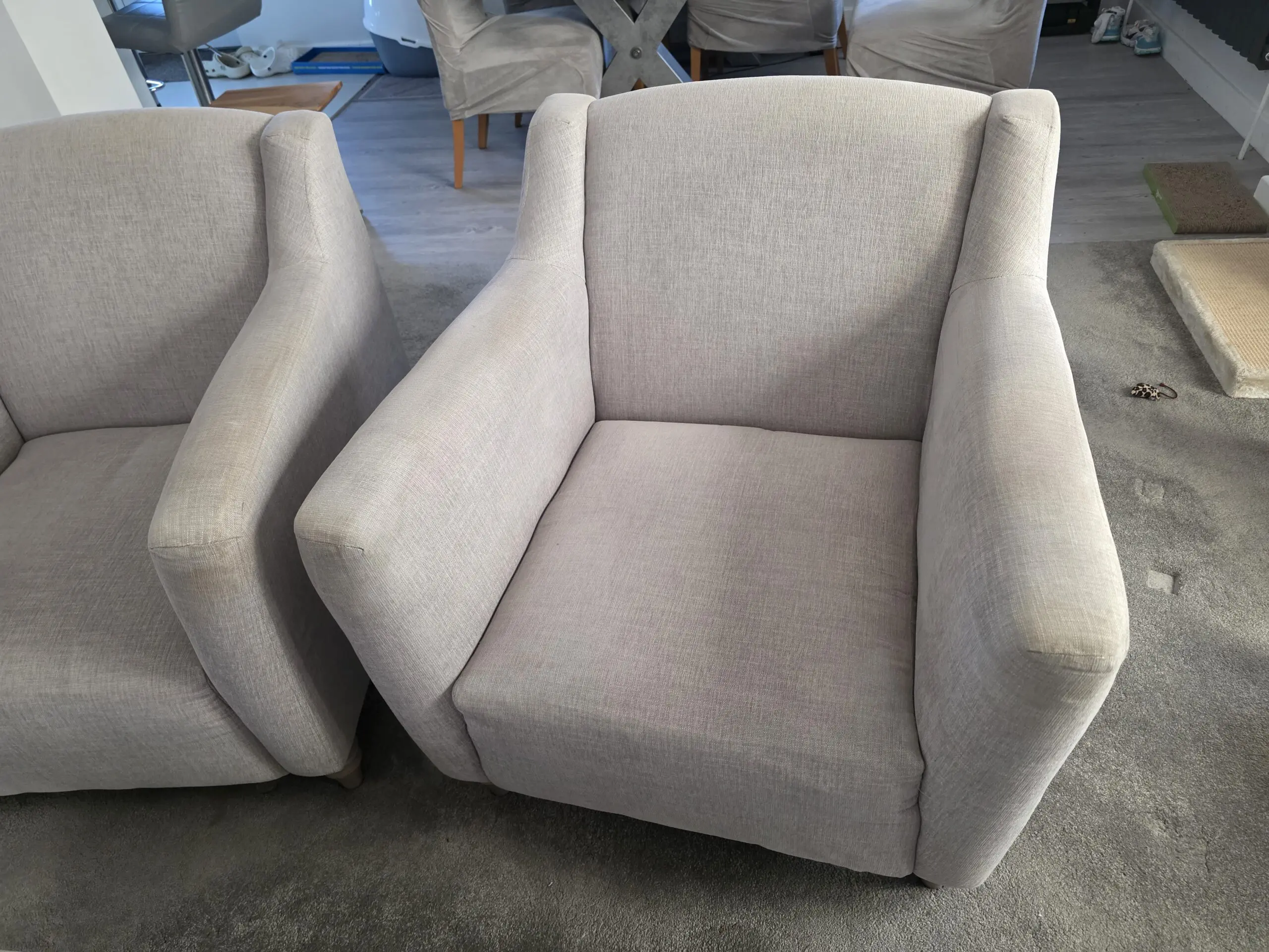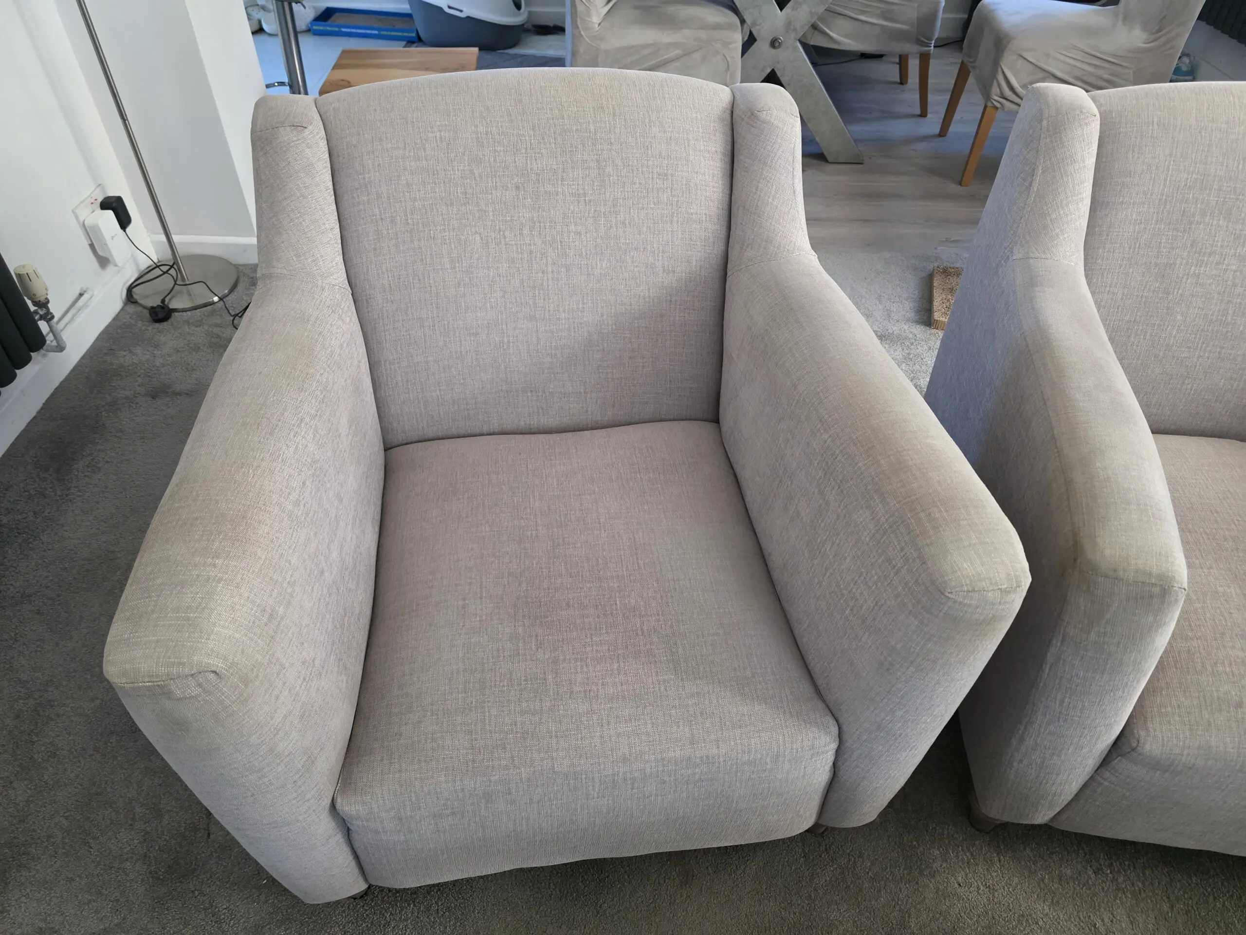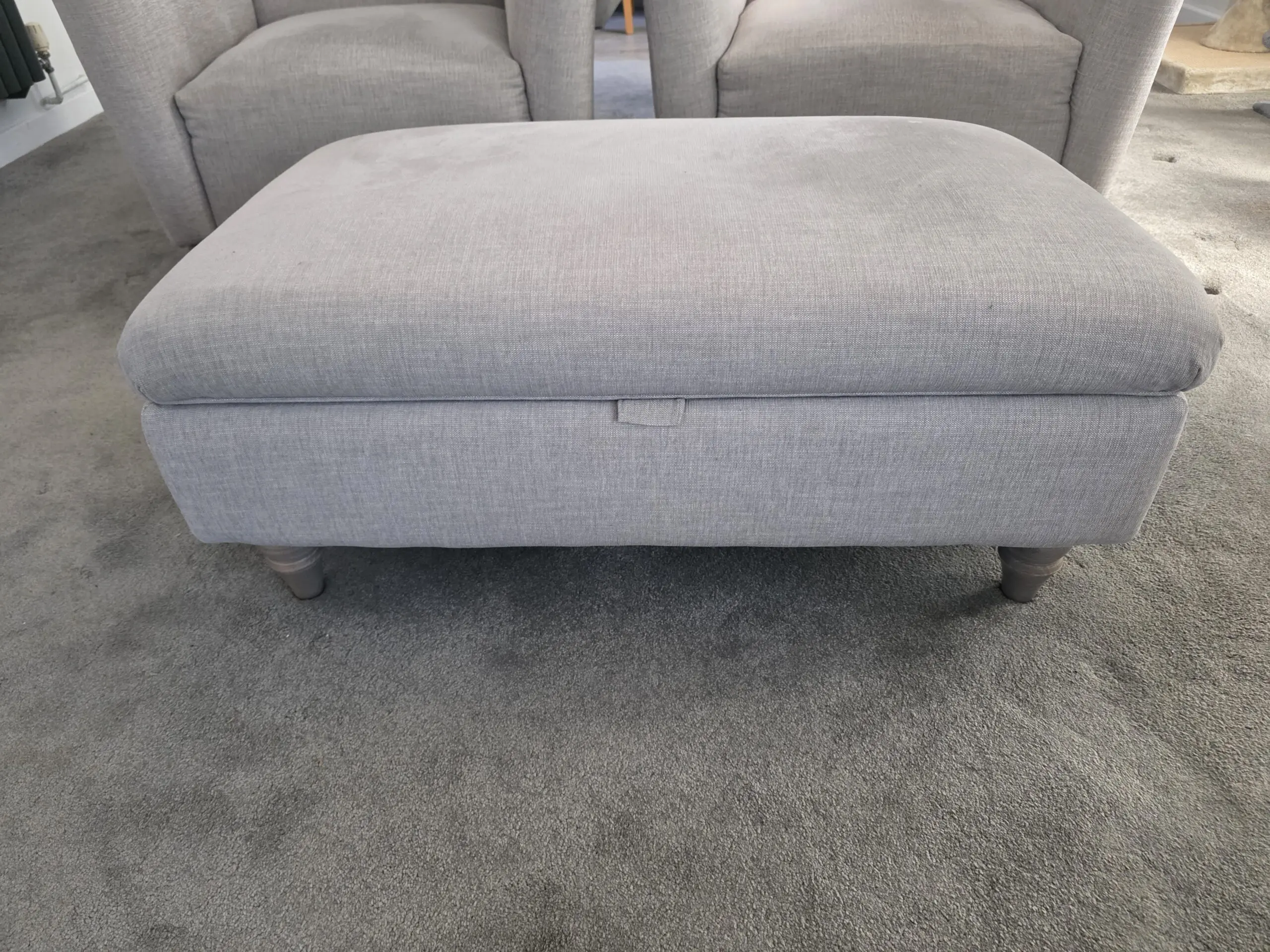 Qty 2 x DFS Grey Claudette Armchairs/Tub Chairs and Qty 1 x DFS Grey Claudette Storage Footstall from the DFS House Beautiful range