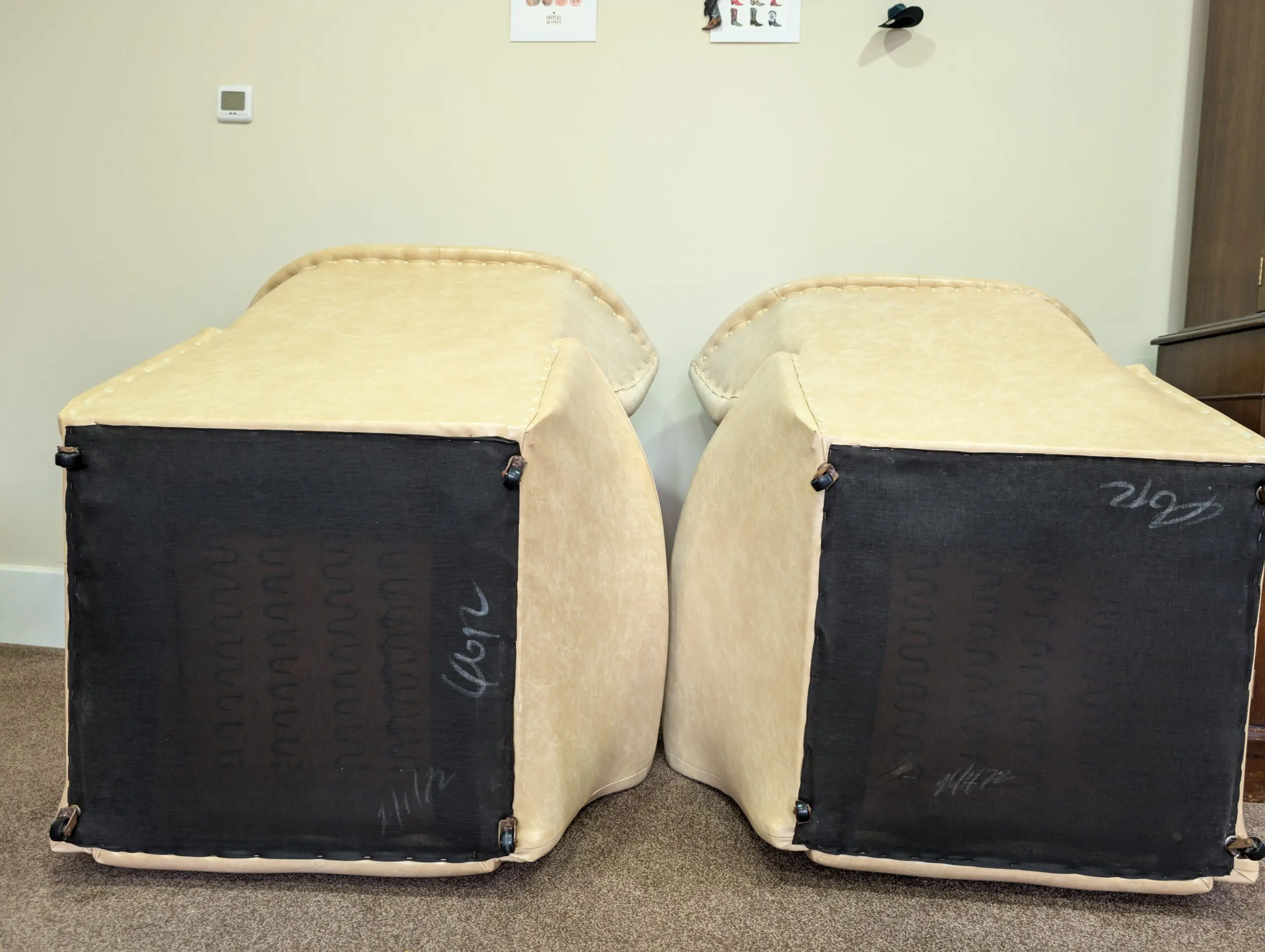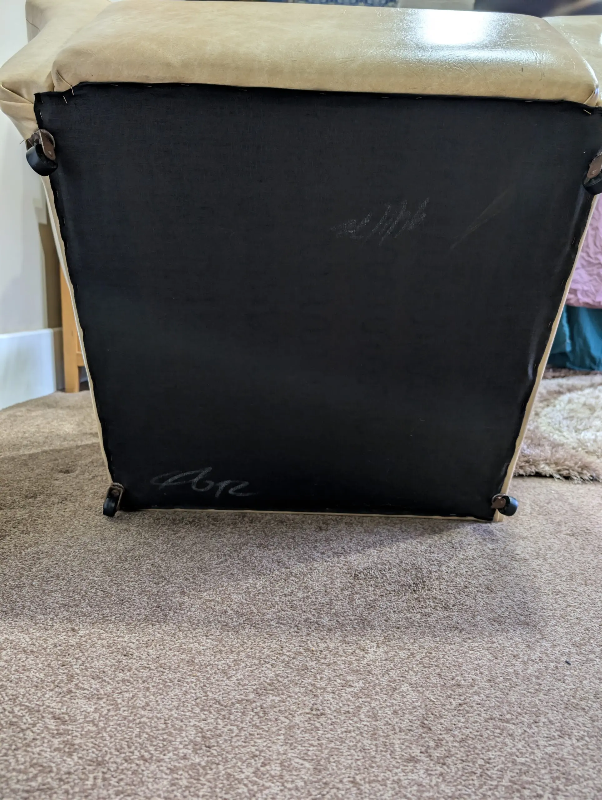 Vinyl in cream with buttons, castors and original cushions. I’ve seen the same in black