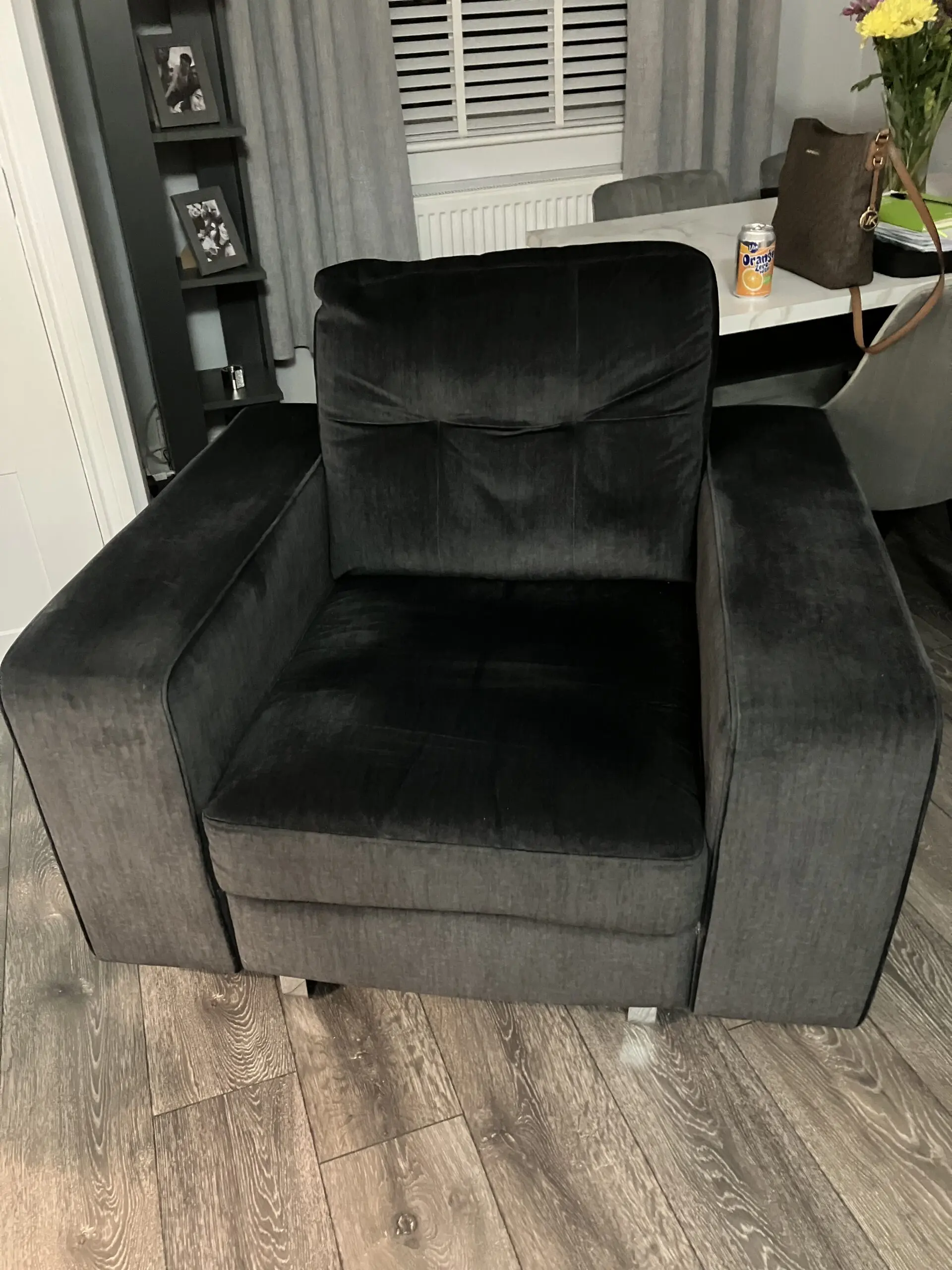Large black velvet chair, used in great condition, super comfy, smoke and pet free home