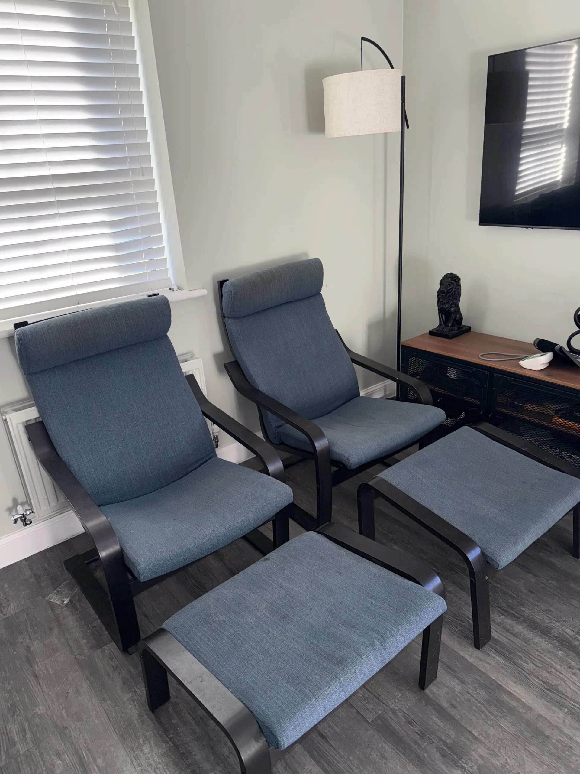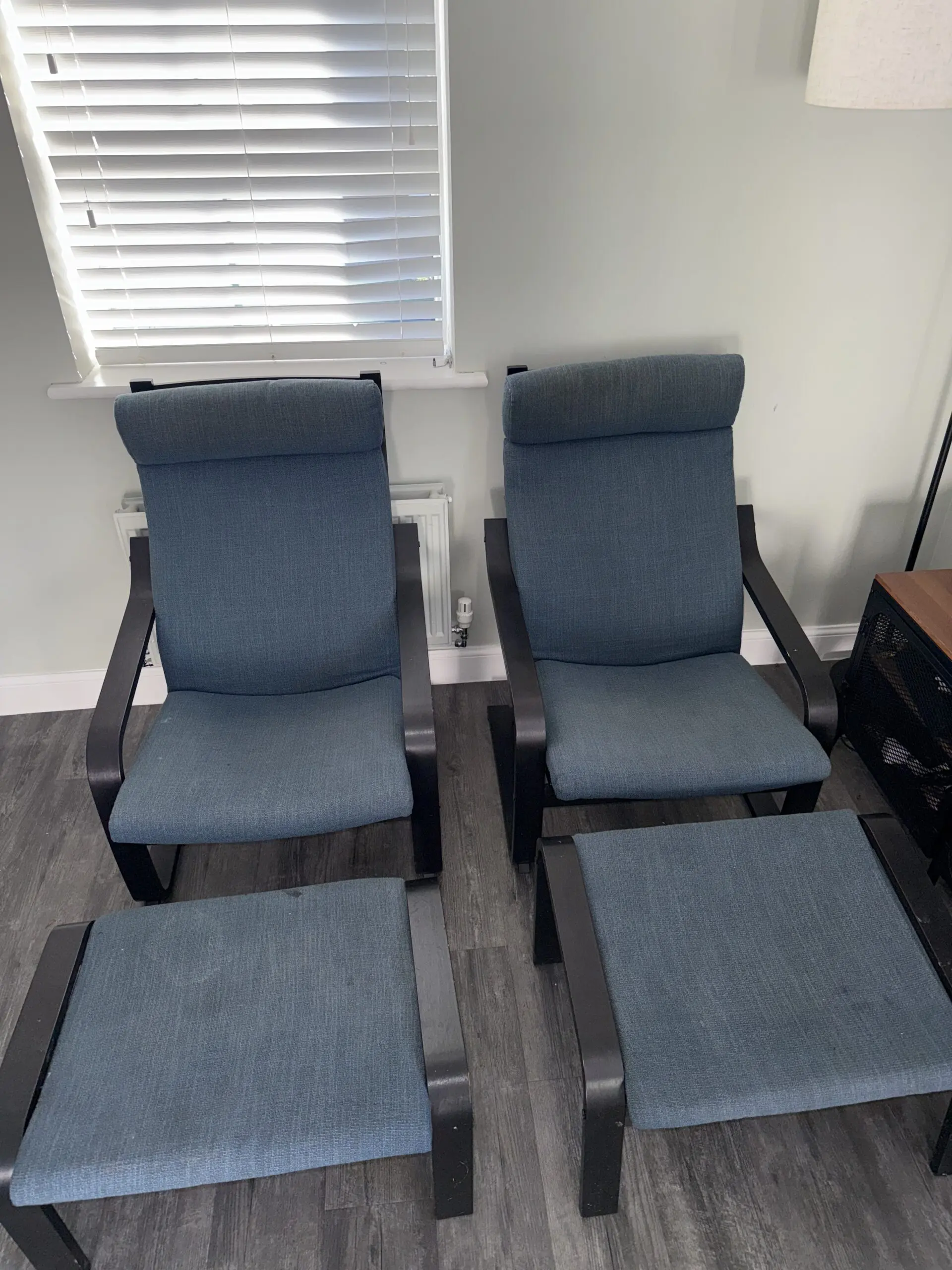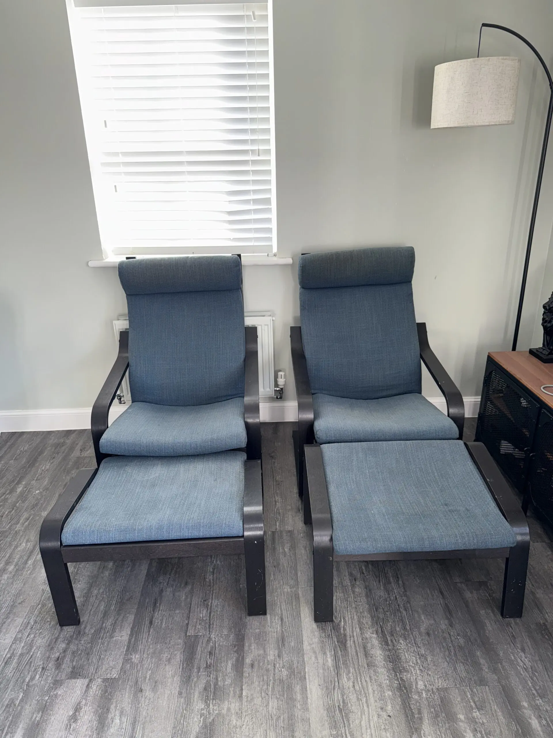 Selling 2 sets of IKEA POÄNG armchairs with matching footstools in black-brown frame and Hillared dark blue cushions.