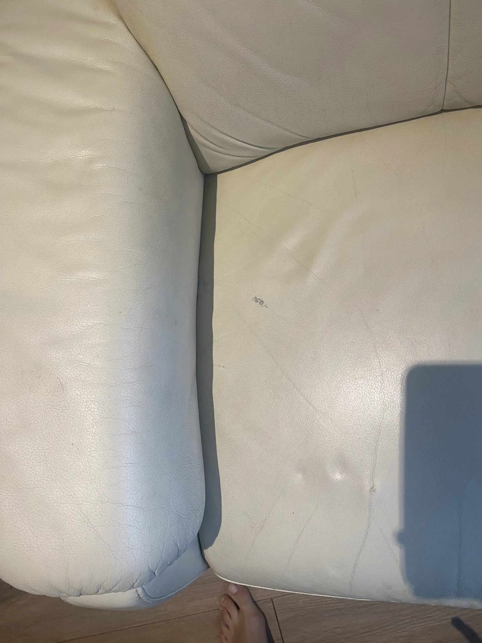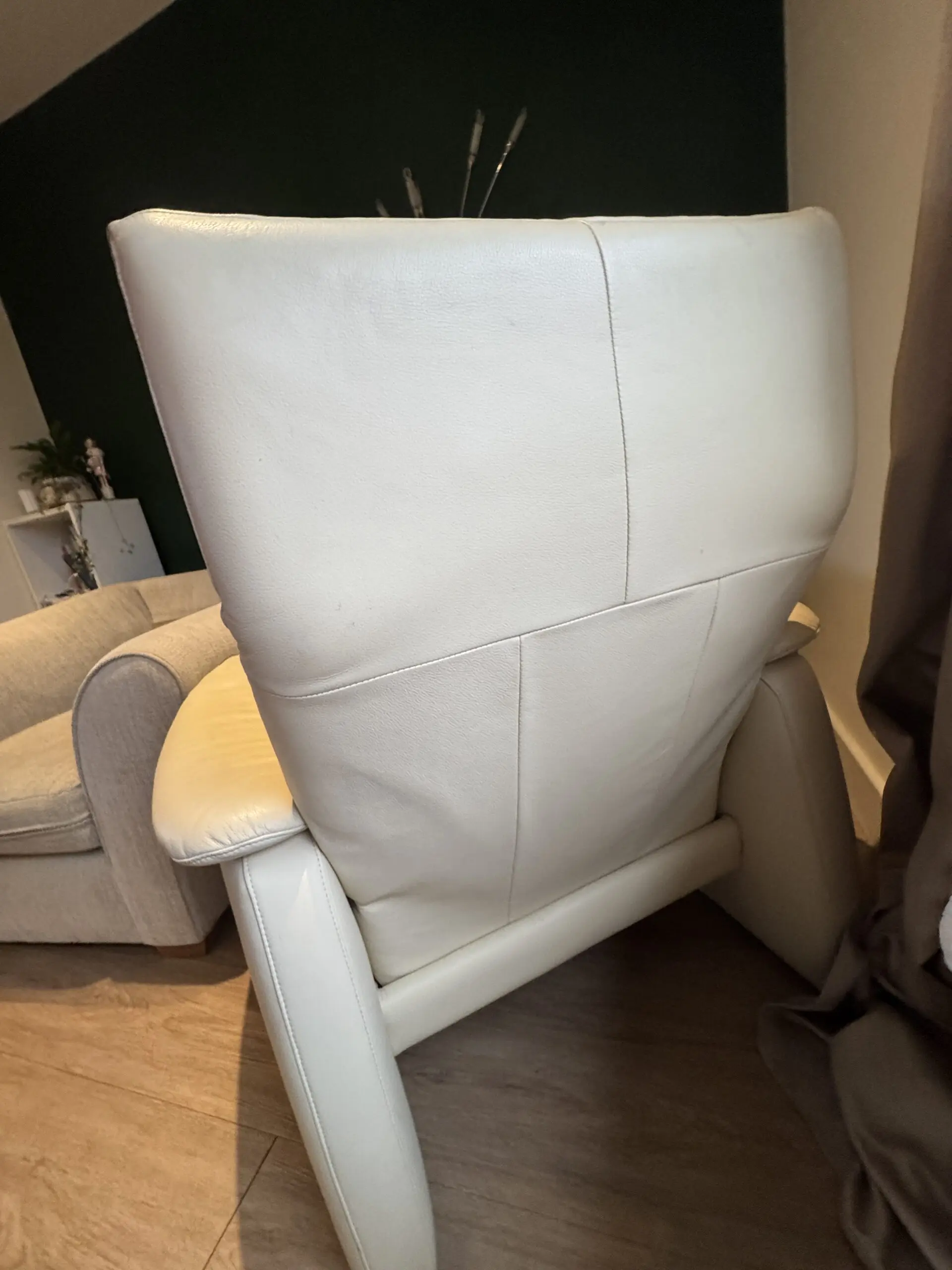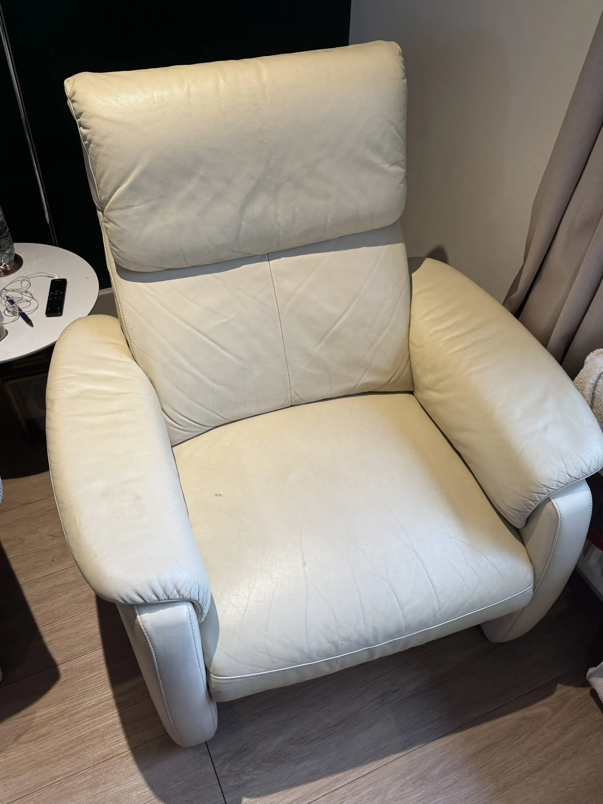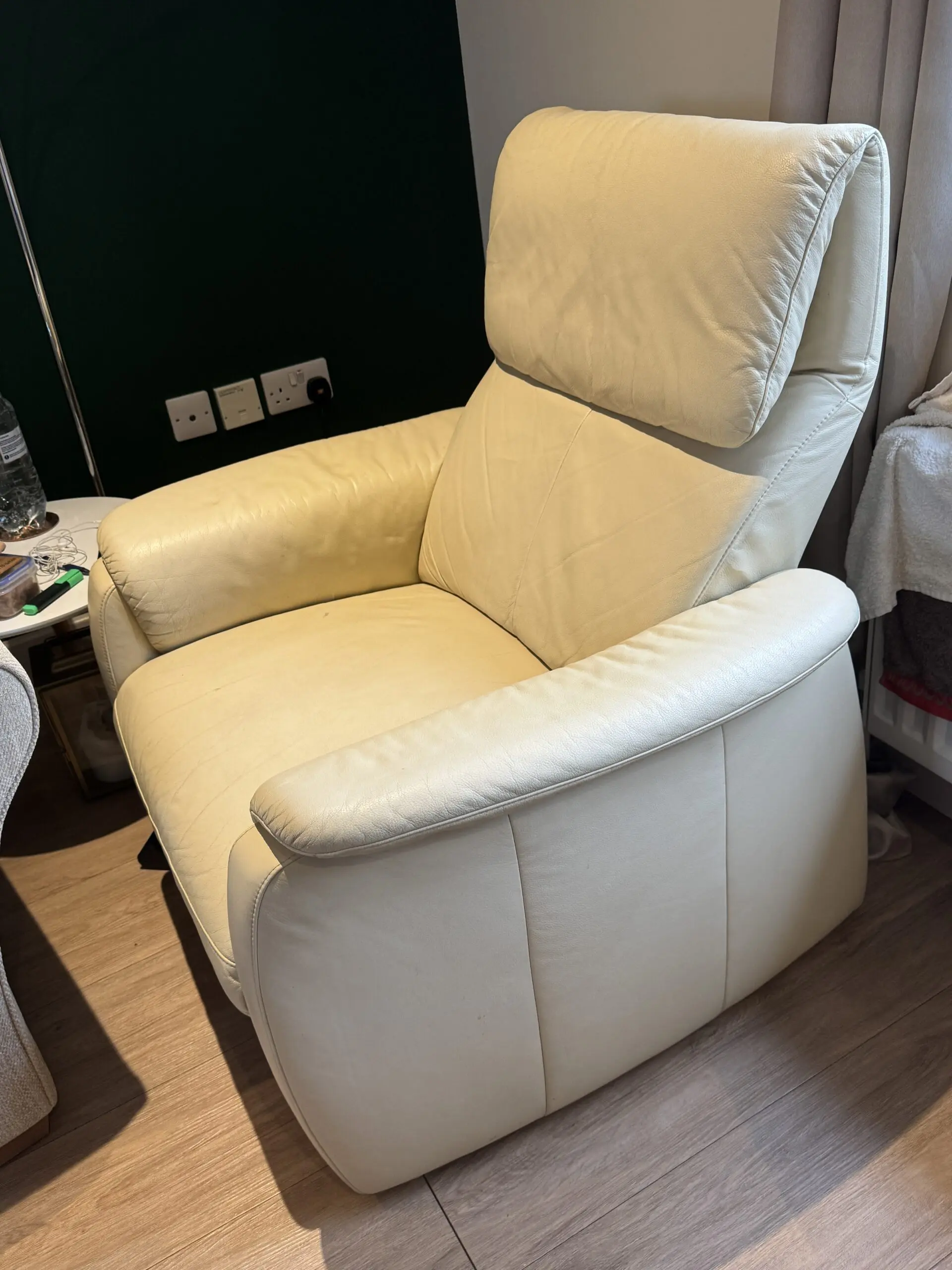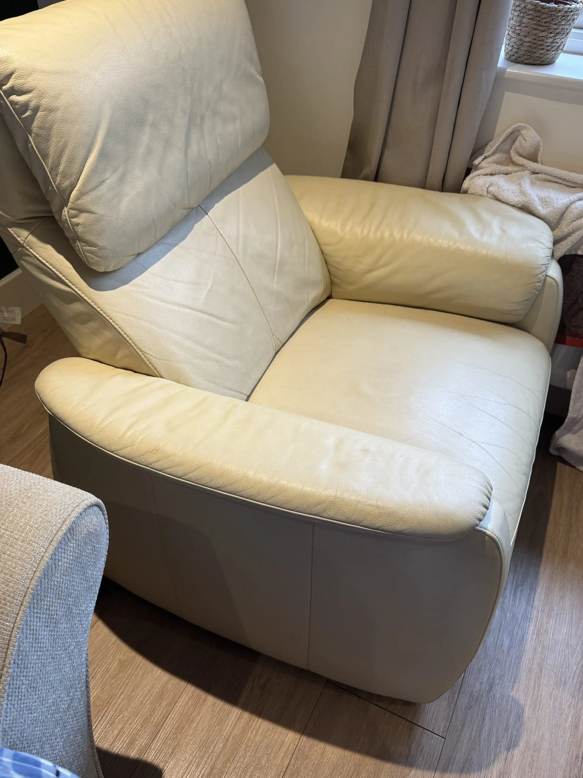 1 beige/oatmeal Comfortable armchair (used for only a year – good condition – no scratches). AND 1 leather Reclining Armchair (fair condition with some scratches and marks as shown in the pictures – used for a year – both from a pet free and smoke free home)