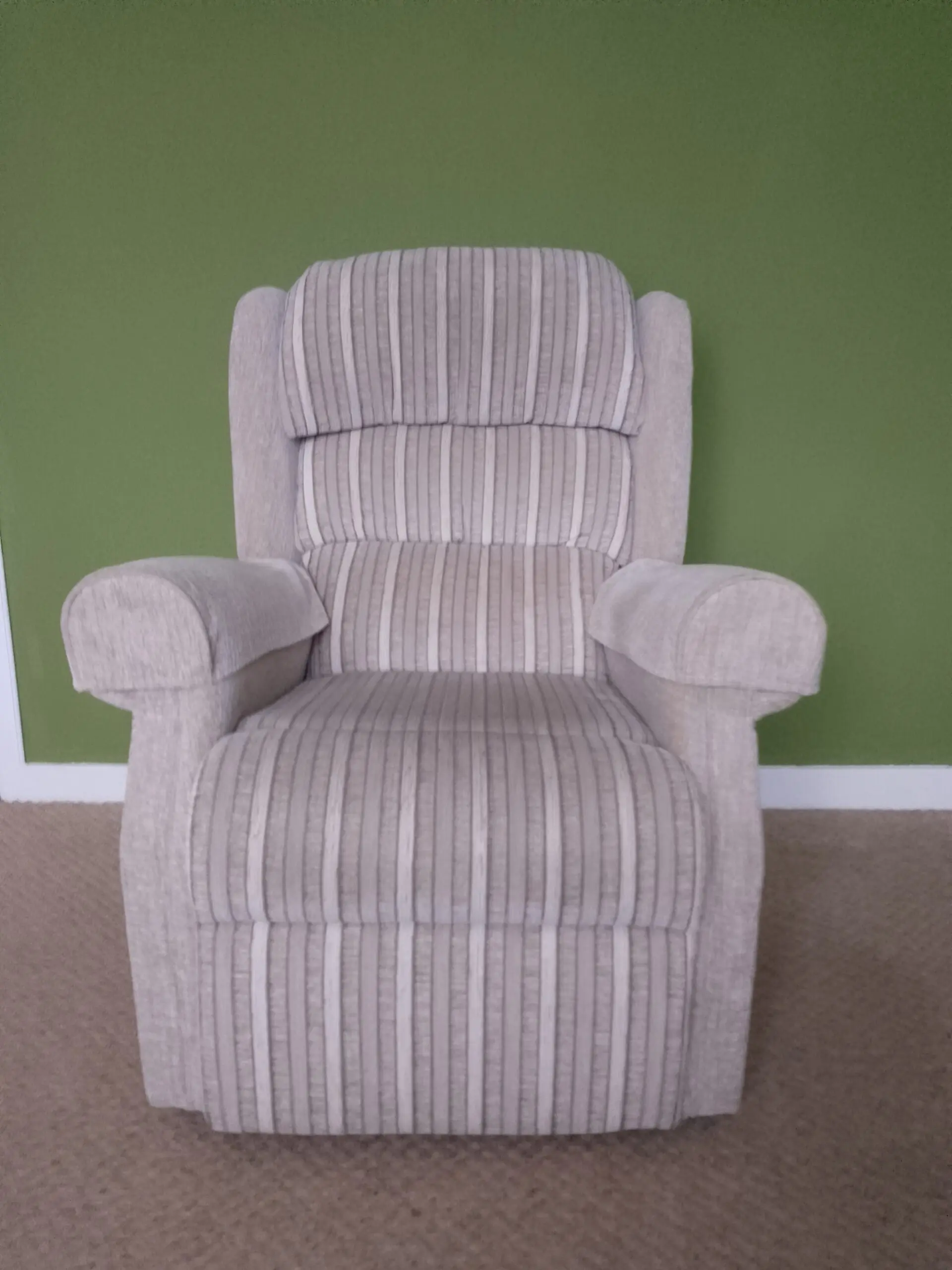 Chair is very comfortable. Has removable protected arm sleeves as an extra. Fabric is plain on the sides/back with stripes going down the middle.