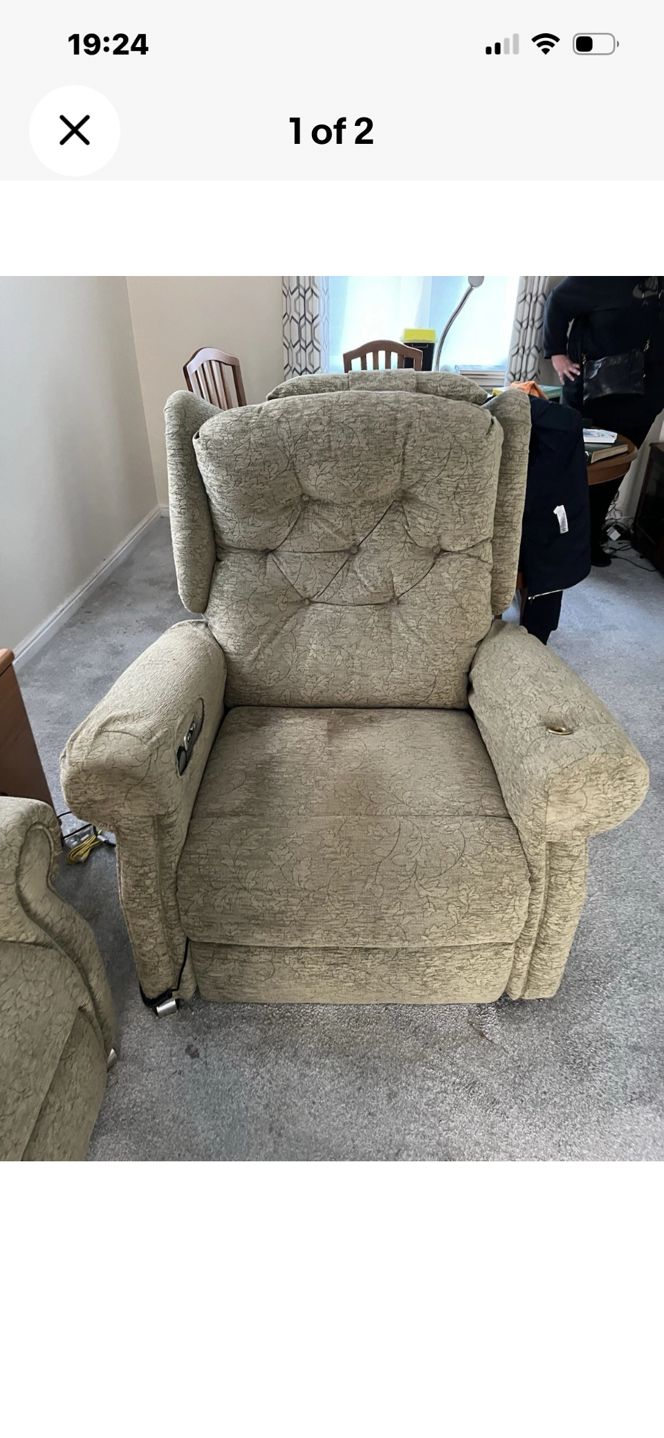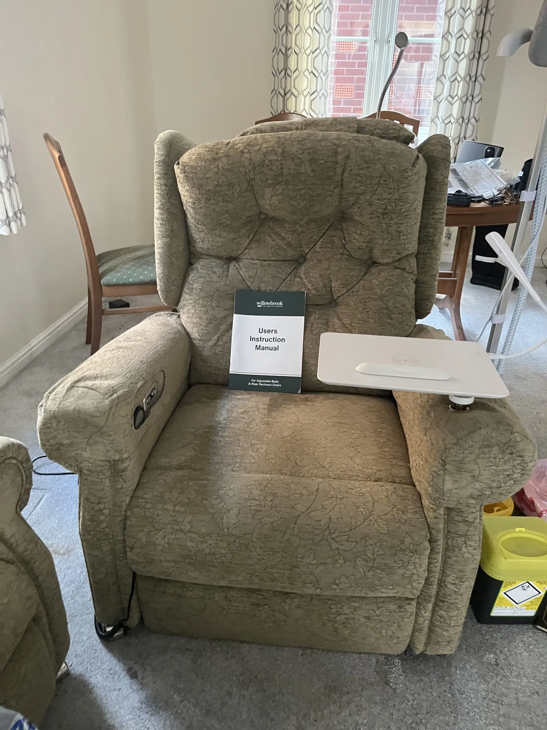 This comfortable electric rise and recline armchair offers exceptional support and convenience for relaxation. The chair features easy-to-use electric controls for smooth reclining and lifting assistance, making it ideal for those with mobility needs. Complete with a handy swing-away side table for drinks and essentials, plus built-in storage compartments. The traditional high-back design provides excellent head and neck support, whilst the generous padding ensures maximum comfort for extended sitting.